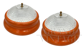 Prix normal 650,00 € - Coppia di plafoniere vintage anni '60 in vetro lavorato e metallo arancionePrix Spécial Prix Spécial 600,00 €