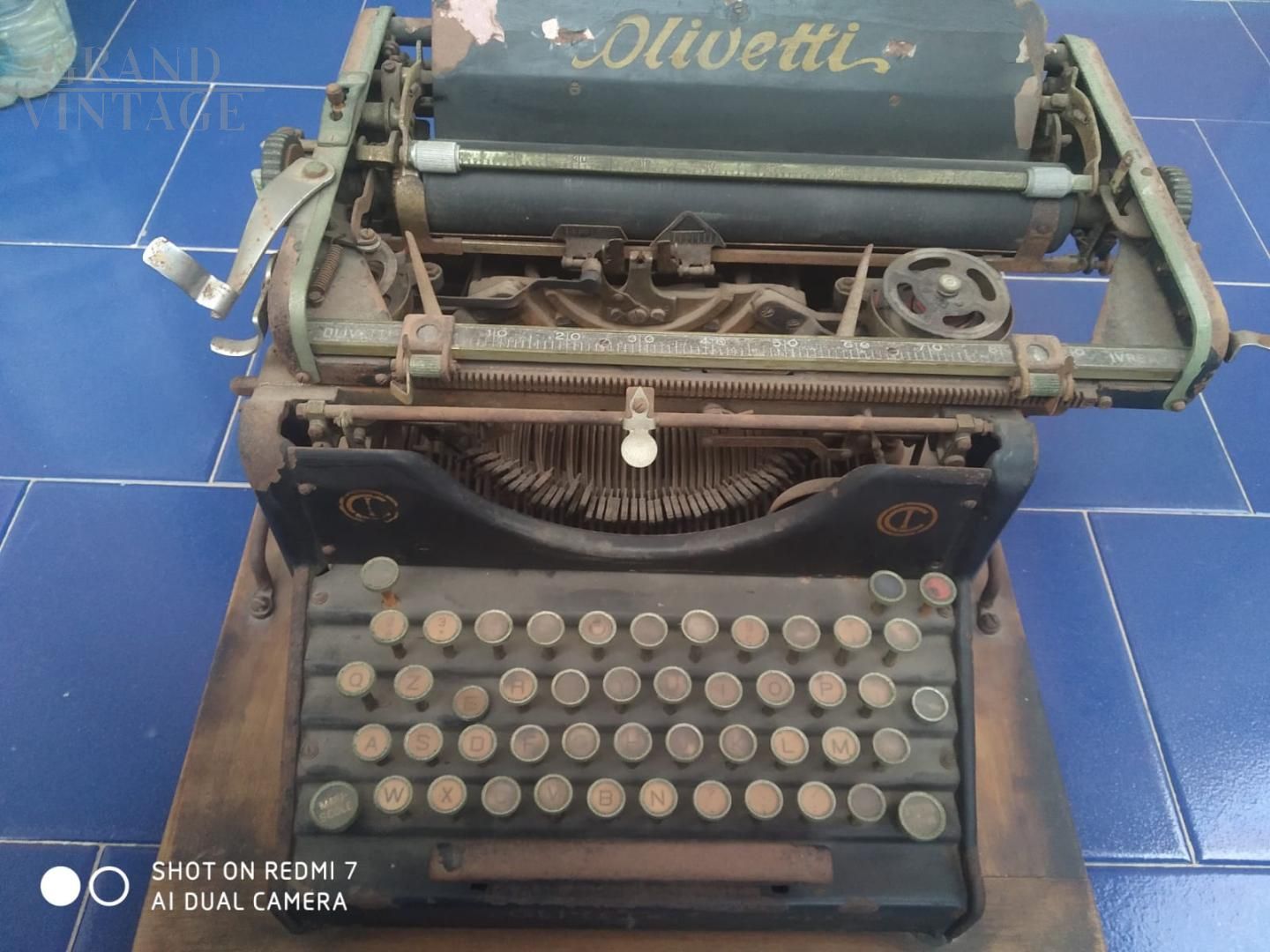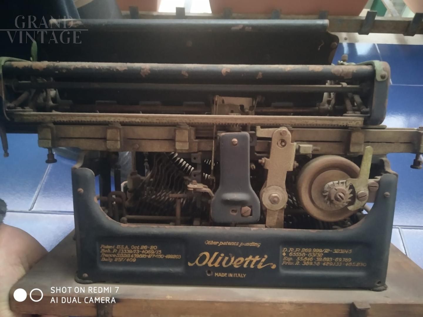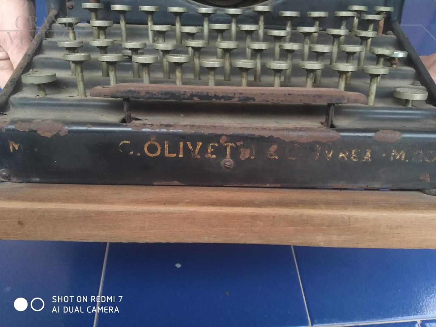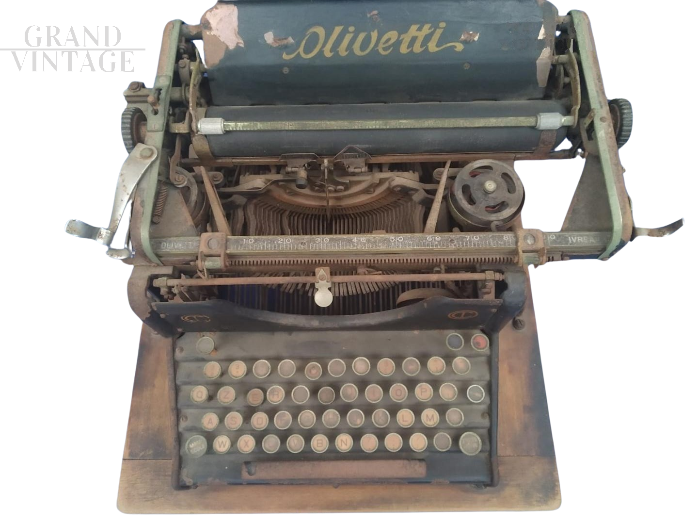 Preziosa macchina da scrivere Olivetti M20 ormai centenaria, con supporto in legno. Da custodire nel suo stato attuale quale incantevole oggetto di antiquariato o, se si preferisce, da restaurare per restituirle l'originale funzionalità ed estetica.