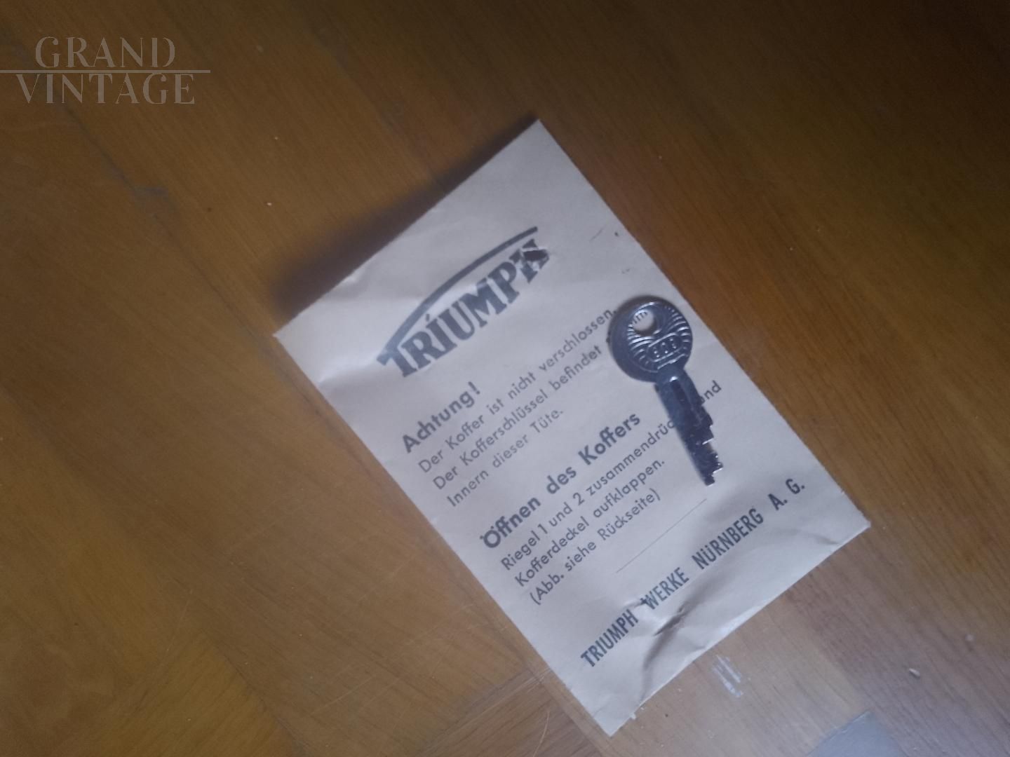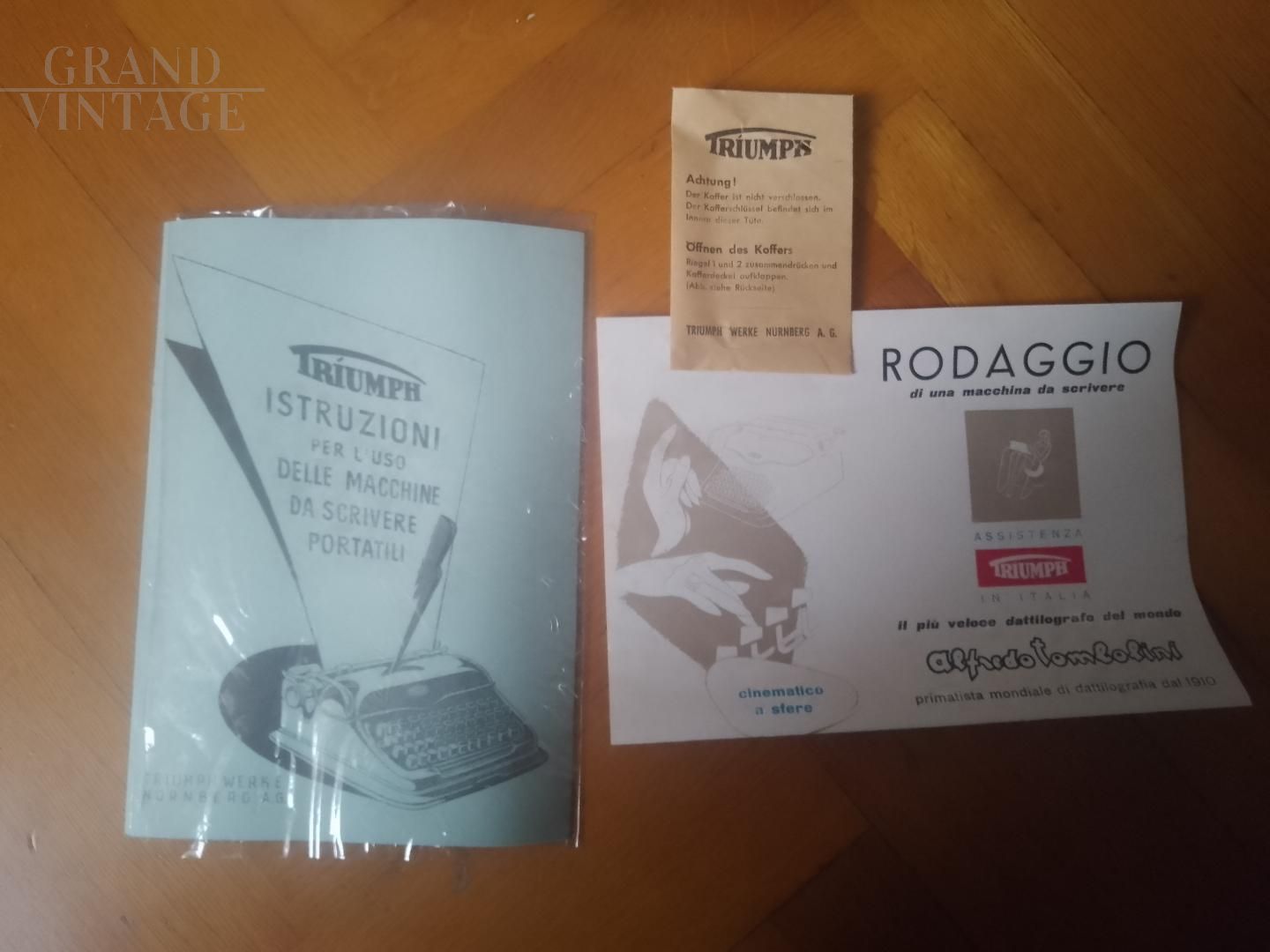 Macchina da scrivere Triumph della fine degli anni '50, mai usata, nella sua custodia di alluminio con istruzioni per l'uso e chiave originale. La macchina è in ottime condizioni e presenta soltanto un segno di ruggine, come da foto.