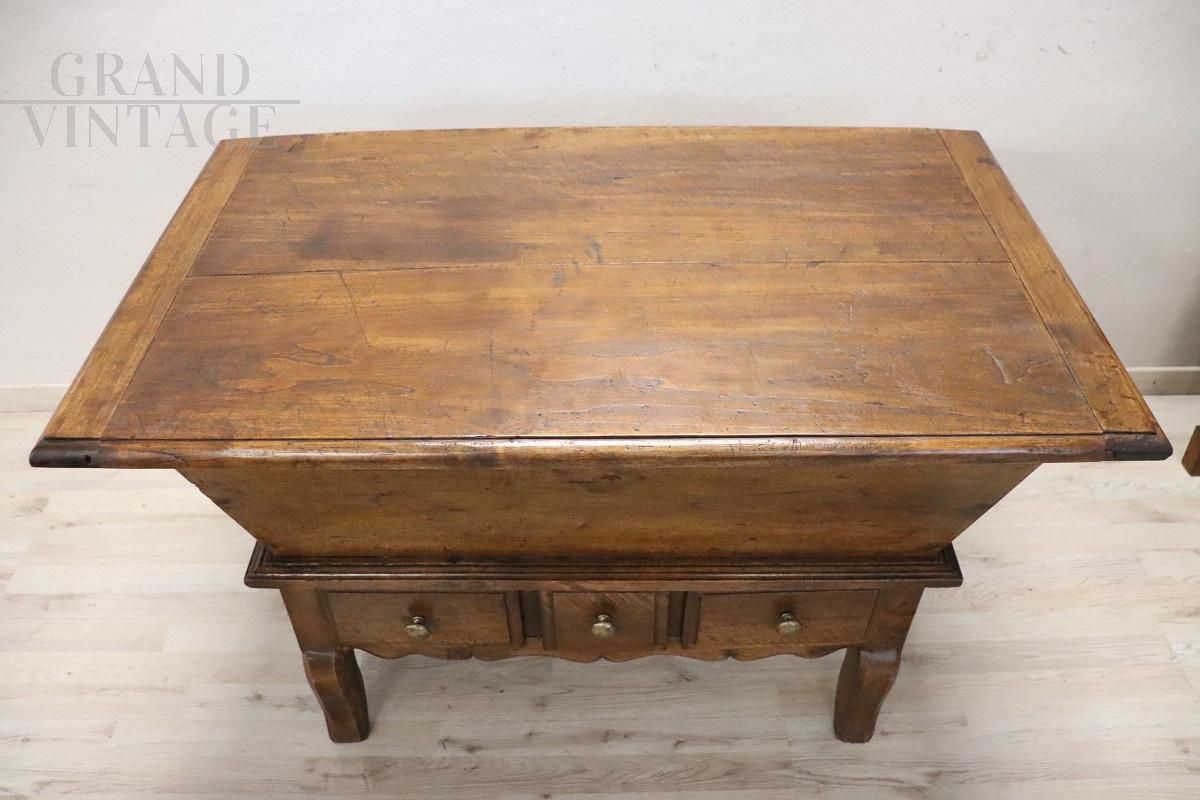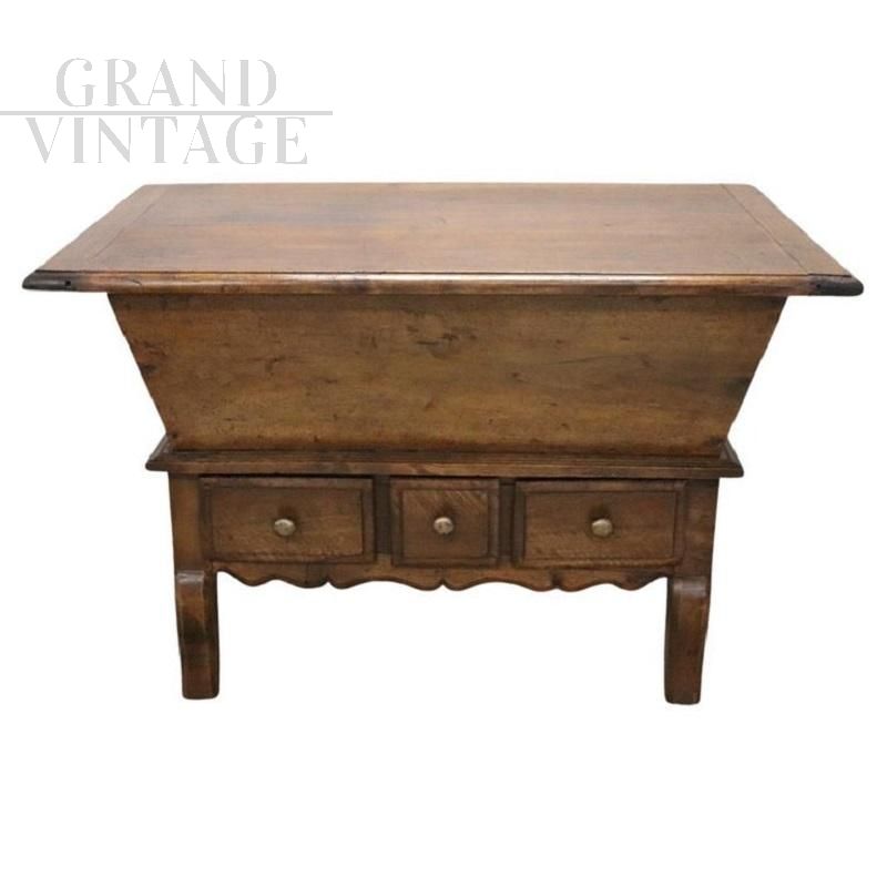 Questa squisita madia antica italiana, realizzata in legno di pioppo massiccio nel XIX secolo, è una testimonianza di semplicità e praticità. Il suo design pulito e lineare, privo di ornamenti eccessivi, la rende un complemento versatile per qualsiasi stile di arredamento. La madia è caratterizzata da un robusto piano in legno che si apre per rivelare un ampio vano interno, perfetto per una varietà di usi. Al di sotto, tre piccoli cassetti consentono di riporre comodamente gli oggetti più piccoli, migliorando la sua funzionalità. la madia è stata accuratamente restaurata per preservare il suo fascino originale, conservando i caratteristici segni del tempo. Prezzo trattabile.