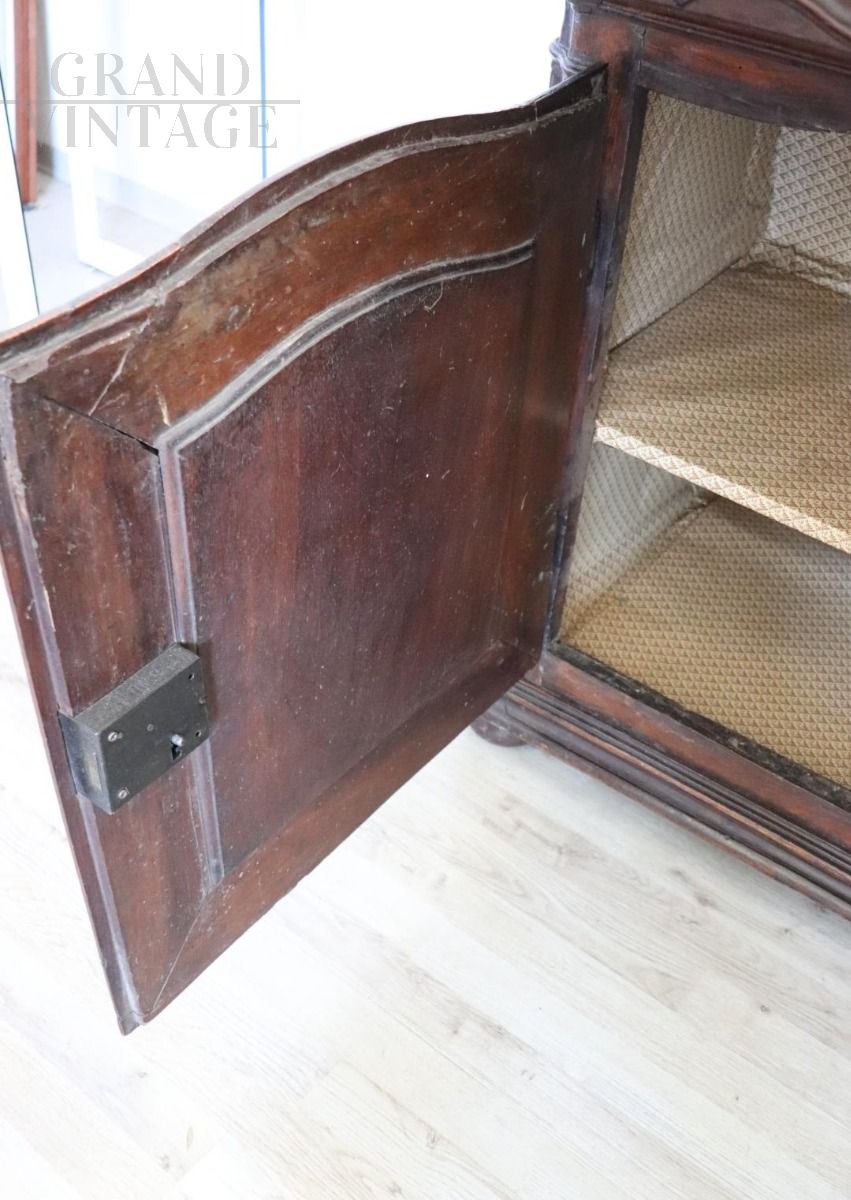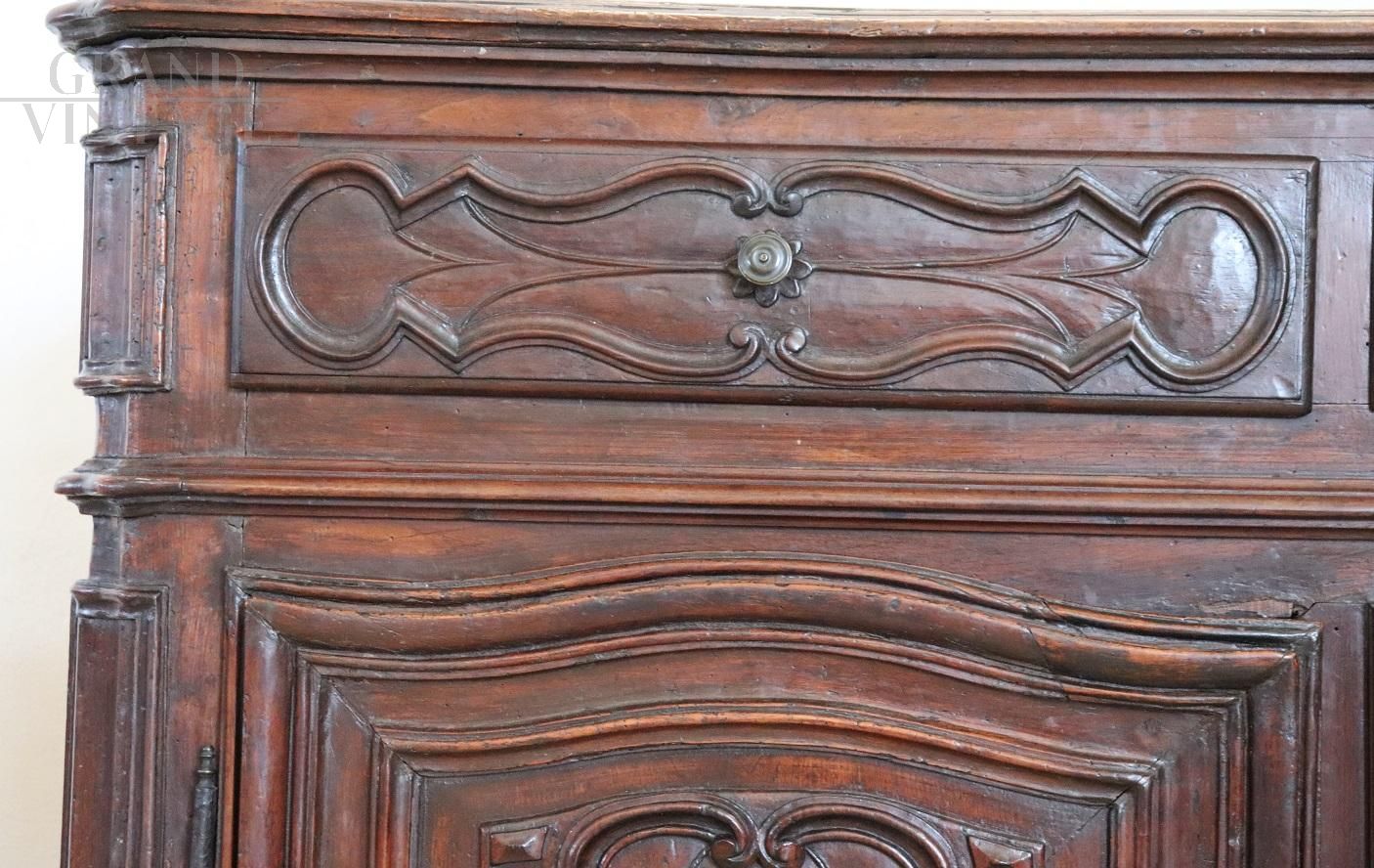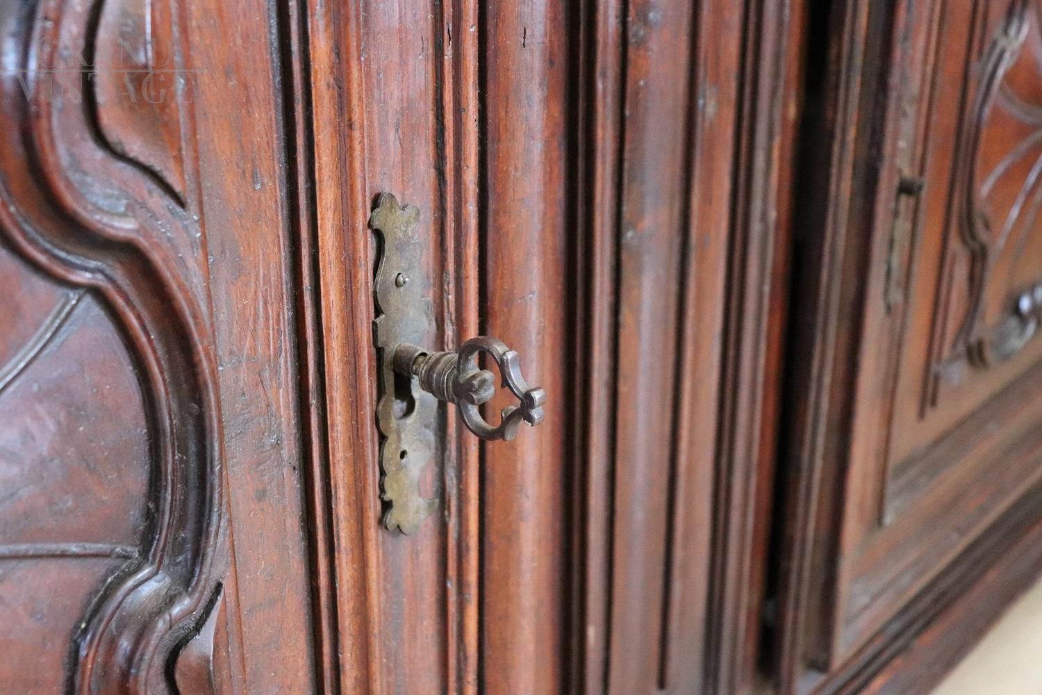 Importante credenza piattaia barocca antica di epoca Luigi XIV, manifattura piemontese del XVII secolo. La credenza è realizzata in noce massello, nella parte bassa presenta ante finemente decorate ad intaglio. La stessa decorazione viene ripetuta nei due fianchi. La parte alta a piattaia è dotata anche di piccoli cassetti. Arredo spettacolare di alta epoca, bellissima patina del legno di noce, buone condizioni lignee generali, presenta alcuni naturali segni di usura a livello di finitura e nella carta di foderatura interna. Ottimo prezzo trattabile.