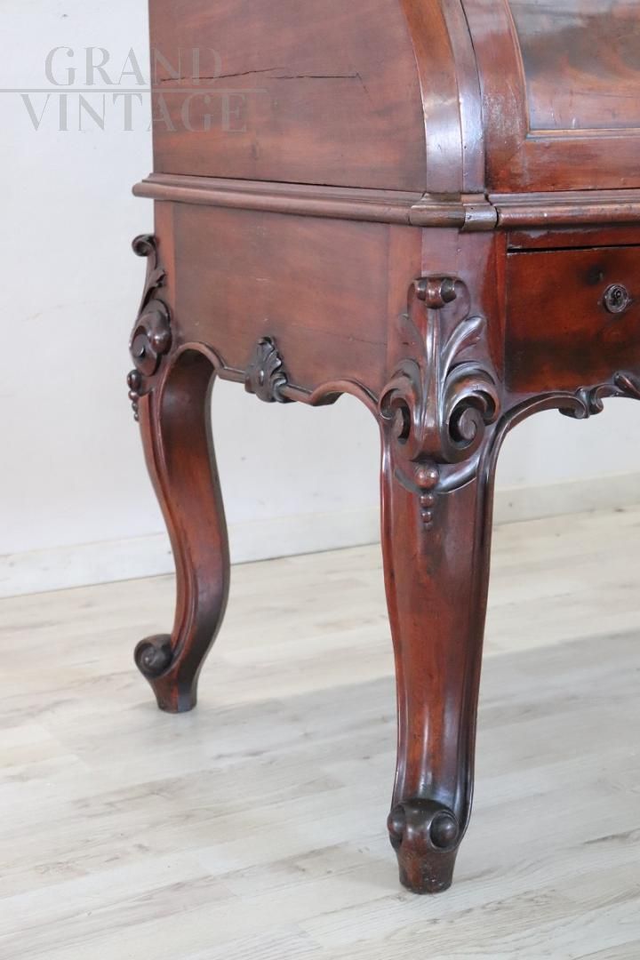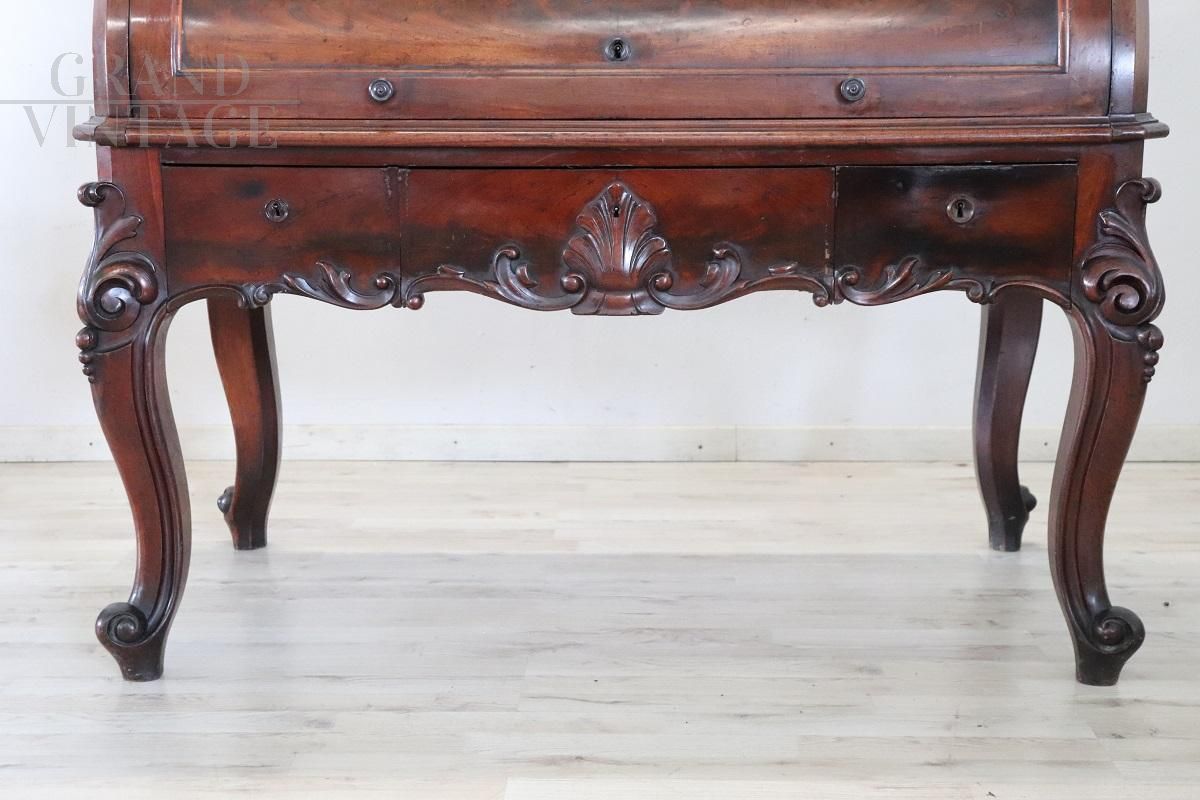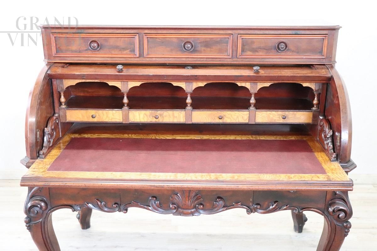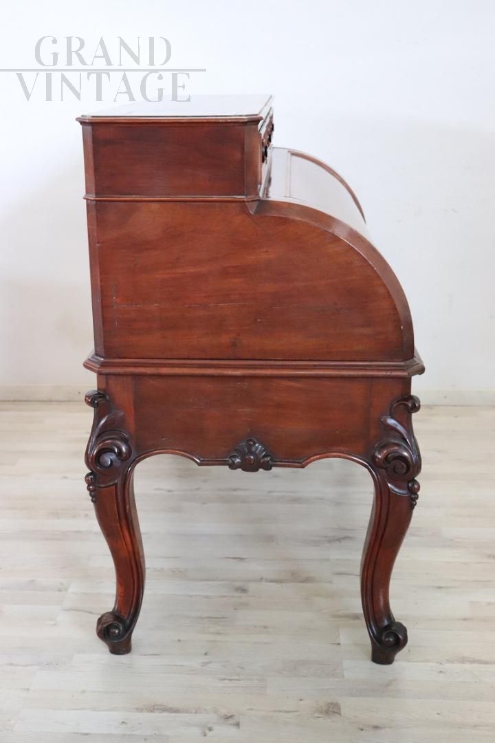 Vi presentiamo questa maestosa scrivania italiana del XIX secolo. Una scrivania estremamente particolare che può essere discreta e utilizzata in diversi ambienti grazie al suo design unico. Lo scrittoio è realizzato in pregiato legno di noce, la sua linea è fluida, con gambe mosse e finemente intagliate con decorazioni a ricciolo e a voluta che danno un fantastico effetto di leggerezza. La sua caratteristica più particolare è il piano di scrittura che si scopre solo quando si apre la parte anteriore con un semplice meccanismo a rullo. Quando il piano è aperto si ha a disposizione un pratico ed elegante supporto per la scrittura o la consultazione di documenti. Numerosi cassetti a disposizione interni e esterni. Progettata anche per centro stanza. altezza piano scrittura cm 72,5