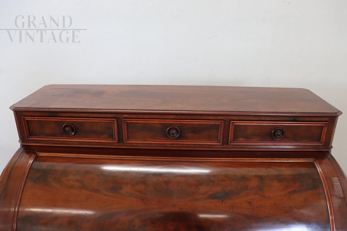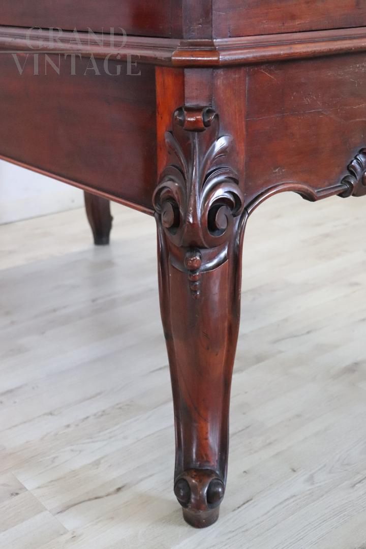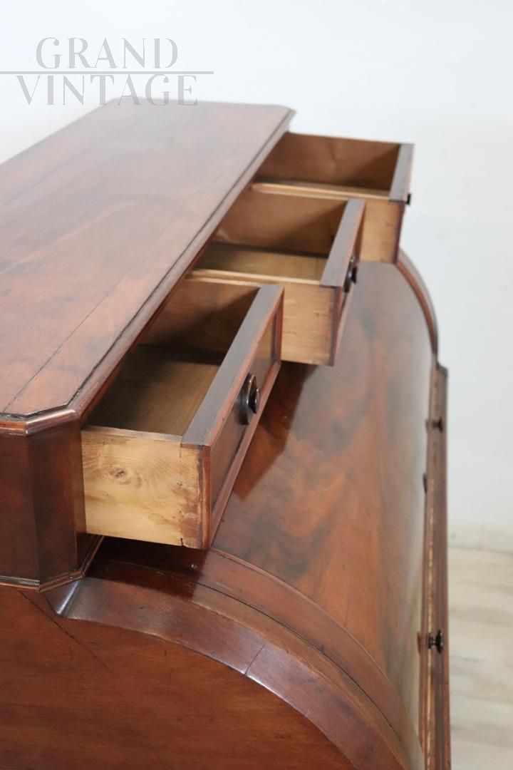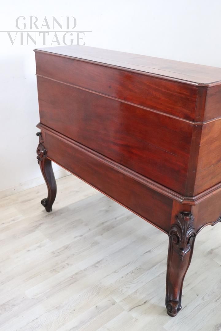 Vi presentiamo questa maestosa scrivania italiana del XIX secolo. Una scrivania estremamente particolare che può essere discreta e utilizzata in diversi ambienti grazie al suo design unico. Lo scrittoio è realizzato in pregiato legno di noce, la sua linea è fluida, con gambe mosse e finemente intagliate con decorazioni a ricciolo e a voluta che danno un fantastico effetto di leggerezza. La sua caratteristica più particolare è il piano di scrittura che si scopre solo quando si apre la parte anteriore con un semplice meccanismo a rullo. Quando il piano è aperto si ha a disposizione un pratico ed elegante supporto per la scrittura o la consultazione di documenti. Numerosi cassetti a disposizione interni e esterni. Progettata anche per centro stanza. altezza piano scrittura cm 72,5