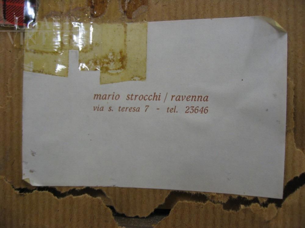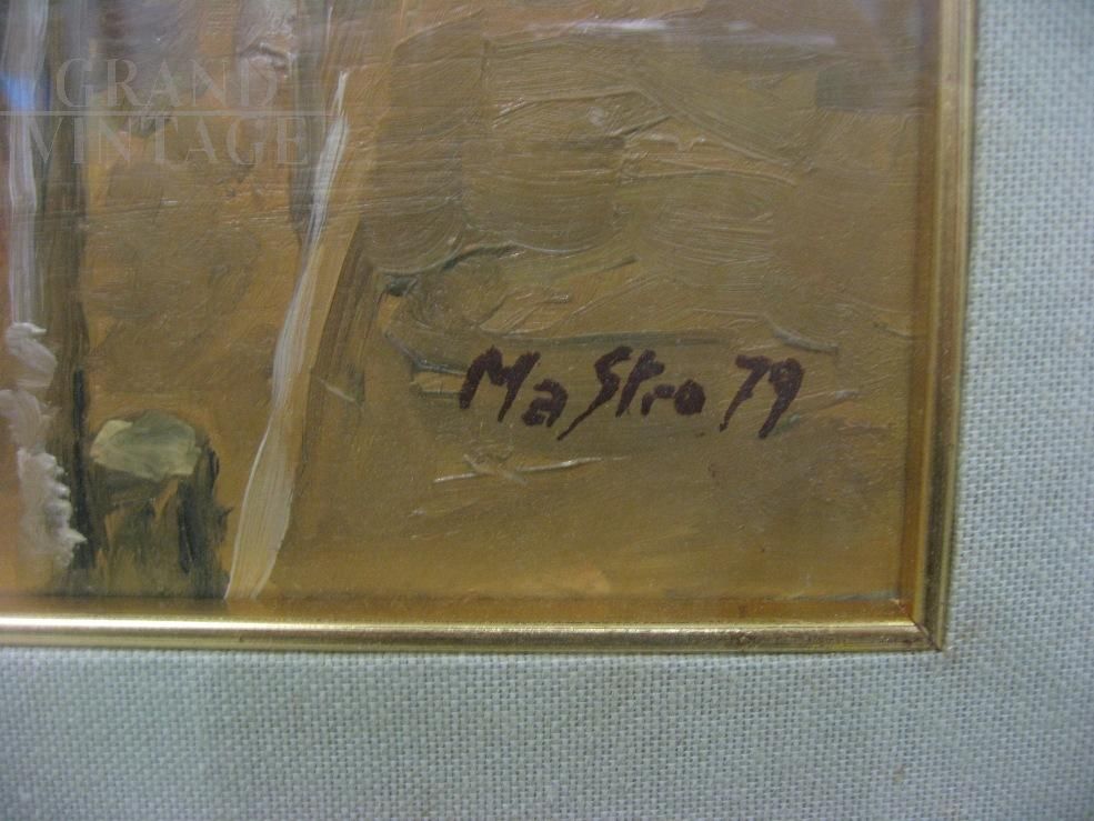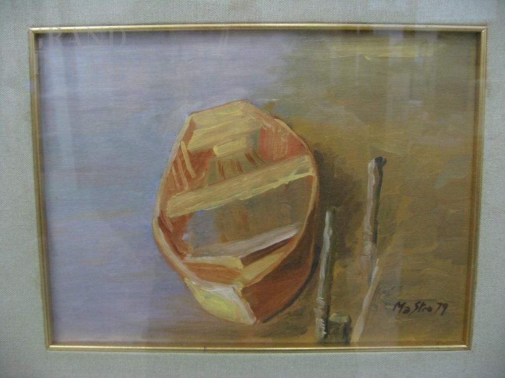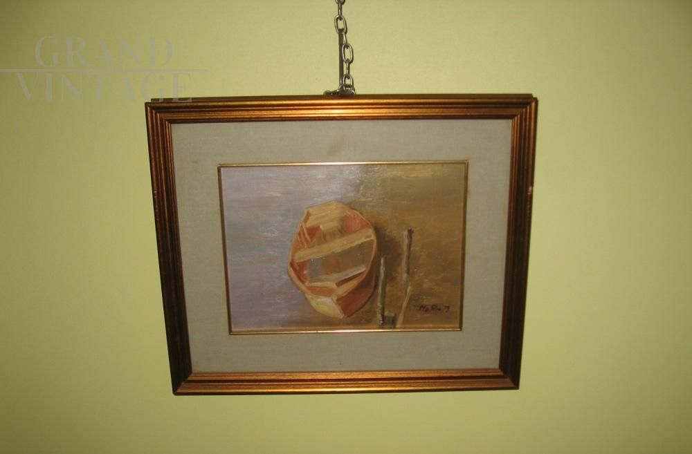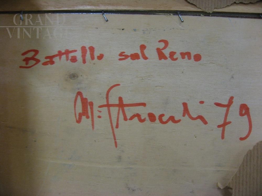 Dipinto di Mario Strocchi con titolo Battello sul Reno, olio su compensato firmato e datato 1979.