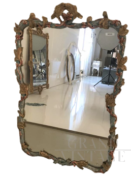 Specchiera intagliata a mano in stile antico e dipinta con colori policromi pastello