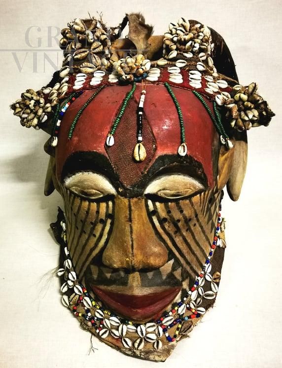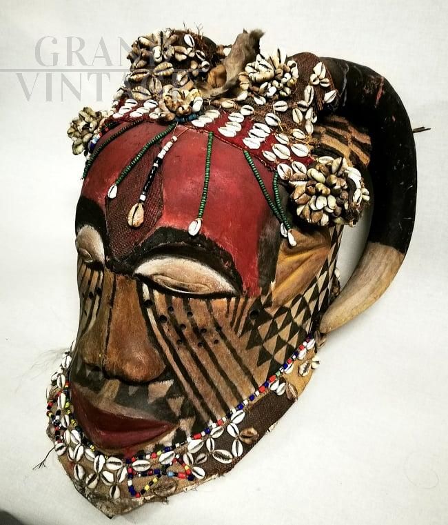 Rara maschera africana in legno con corna, applicazioni di perline, conchiglie. Zaire (oggi Repubblica Democratica del Congo), inizio '900.