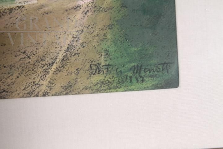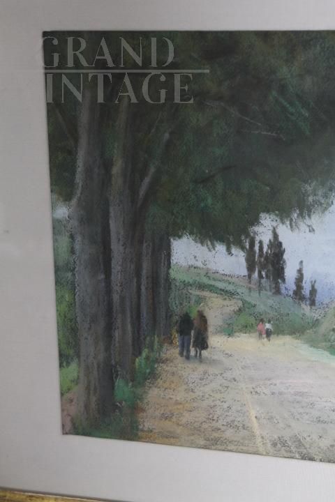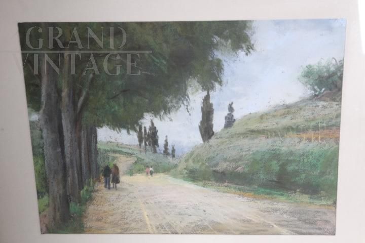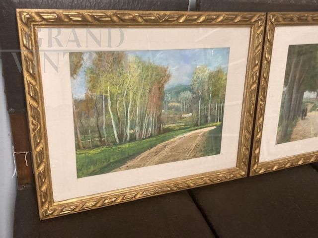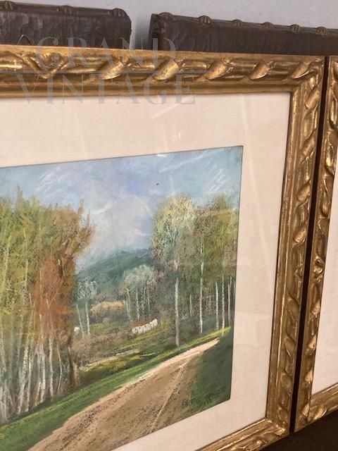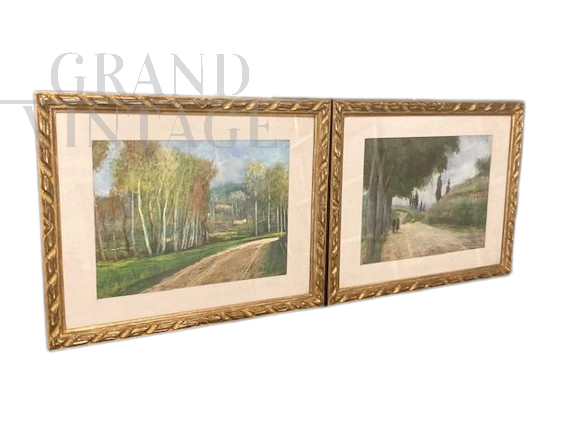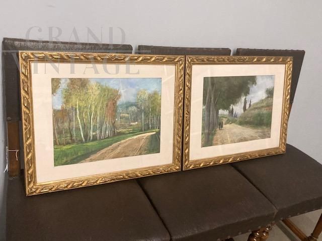 Coppia di dipinti dell‘artista Pertici Menotti (1904 – 1966 Montopoli Val D’ Arno) raffiguranti sentieri di strade Toscane, realizzati con la tecnica del pastello. Firmati in basso a destra 1937 Pertici Menotti. Ottimo stato conservazione, in cornici dorate e vetri protettivi.