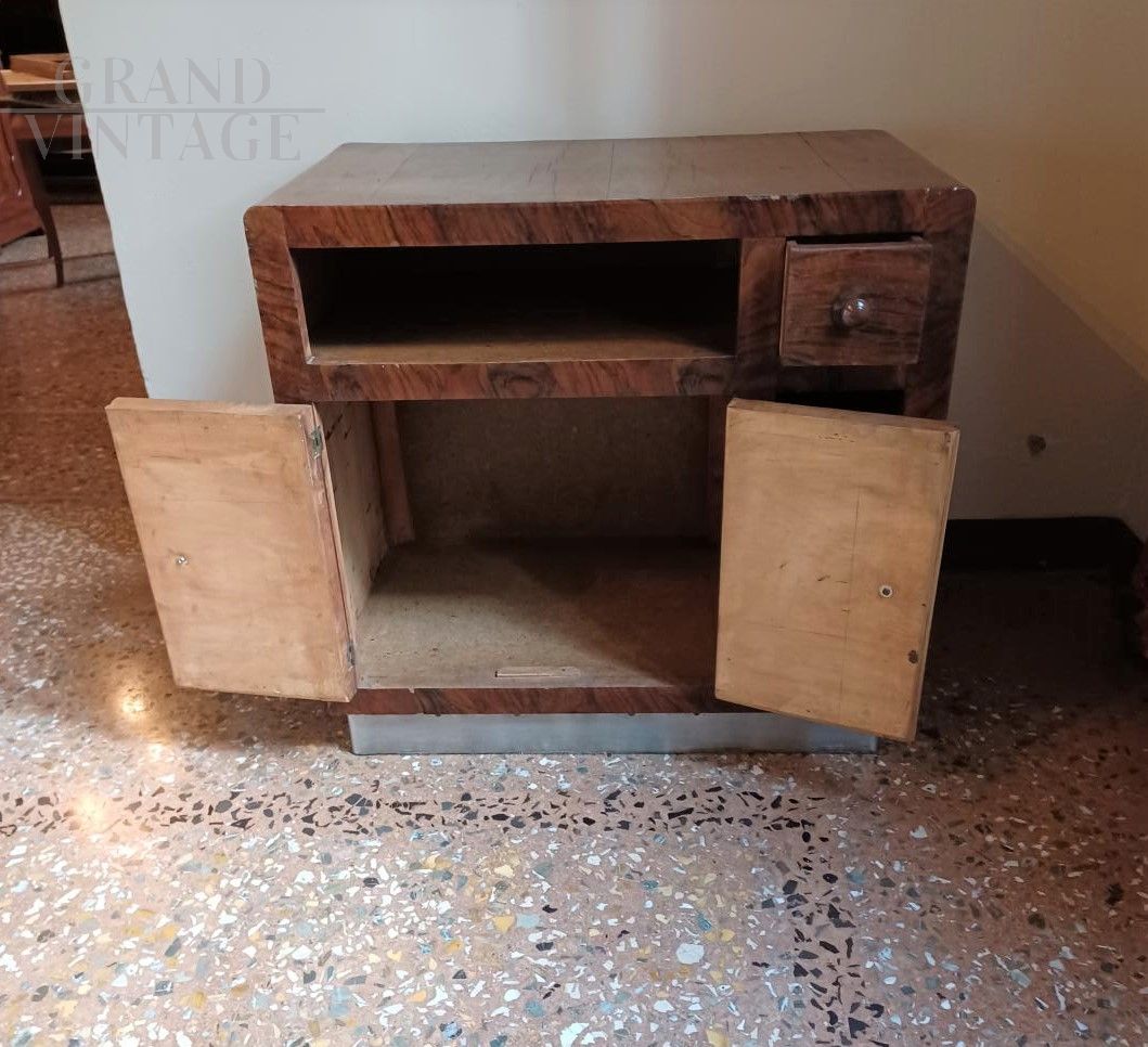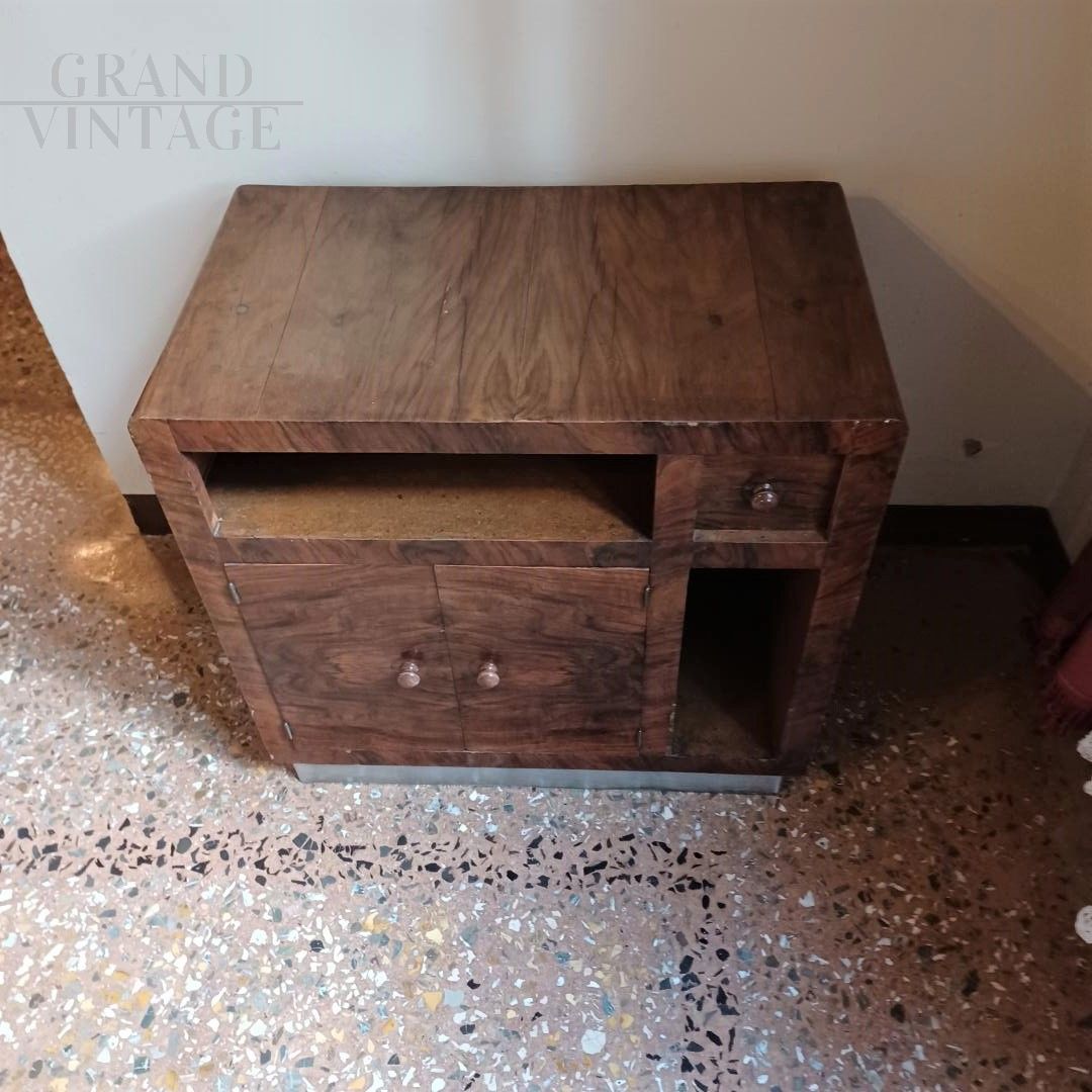 Bel mobile credenza art déco impiallacciato in radica, con due ante, un piccolo cassetto e due vani a giorno. Il mobiletto è perfetto da utilizzare anche come mobile porta TV. Il mobile è in condizioni originali, presenta i naturali segni del tempo, visibili in foto.
