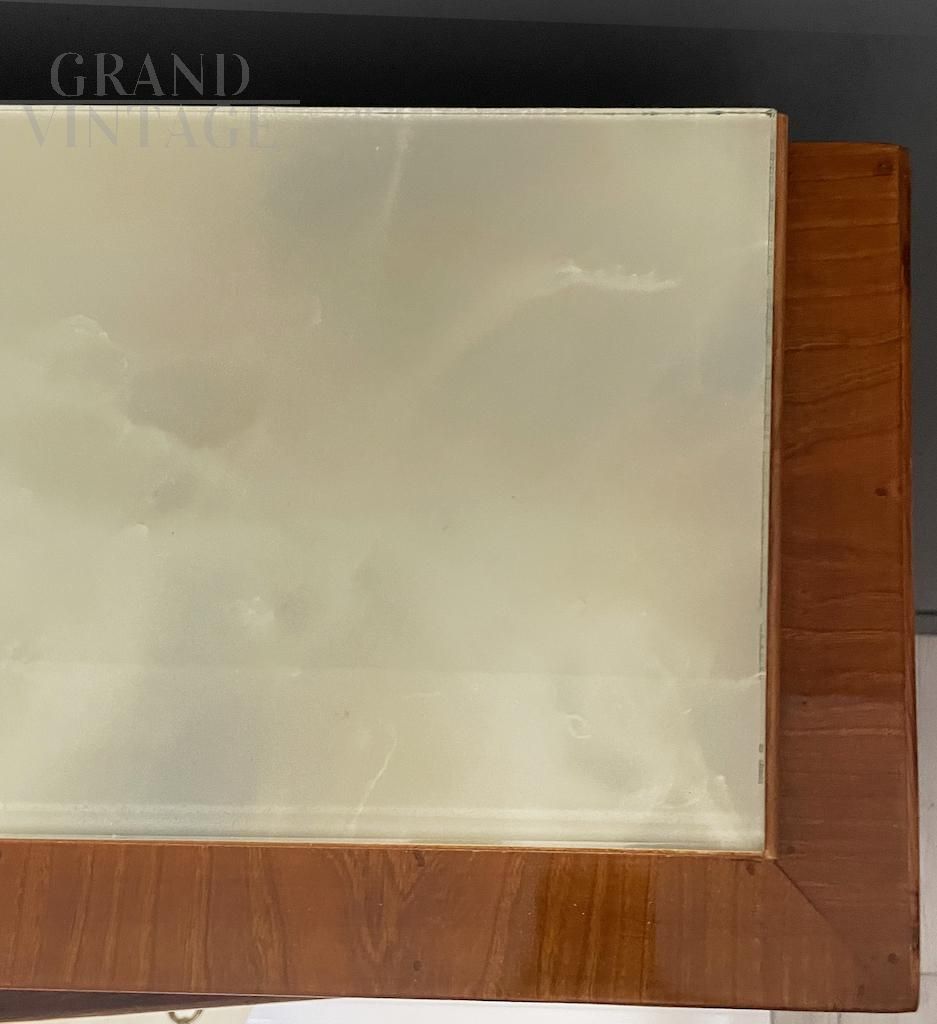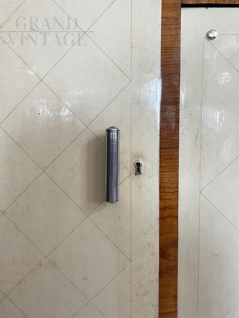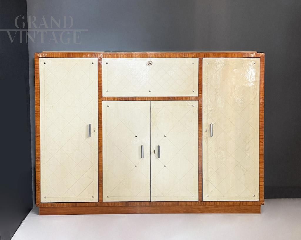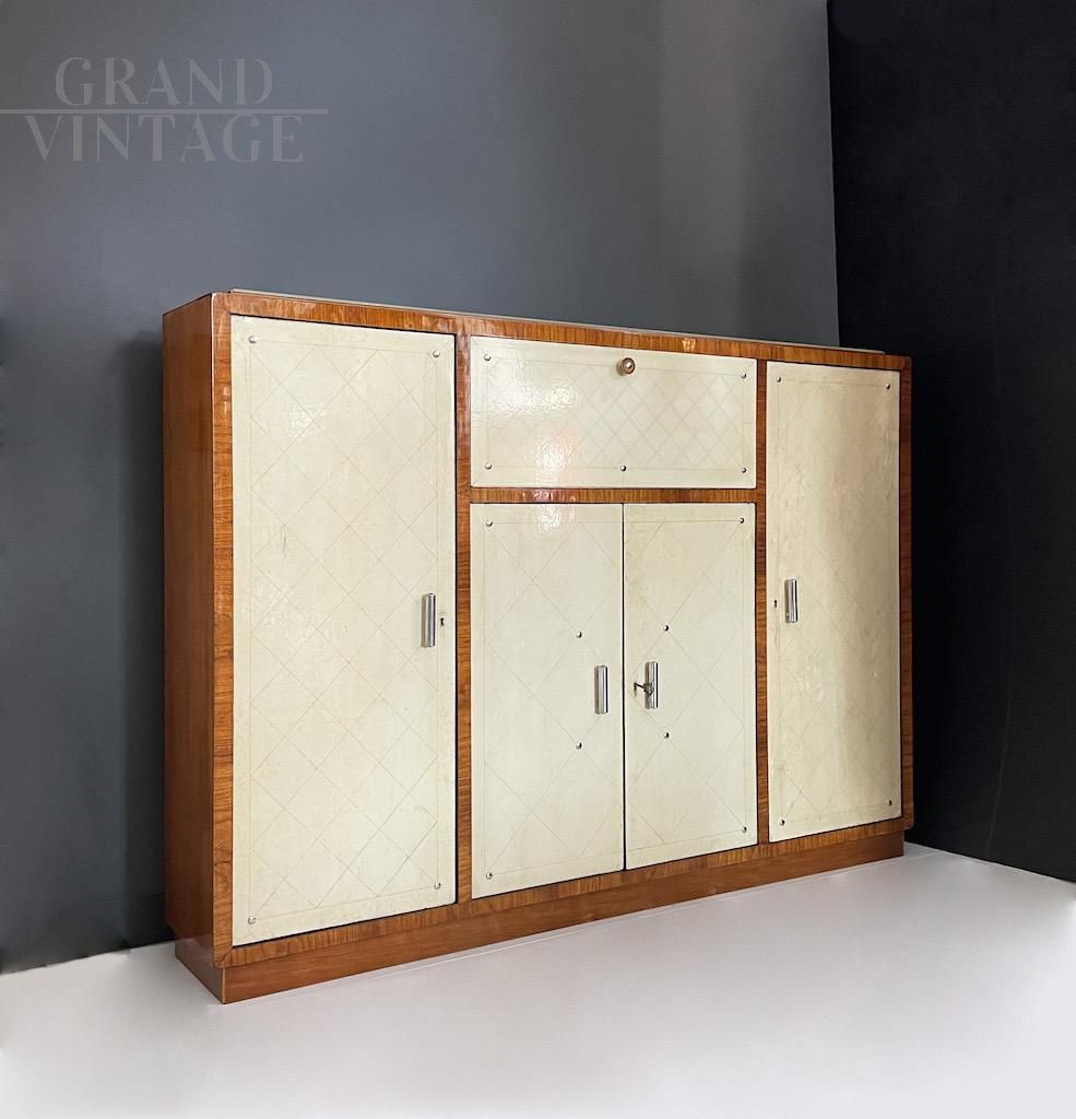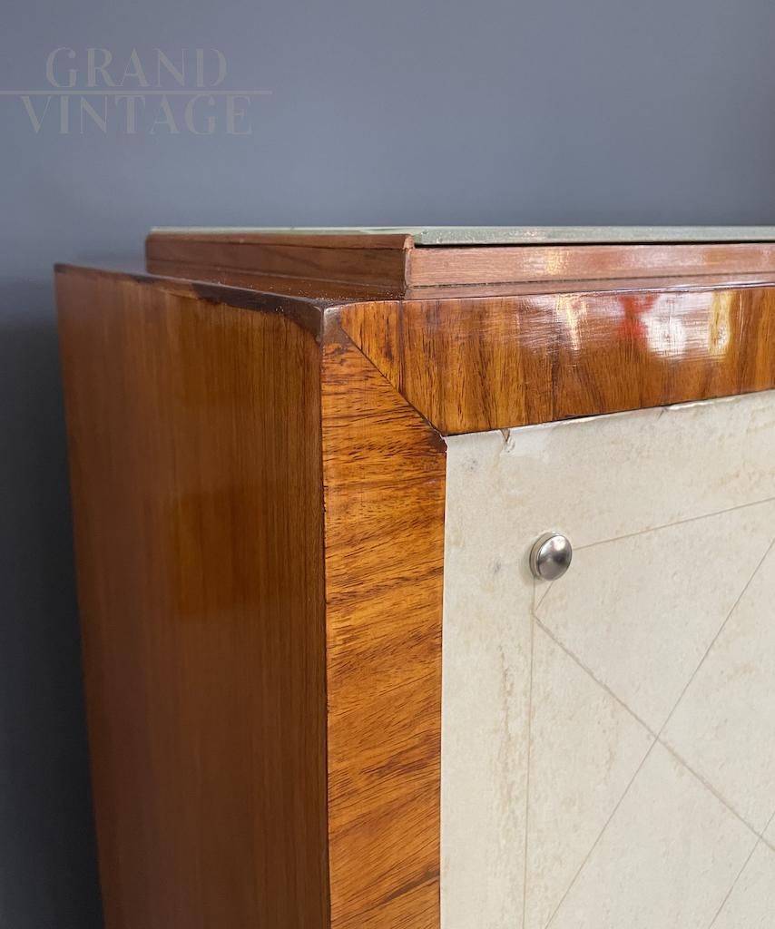 Particolare mobile bar originale vintage italiano degli anni '70 con struttura interamente in pergamena e mogano biondo. Piano in vetro marmorizzato e dettagli in acciaio. Interno centrale specchiato con ripiano in vetro.