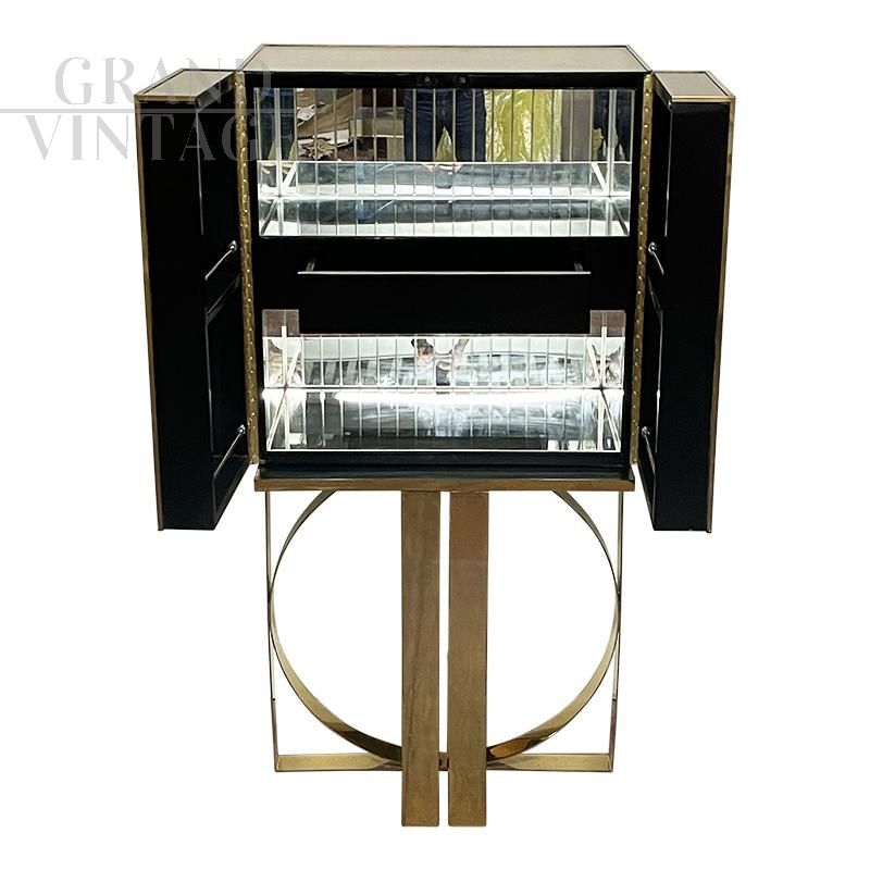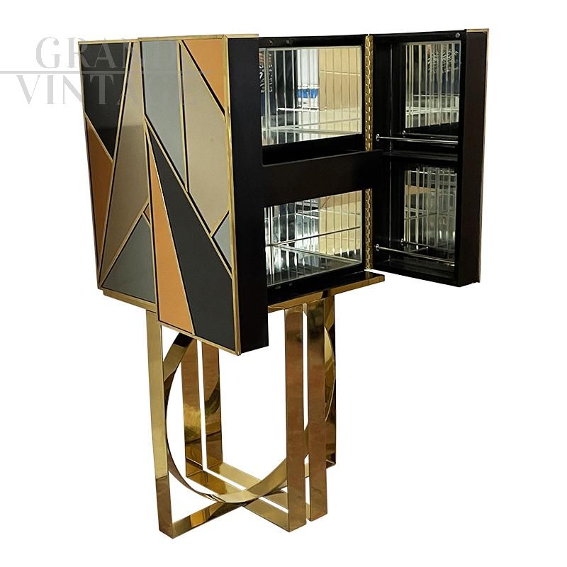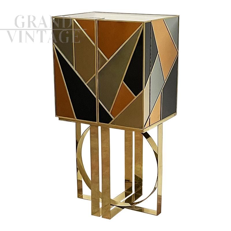 Bellissimo mobile bar in legno rivestito in geometrie di specchi e vetri colorati, con interno specchiato, interamente realizzato a mano. Le ante hanno un'apertuta push pull, finiture, profili, piedi arrotondati in ottone. Dotato di un cassetto interno.