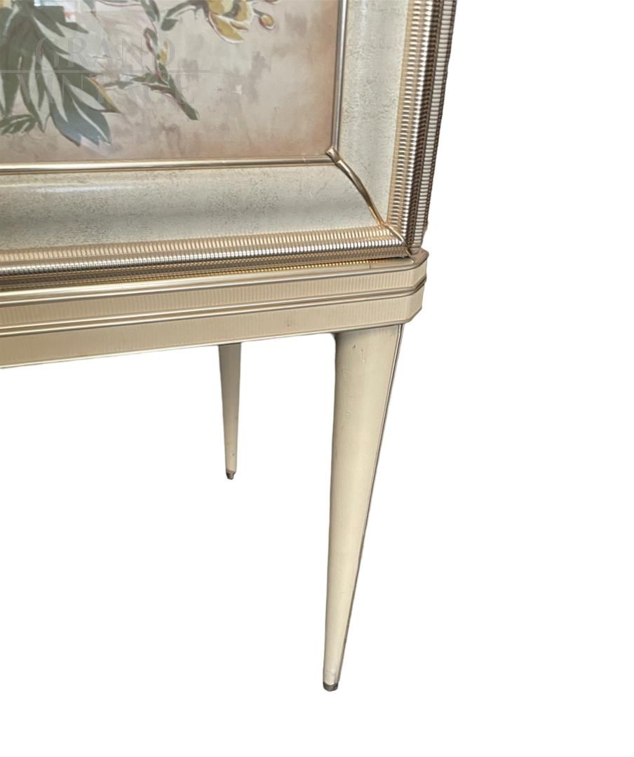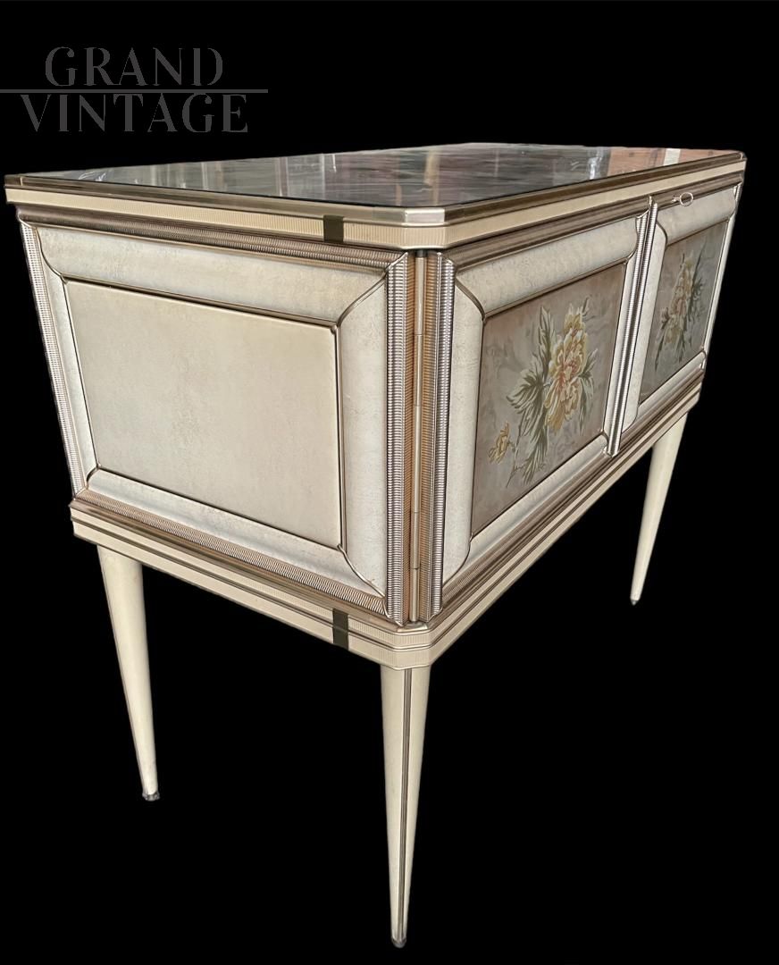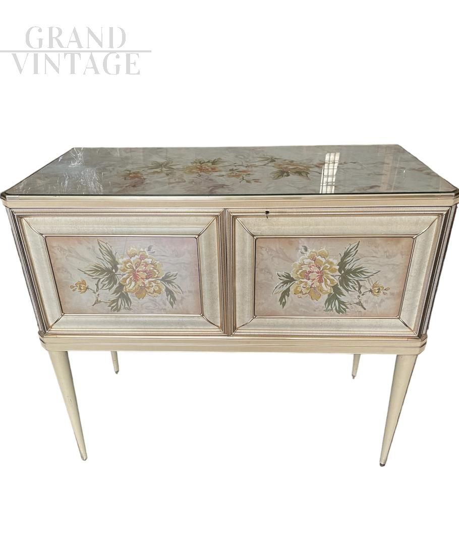 Mobile bar di Umberto Mascagni in pergamena dipinta con motivi floreali