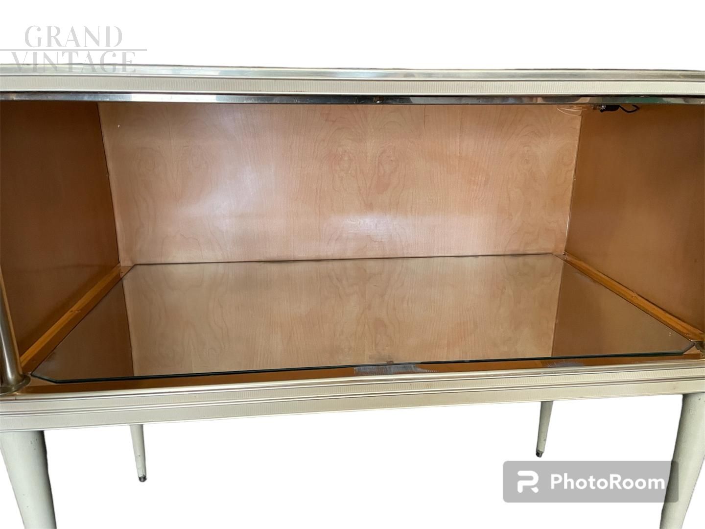 Grazioso mobile bar porta liquori design di Umberto Mascagni rivestito in pelle pergamena color panna, decorato con disegni floreali e con rifiniture in metallo dorato. Buone condizioni, anni '50, presenta piccoli segni del tempo.