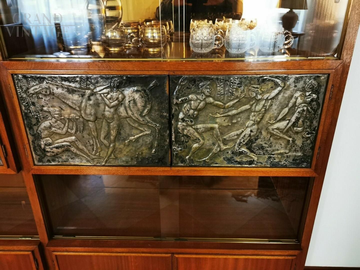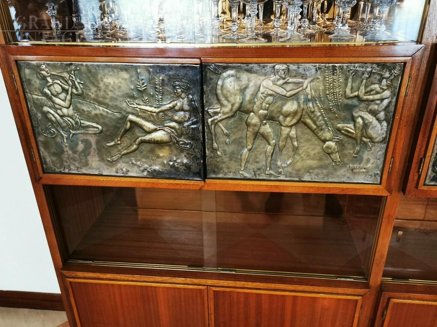 Credenza buffet mobile bar vintage design anni '50 di Vittorio Dassi con formelle artistiche in metallo argentato sbalzato a mano, Vittorio Dassi Lissone - Monza Brianza - Italia, mid century italiano.