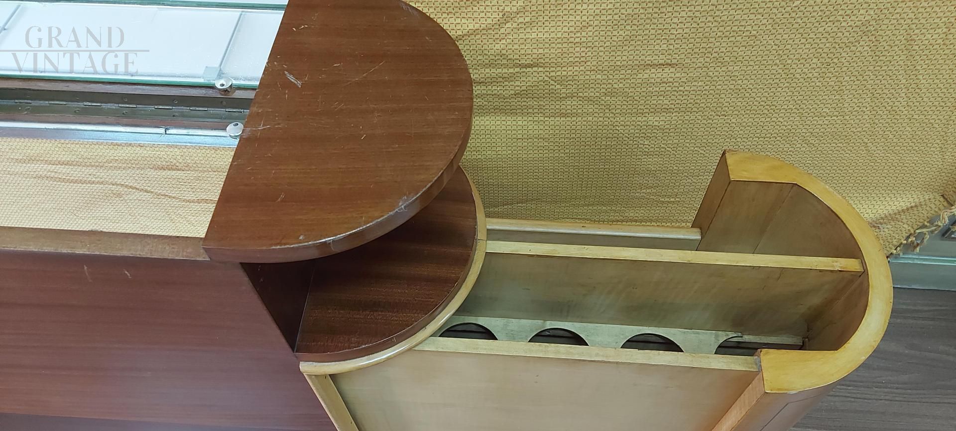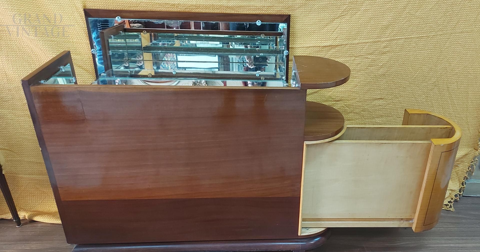 Bellissimo mobile bar vintage con bancone e retro da appoggiare al divano o al muro, in acero e mogano, anni '50, con interno specchiato e vano porta bottiglie estraibile su un lato.