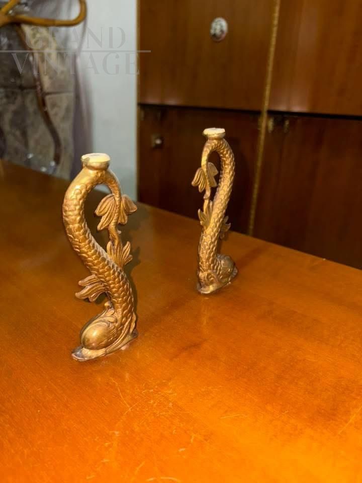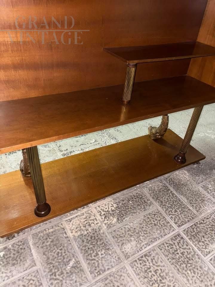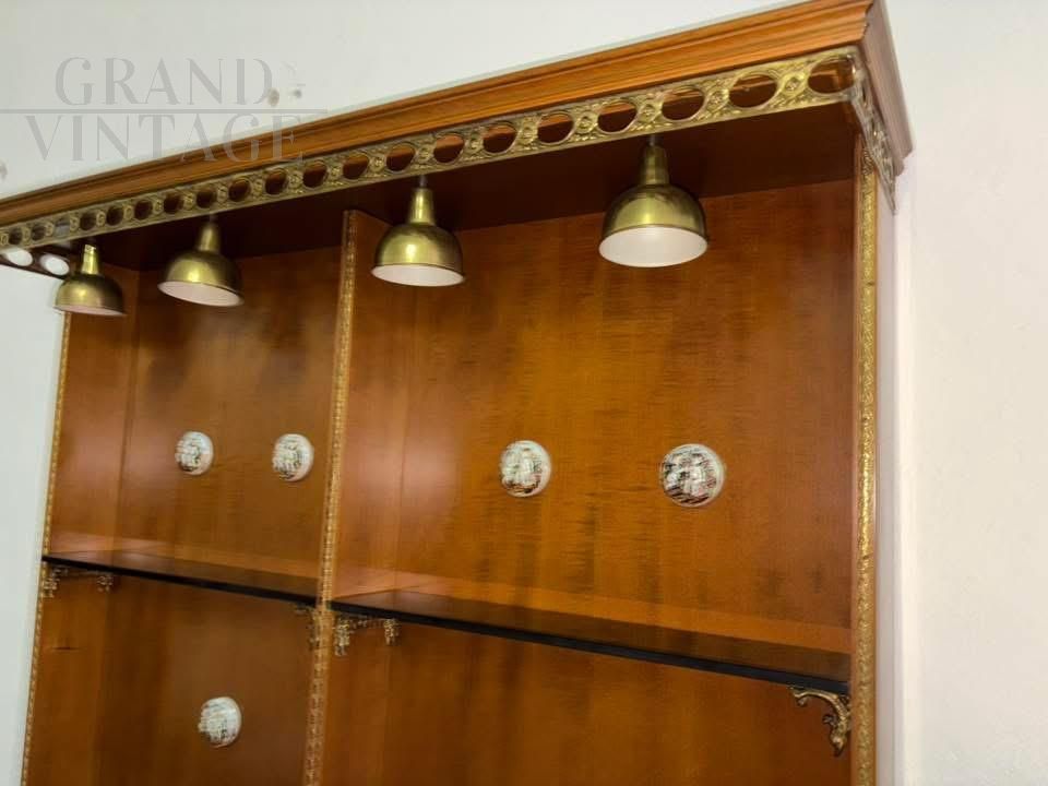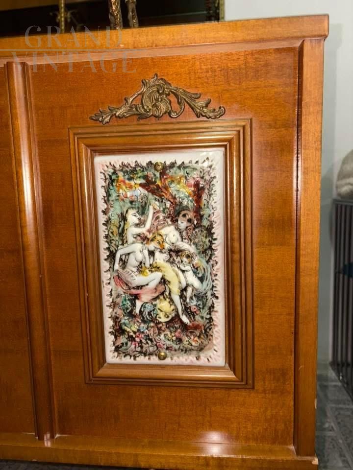 Mobile bar vintage in legno con dettagli in ceramica dipinta e ottone