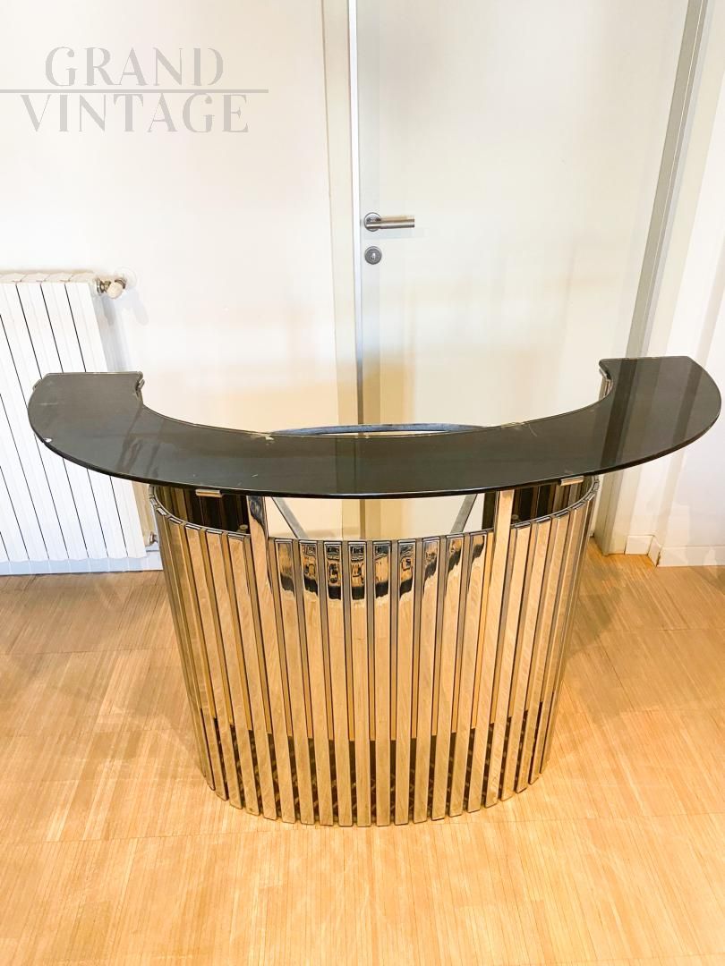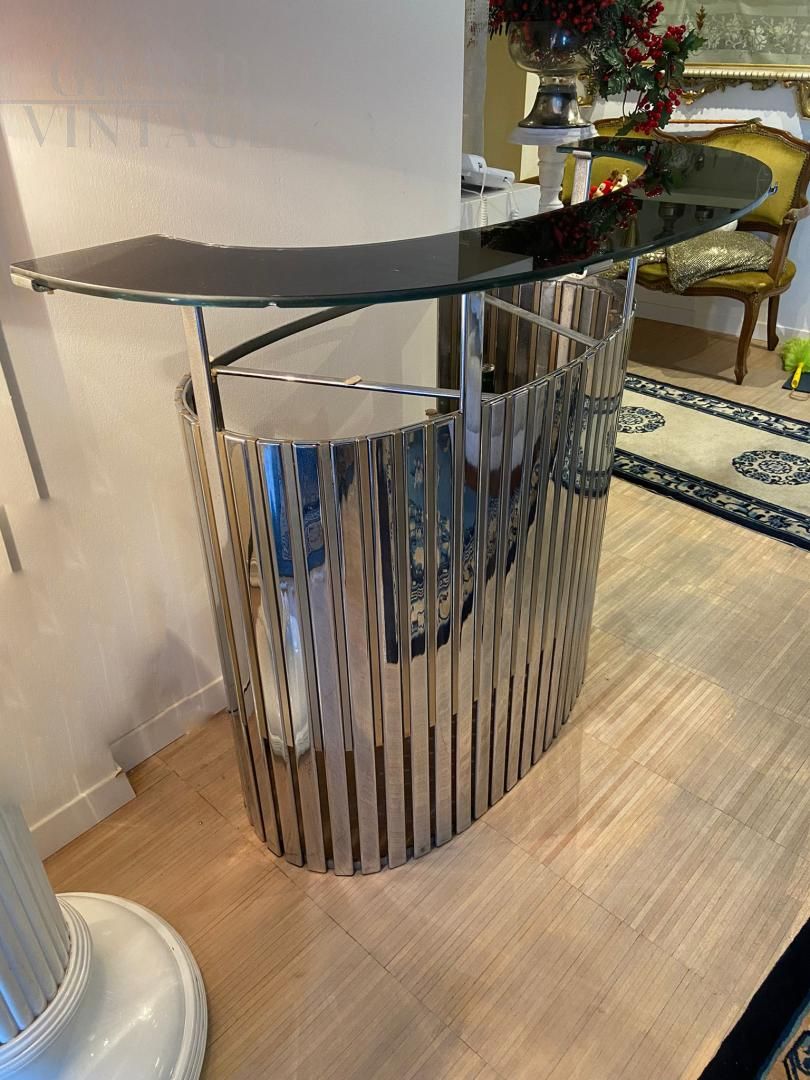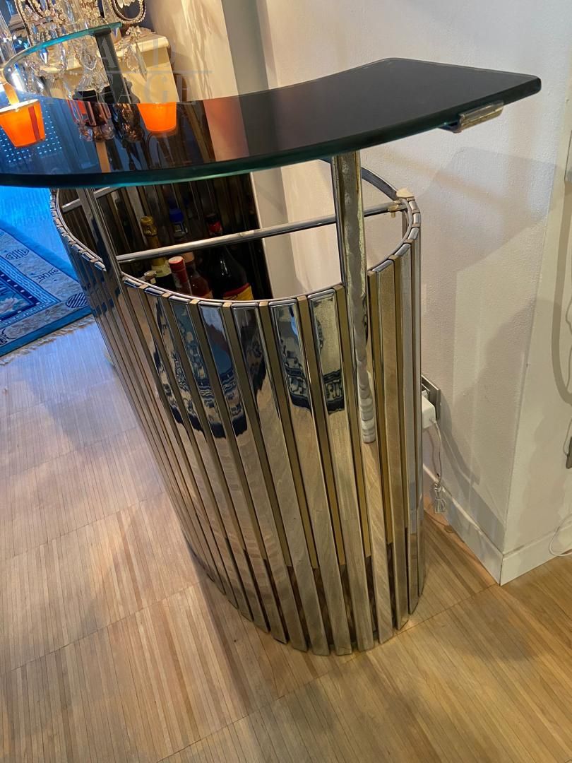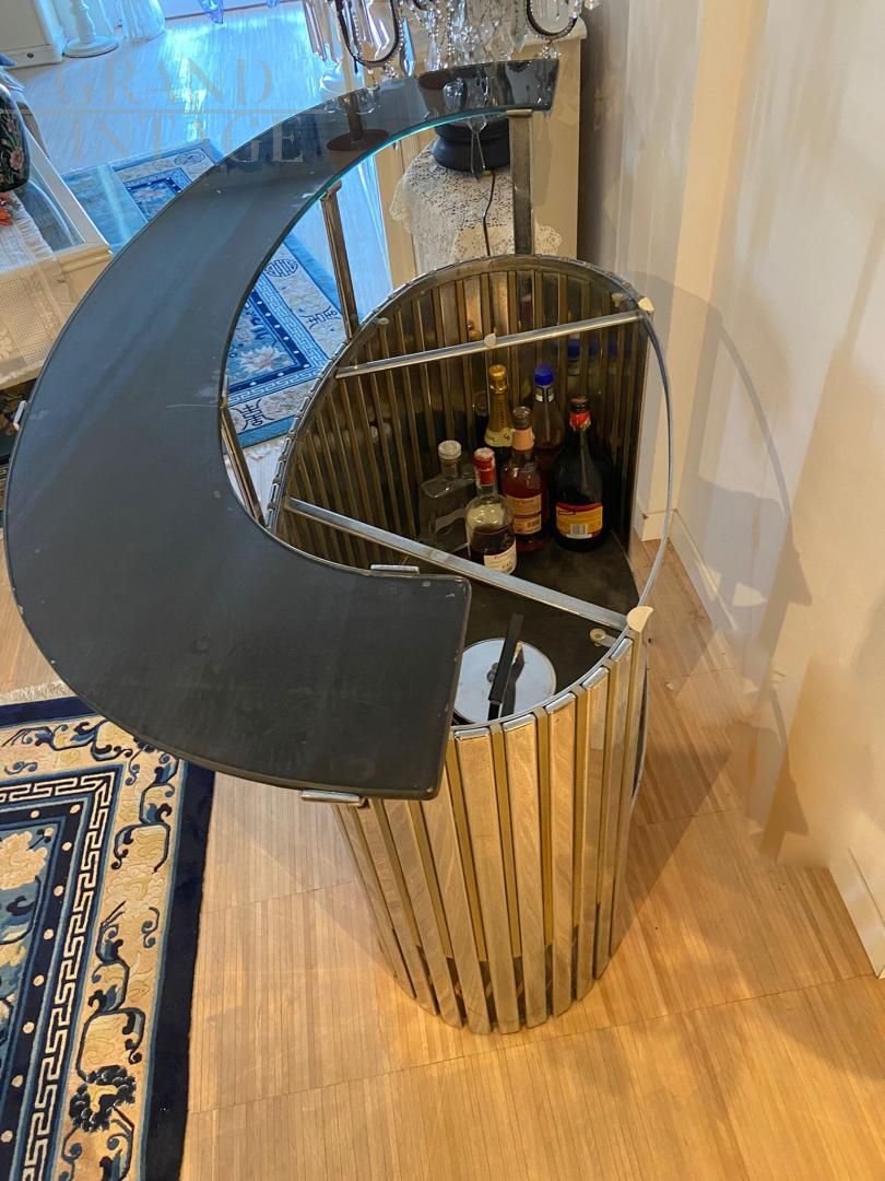 Mobile cocktail bar in metallo cromato e ottone, Italia anni '70. L'anima del mobile è realizzata in acciaio cromato e ottone, mentre il ripano superiore in vetro nero specchiato. Il lato interno presenta uno spazio aperto con un utile ripiano per alloggiare le bottiglie.