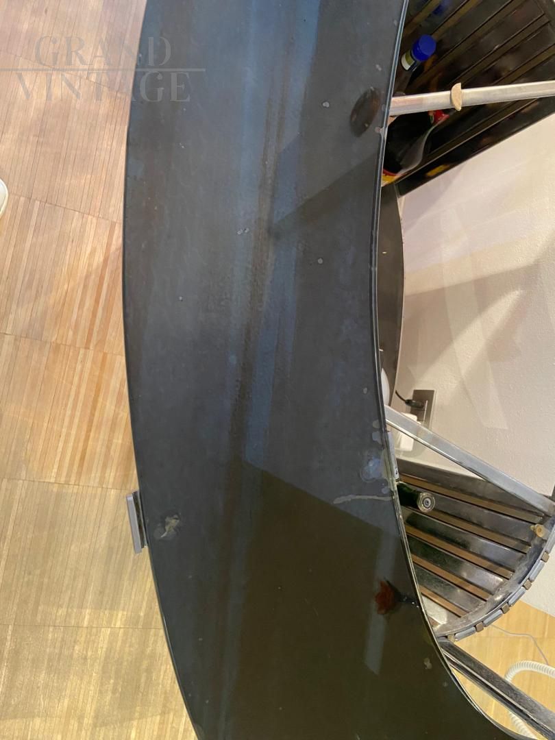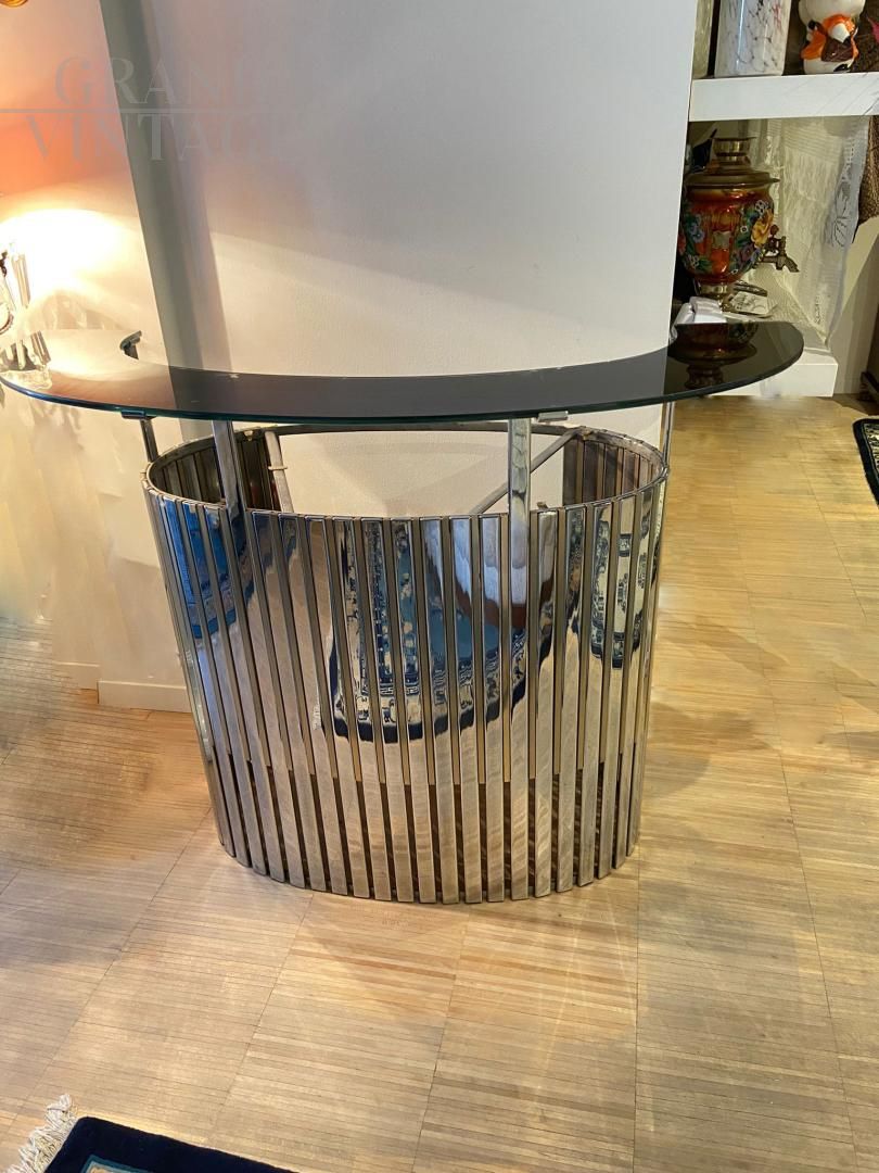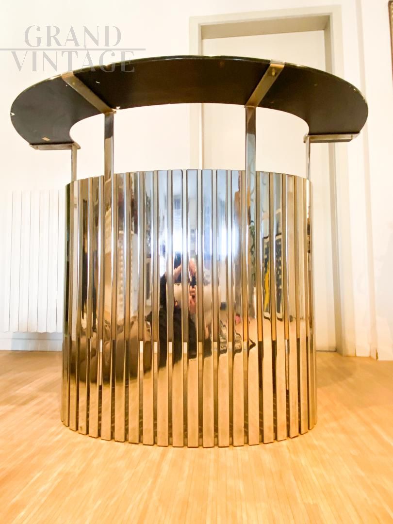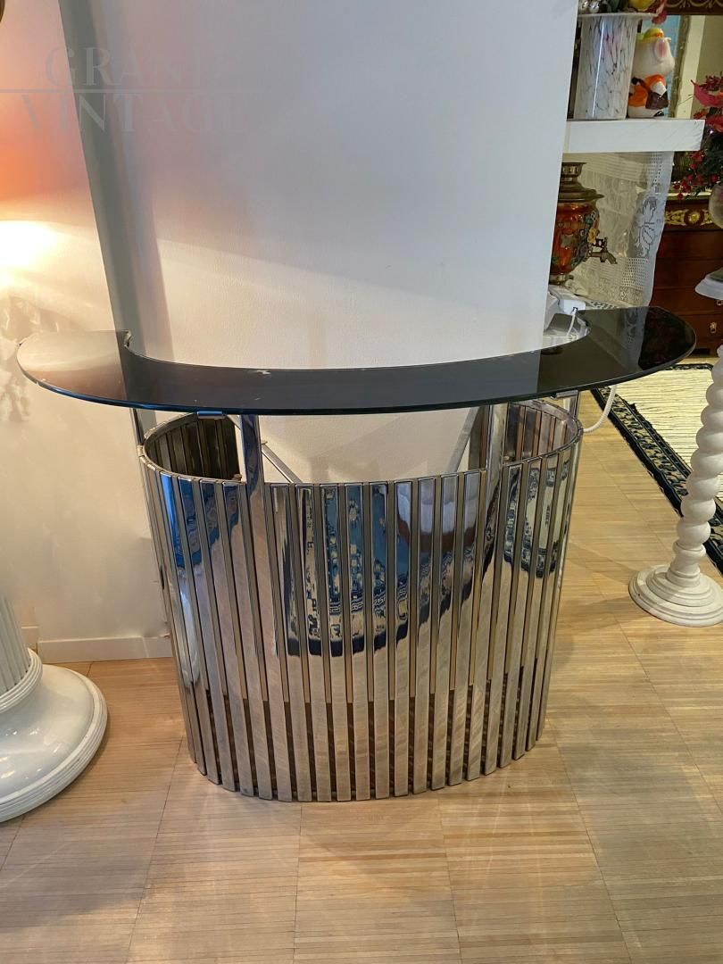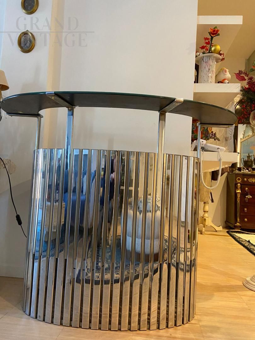 Mobile cocktail bar in metallo cromato e ottone, Italia anni '70. L'anima del mobile è realizzata in acciaio cromato e ottone, mentre il ripano superiore in vetro nero specchiato. Il lato interno presenta uno spazio aperto con un utile ripiano per alloggiare le bottiglie.