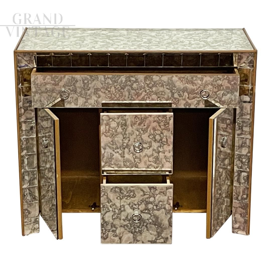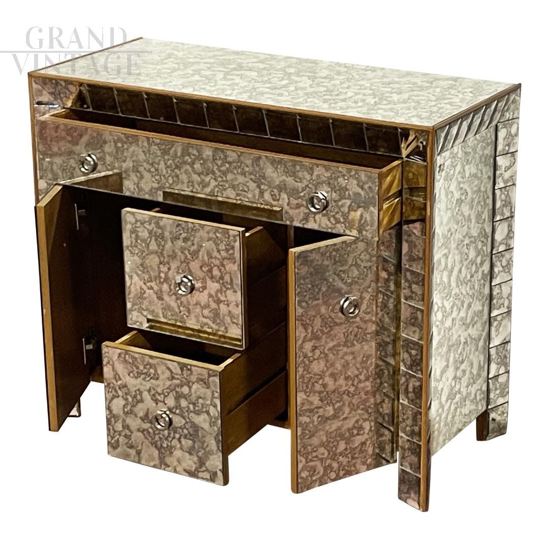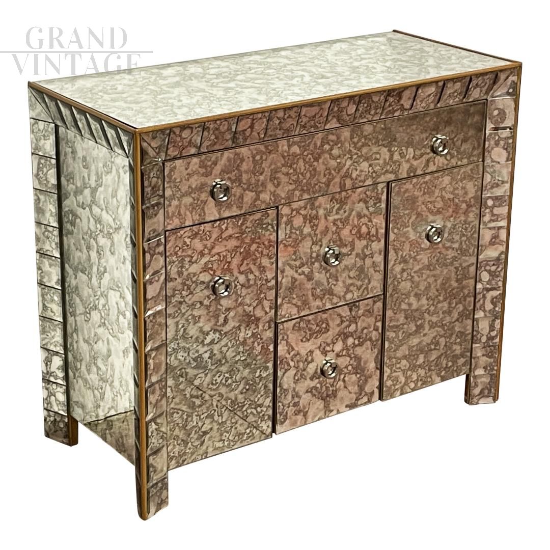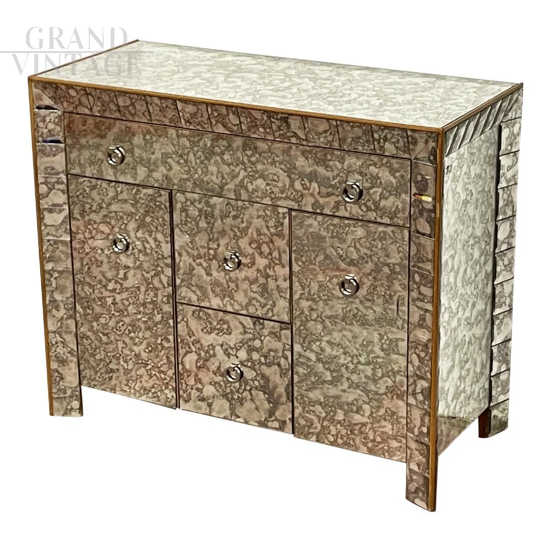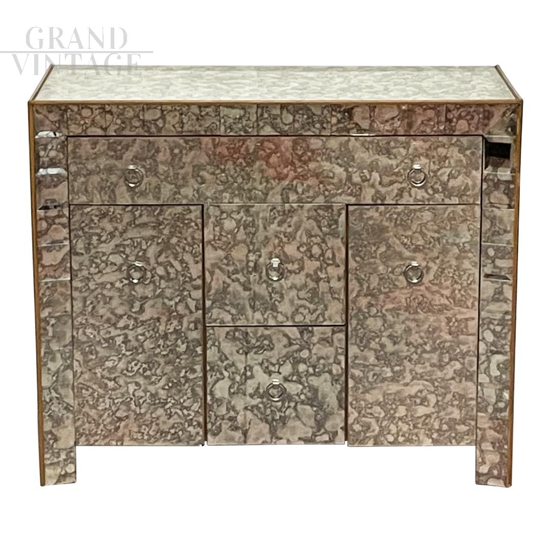 Mobile contenitore con due ante e tre cassetti, con struttura in legno interamente rivestita in specchio fumé e profili in ottone. Italia fine XX secolo.