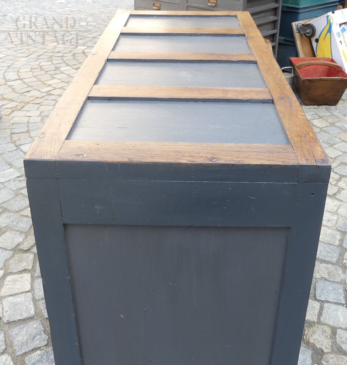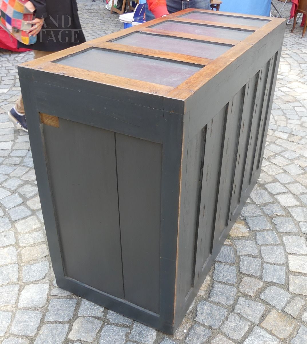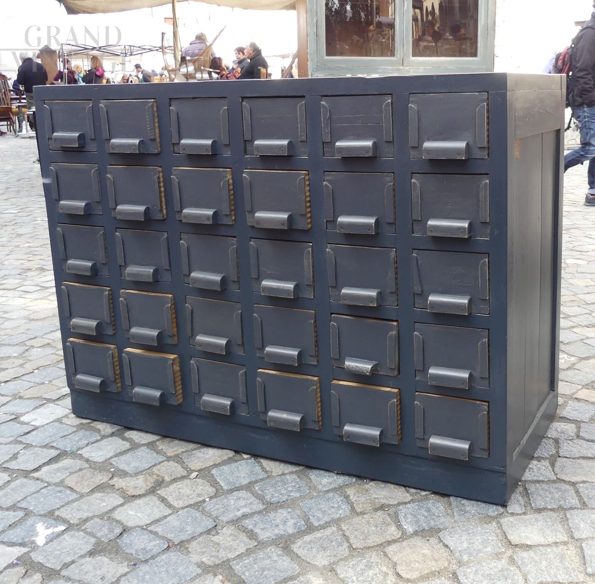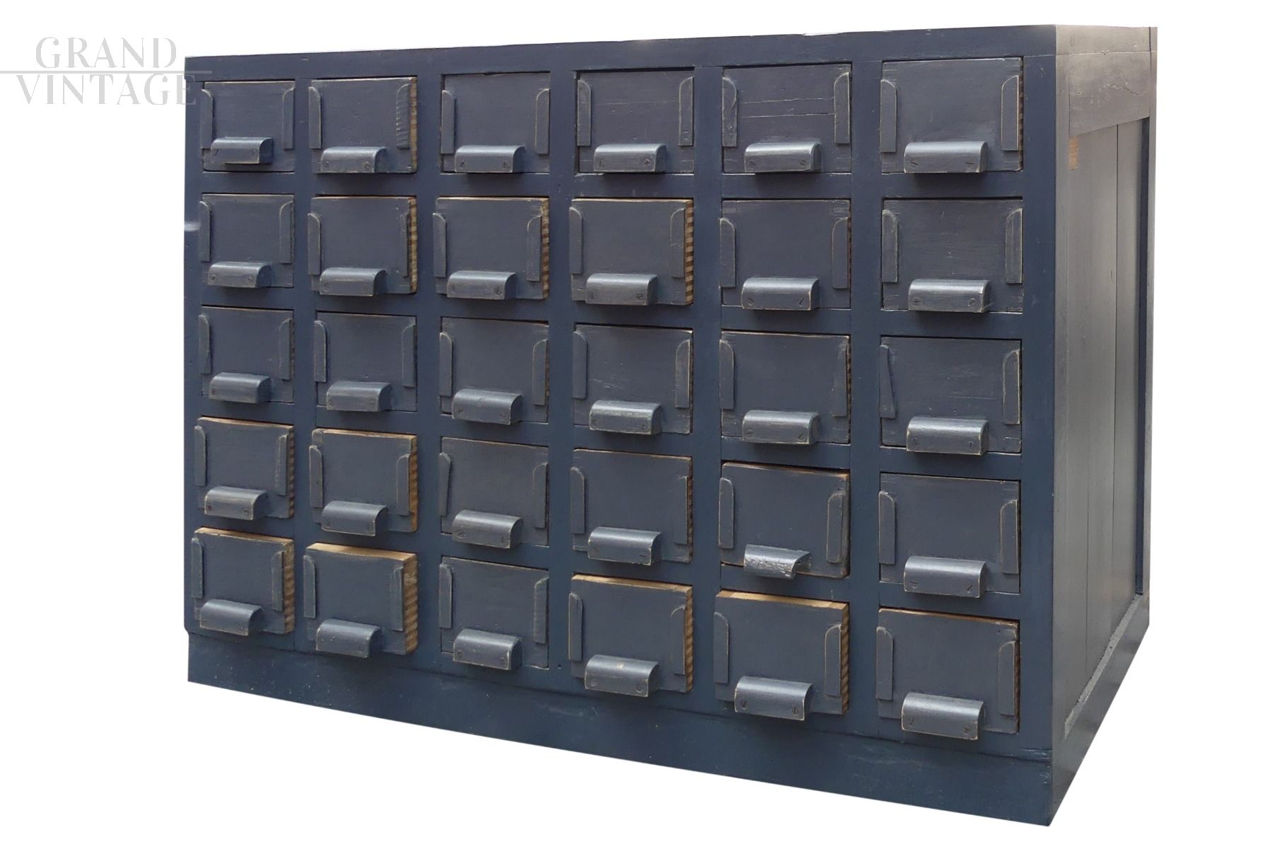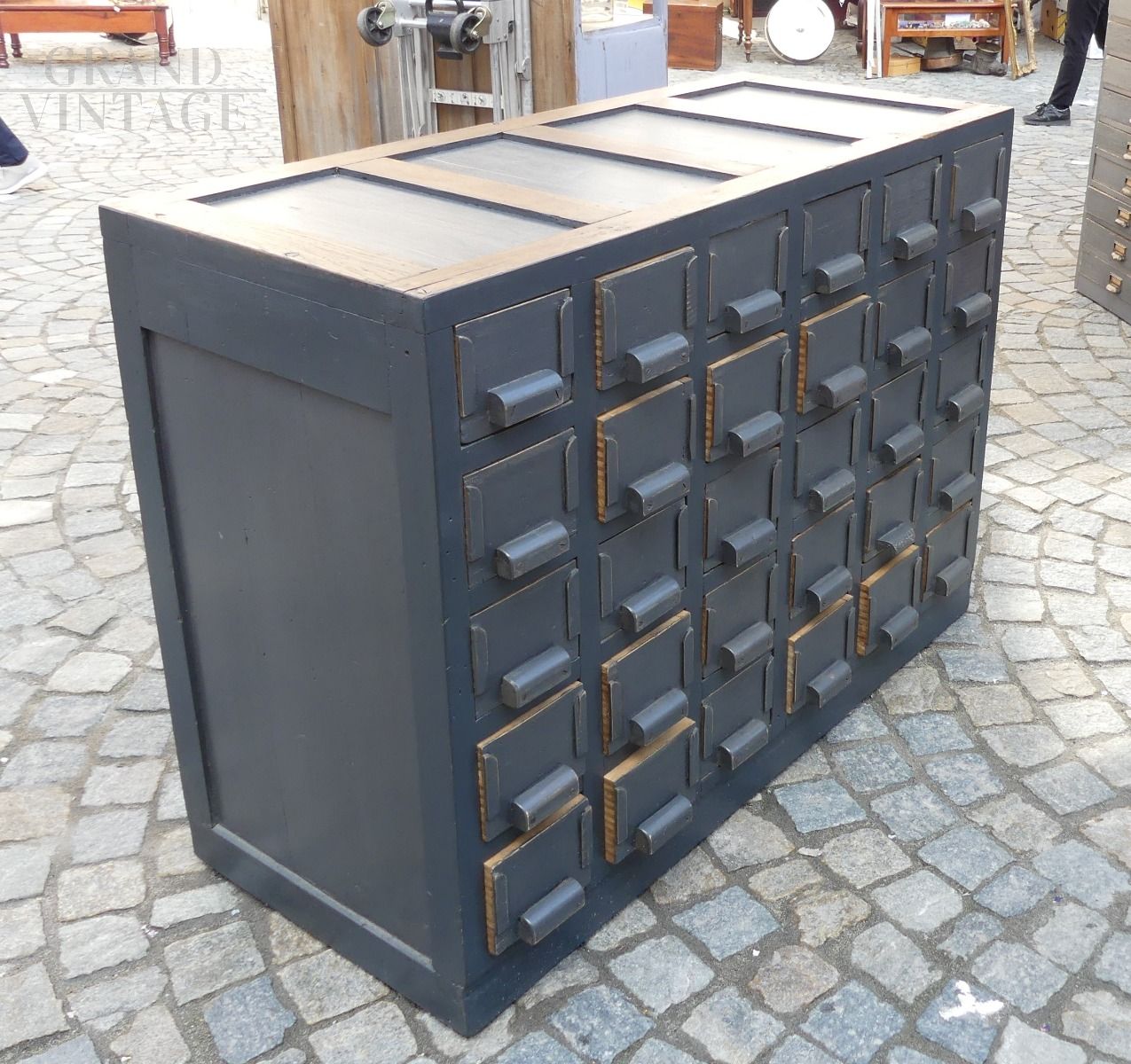 Mobile cassettiera da ferramenta del 1930 costruito in legno di rovere, laccata in un bellissimo verde petrolio, perfetta per per la minuteria di precisione.