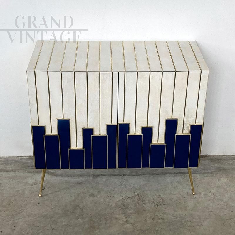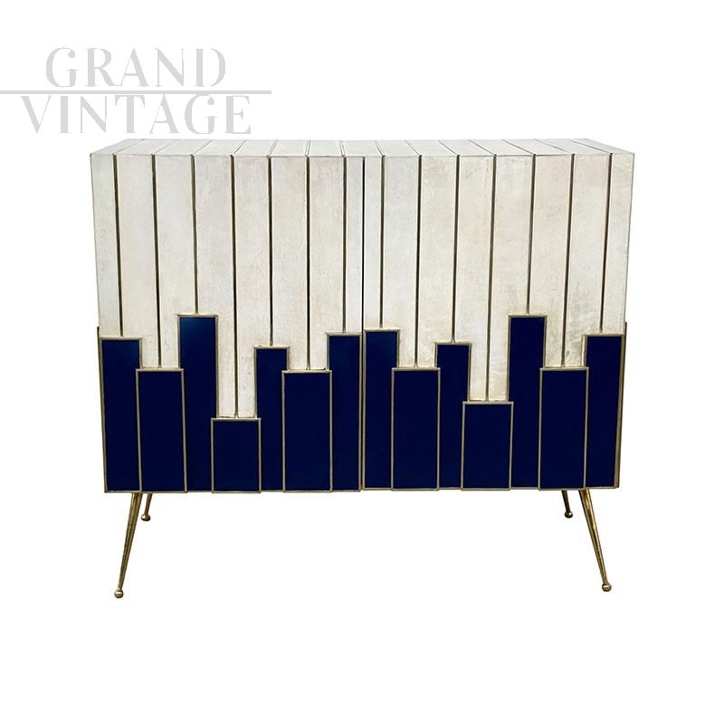 Mobile contenitore con due ante push pull, interamente realizzato a mano, struttura in legno rivestita con elementi in vetro blu e pergamena naturale, profili e piedi in ottone dorato. Un ripiano interno.
