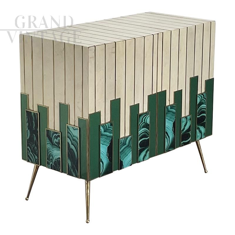 Piccola credenza in vetro verde malachite e pergamena naturale