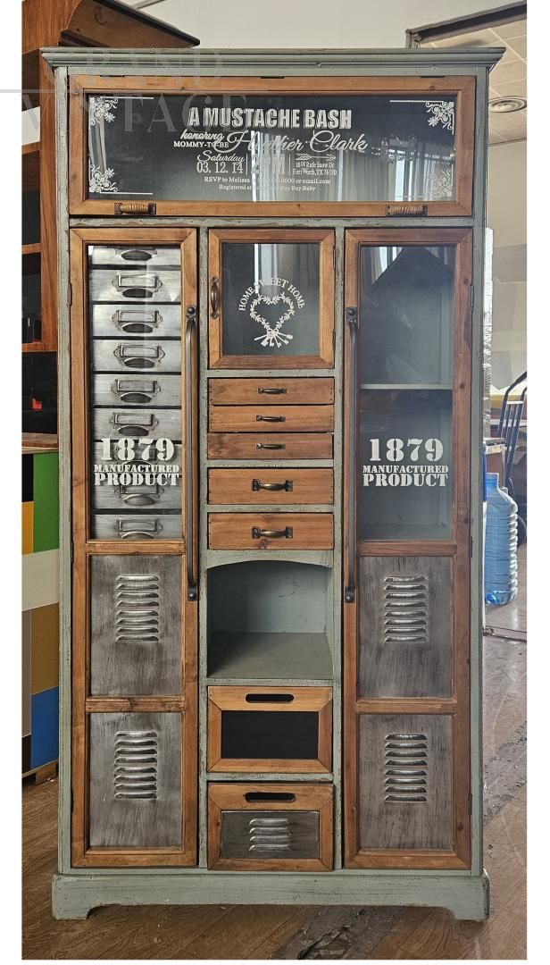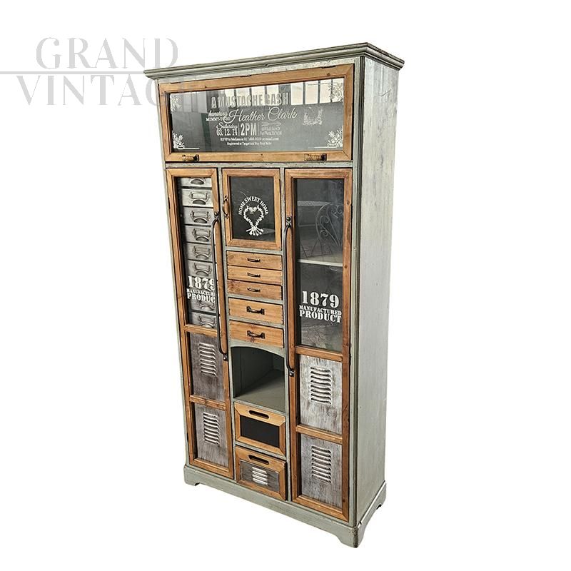 Mobile espositore da negozio vintage in stile inglese in legno laccato con cassetti in metallo e ante in vetro con scritte, perfetto anche come credenza per una cucina in stile industriale.