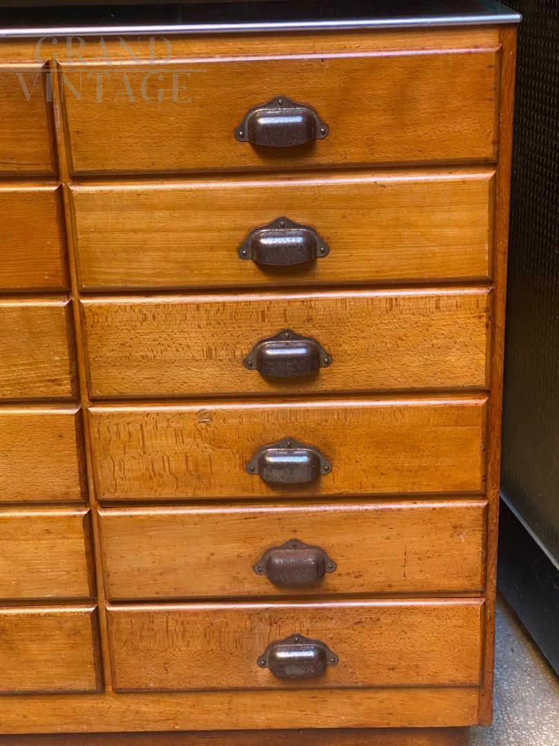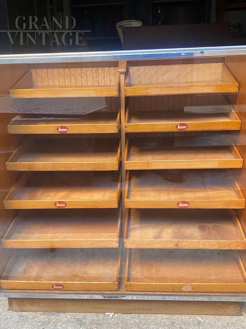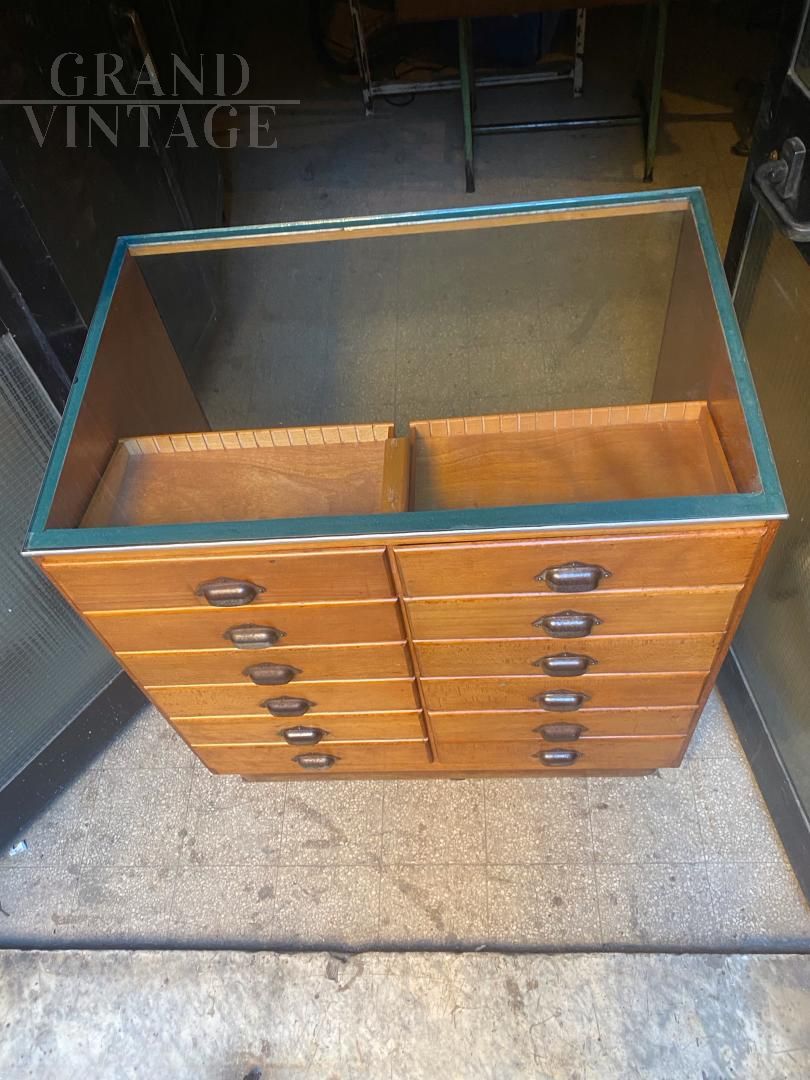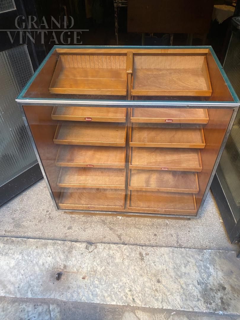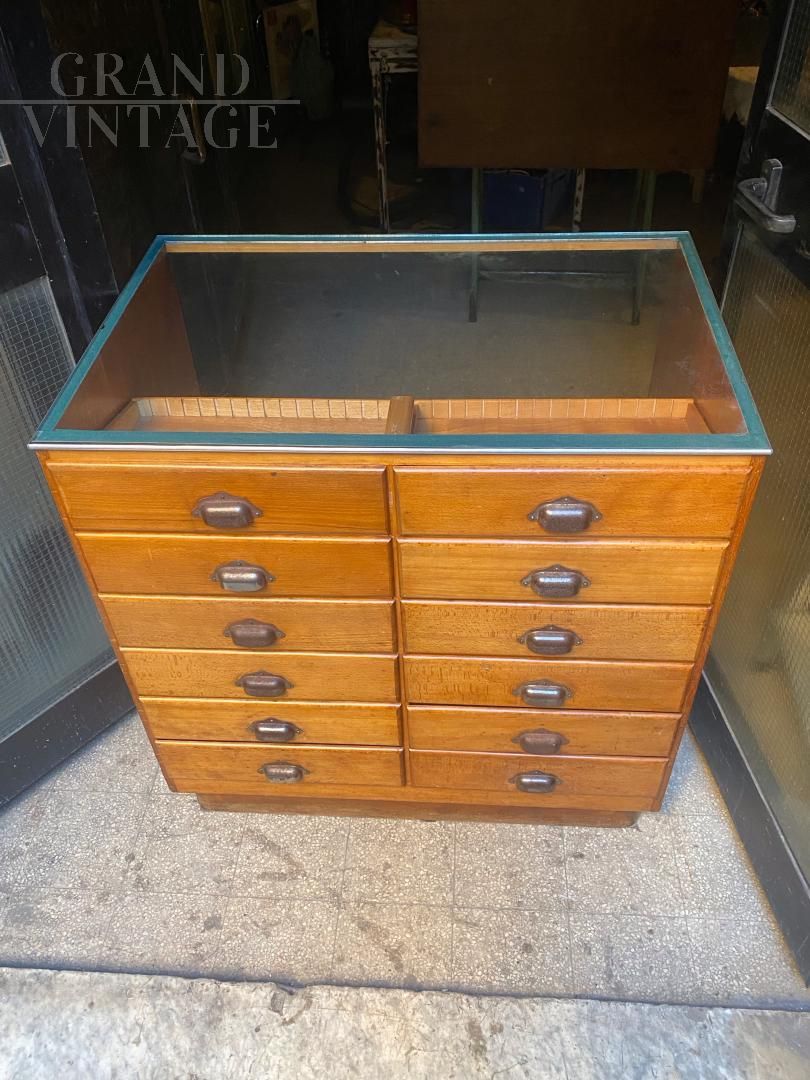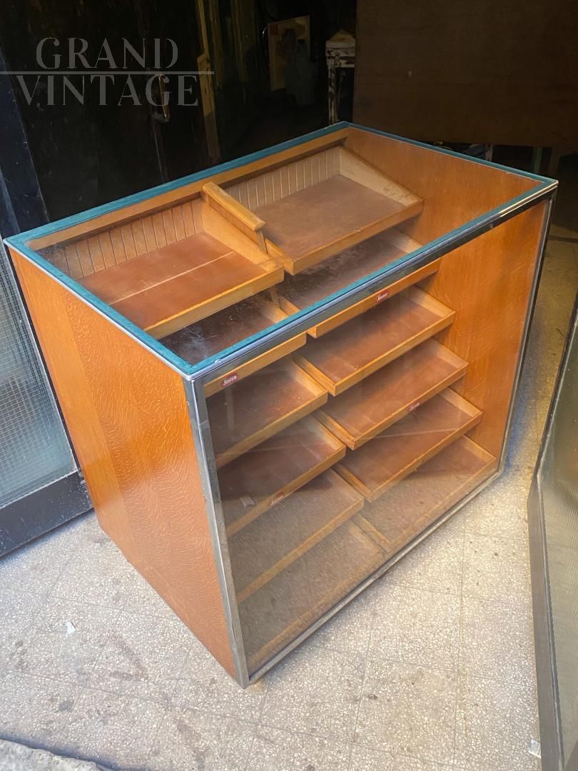 Mobile banco espositore vintage proveniente da un antico negozio inglese, la parte frontale è in vetro per mostrare la merce esposta, il retro è composto da una bella cassettiera in legno con maniglie a conchiglia in metallo. Raro e molto bello, in ottime condizioni.