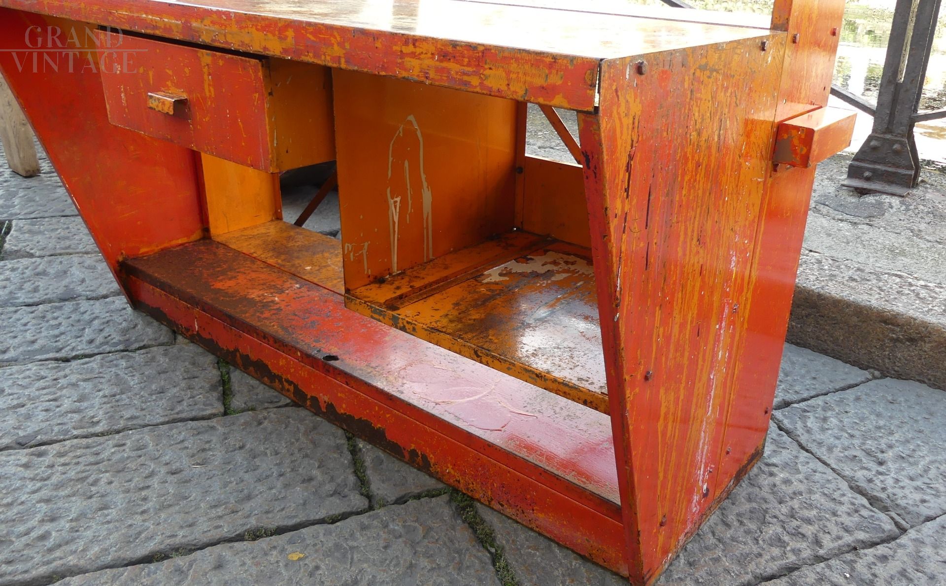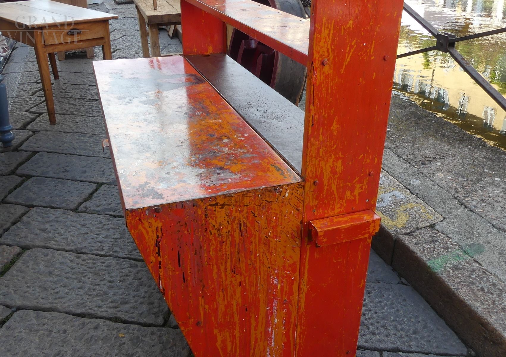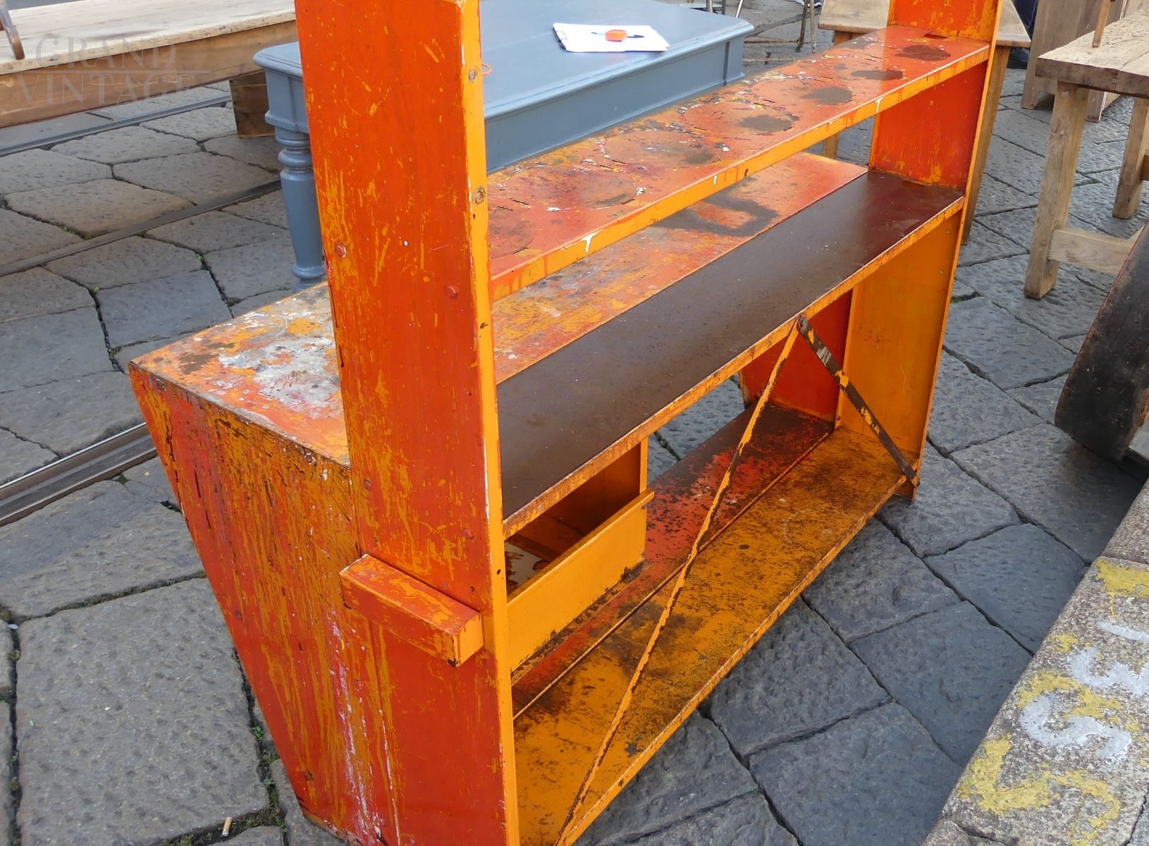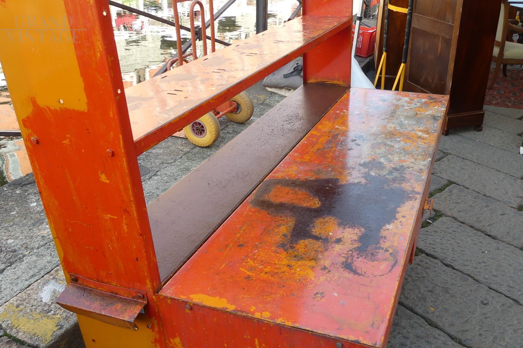 Grande mobile da officina industriale vintage, archeologia industriale, anni '70, in lamiera laccata arancione. Originariamente appartenuta ad un'officina meccanica, questo bellissimo mobile può rivelarsi davvero funzionale e può arricchire un contesto lavorativo simile, o arredare un salotto in stile industriale come libreria, o essere utilizzato come credenza in bar, pub o ristoranti in perfetto stile industriale.