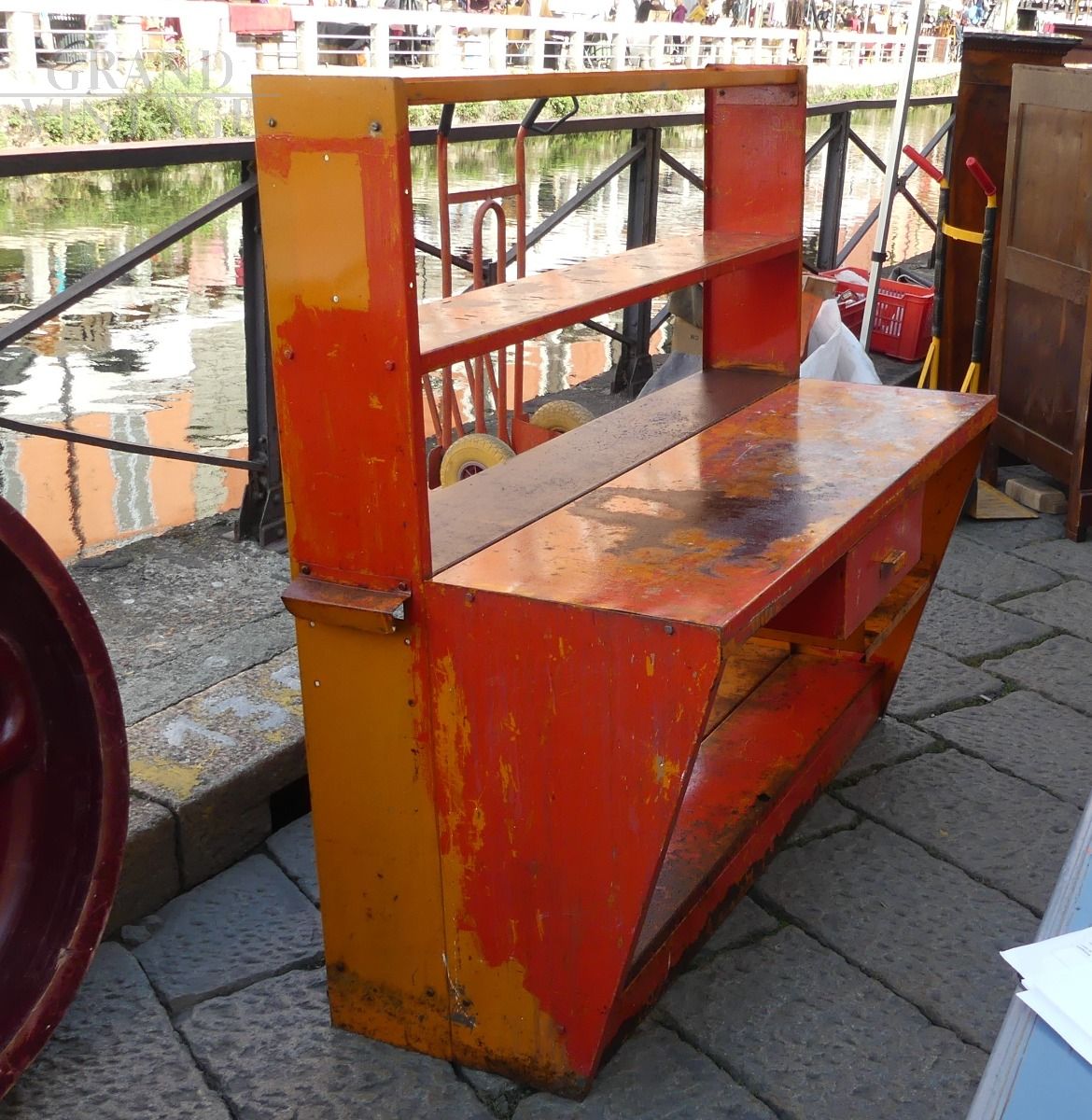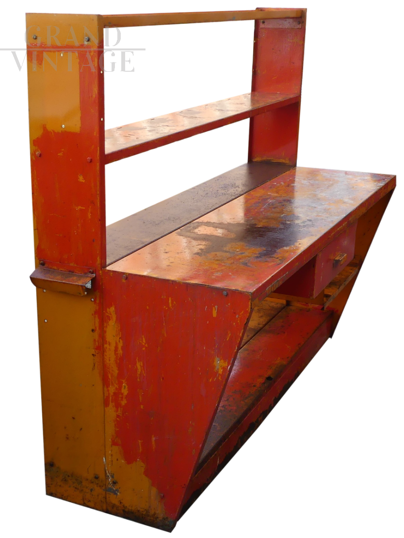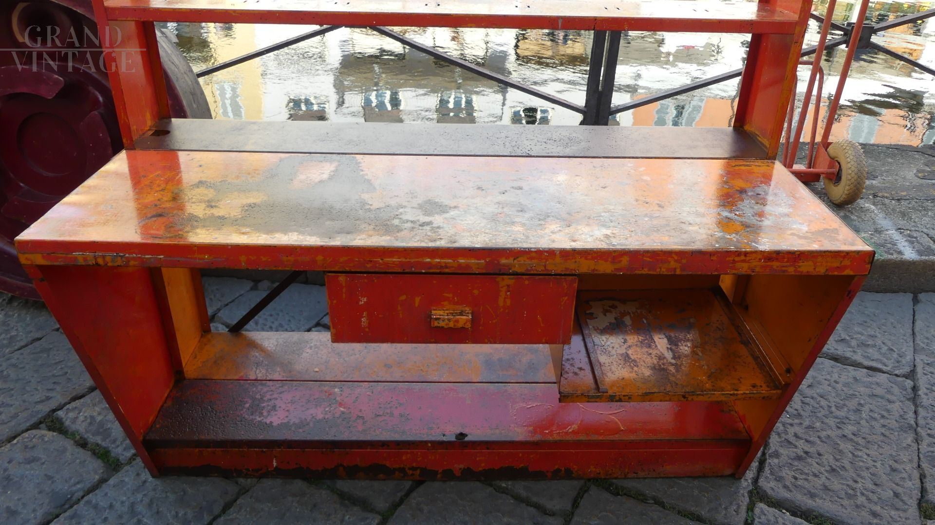 Grande mobile da officina industriale vintage, archeologia industriale, anni '70, in lamiera laccata arancione. Originariamente appartenuta ad un'officina meccanica, questo bellissimo mobile può rivelarsi davvero funzionale e può arricchire un contesto lavorativo simile, o arredare un salotto in stile industriale come libreria, o essere utilizzato come credenza in bar, pub o ristoranti in perfetto stile industriale.