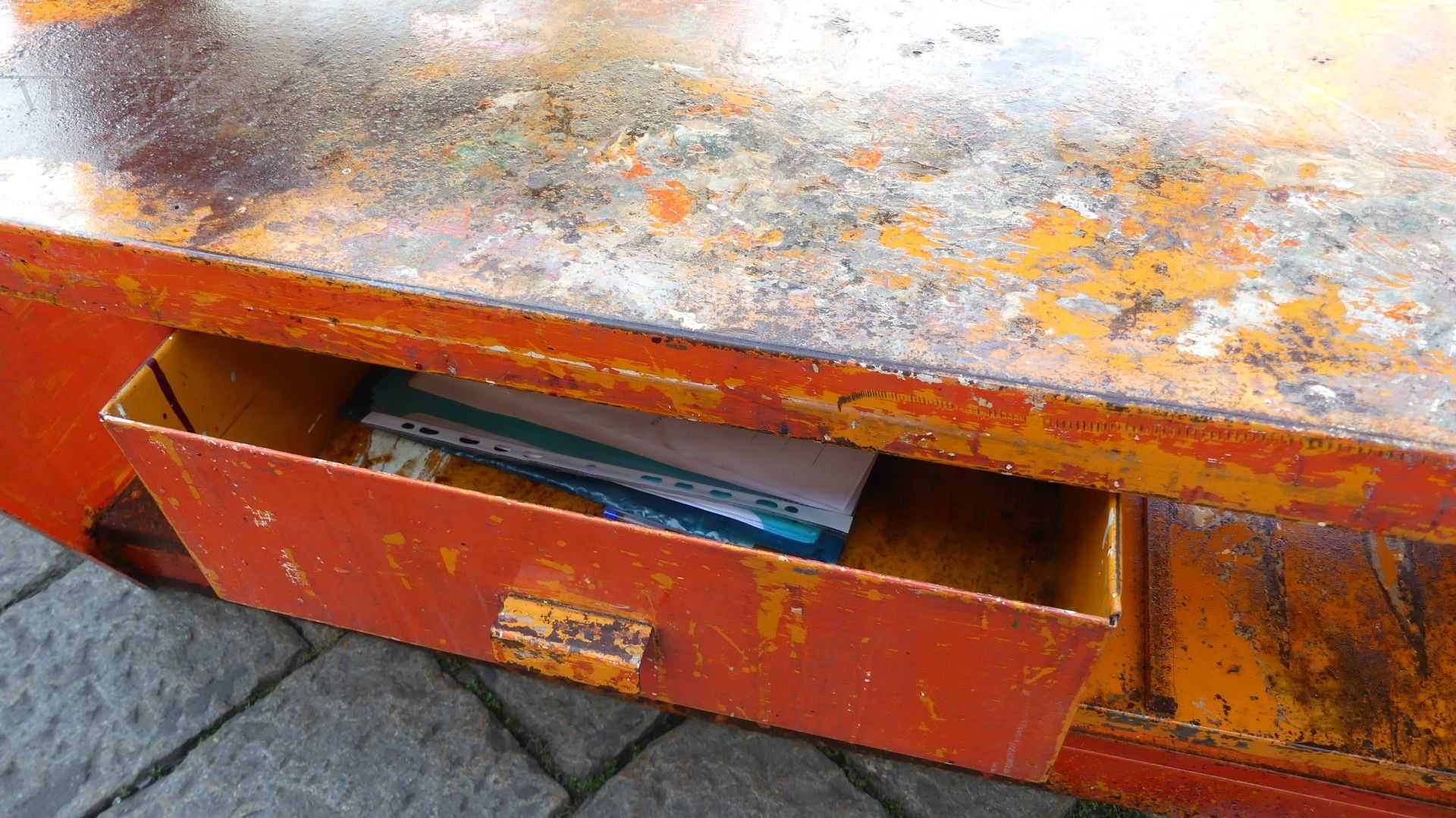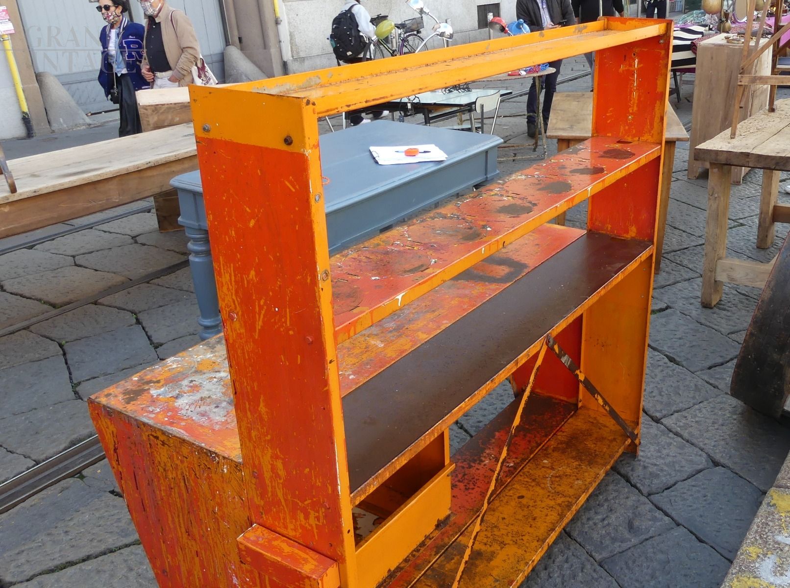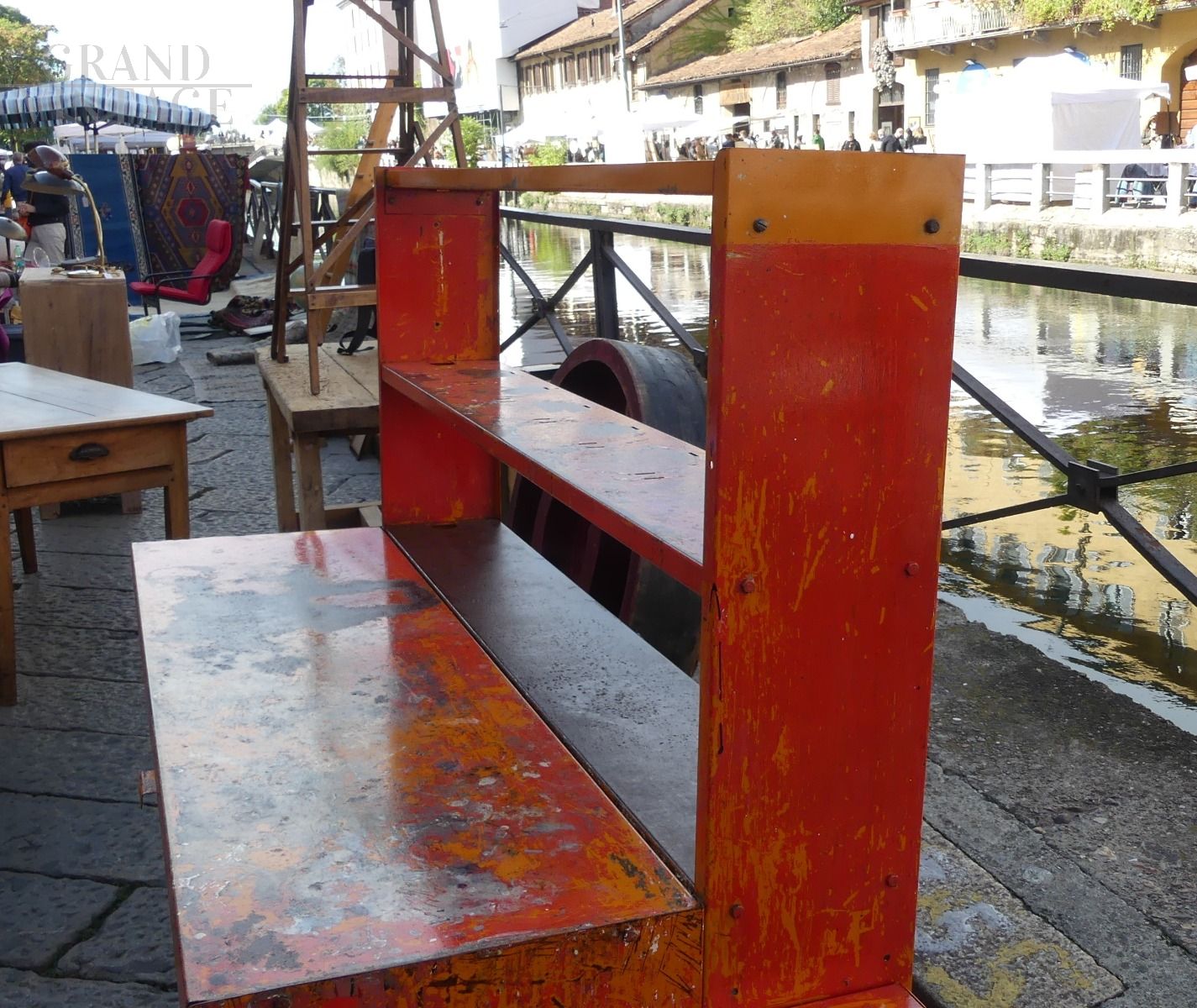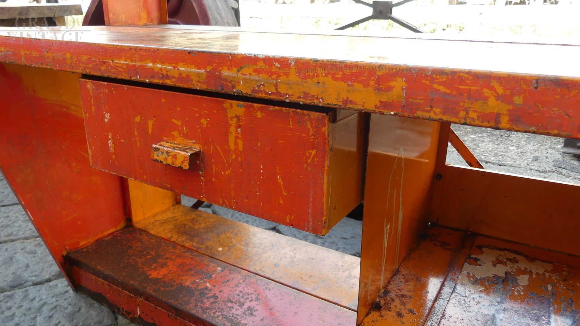 Grande mobile da officina industriale vintage, archeologia industriale, anni '70, in lamiera laccata arancione. Originariamente appartenuta ad un'officina meccanica, questo bellissimo mobile può rivelarsi davvero funzionale e può arricchire un contesto lavorativo simile, o arredare un salotto in stile industriale come libreria, o essere utilizzato come credenza in bar, pub o ristoranti in perfetto stile industriale.