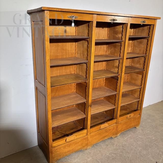 Mobile classificatore libreria per archivio da ufficio a tre serrandine in faggio massello, anni '50, restaurato e completo di 18 ripiani.