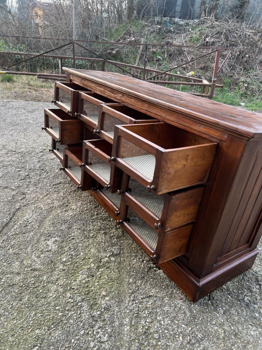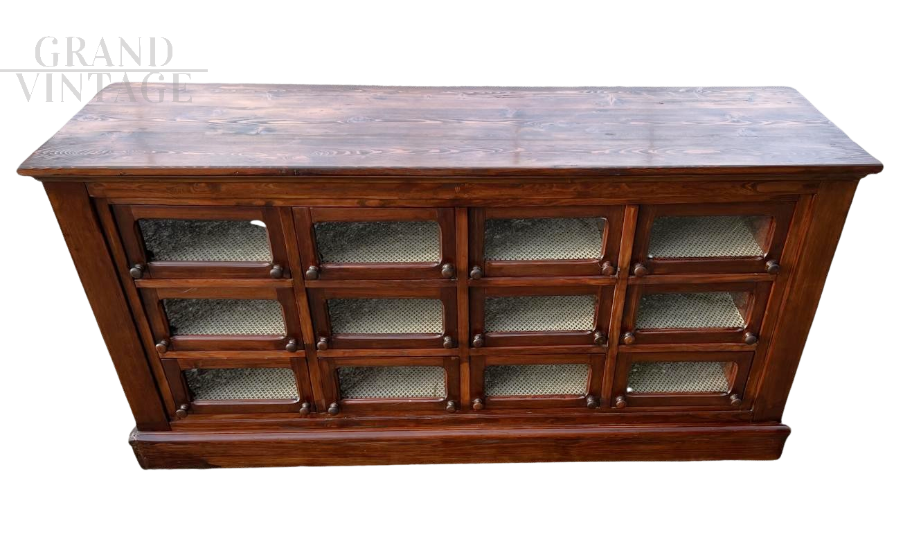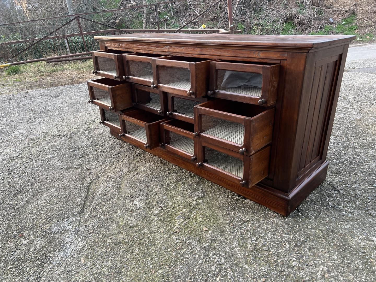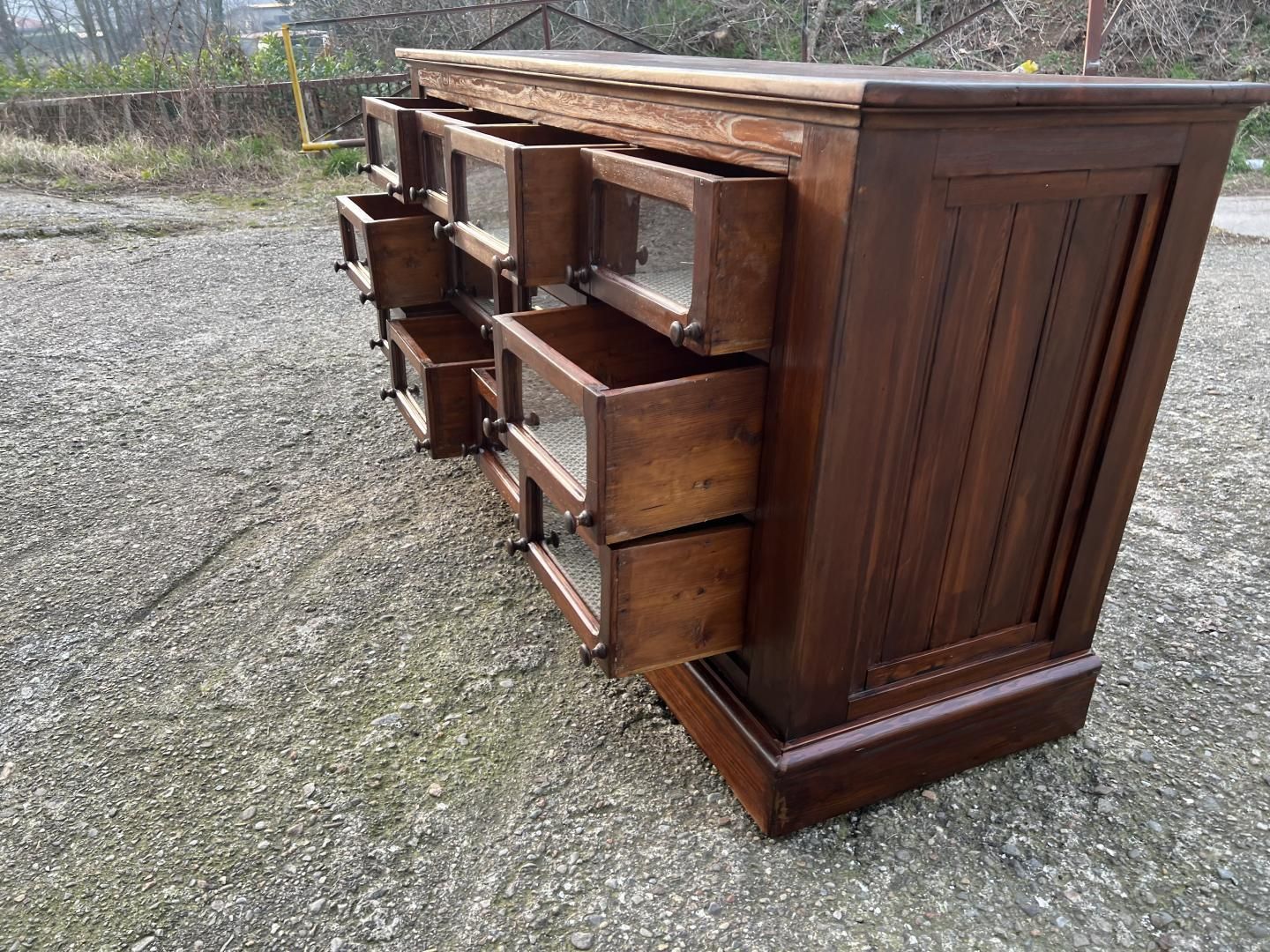 Stupendo mobile pastaia da negozio in larice massiccio con 12 cassetti a vetro, completamente originale e da poco restaurato, proveniente da uno storico negozio di alimentari di Milano.