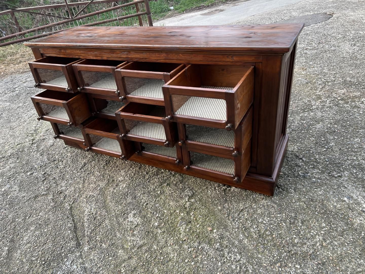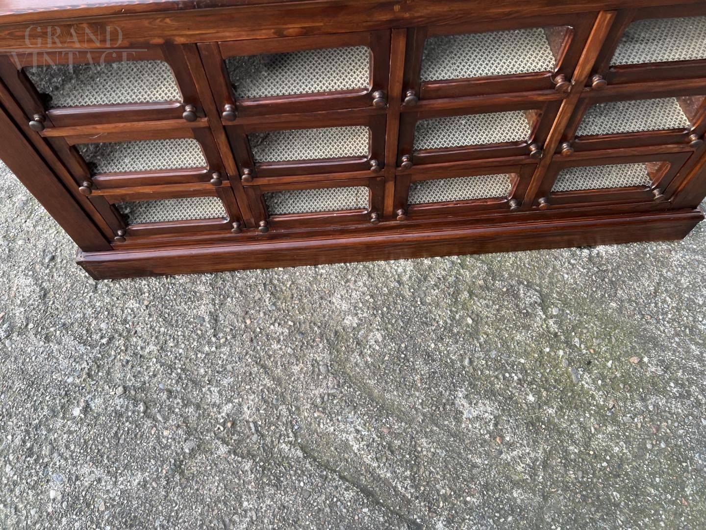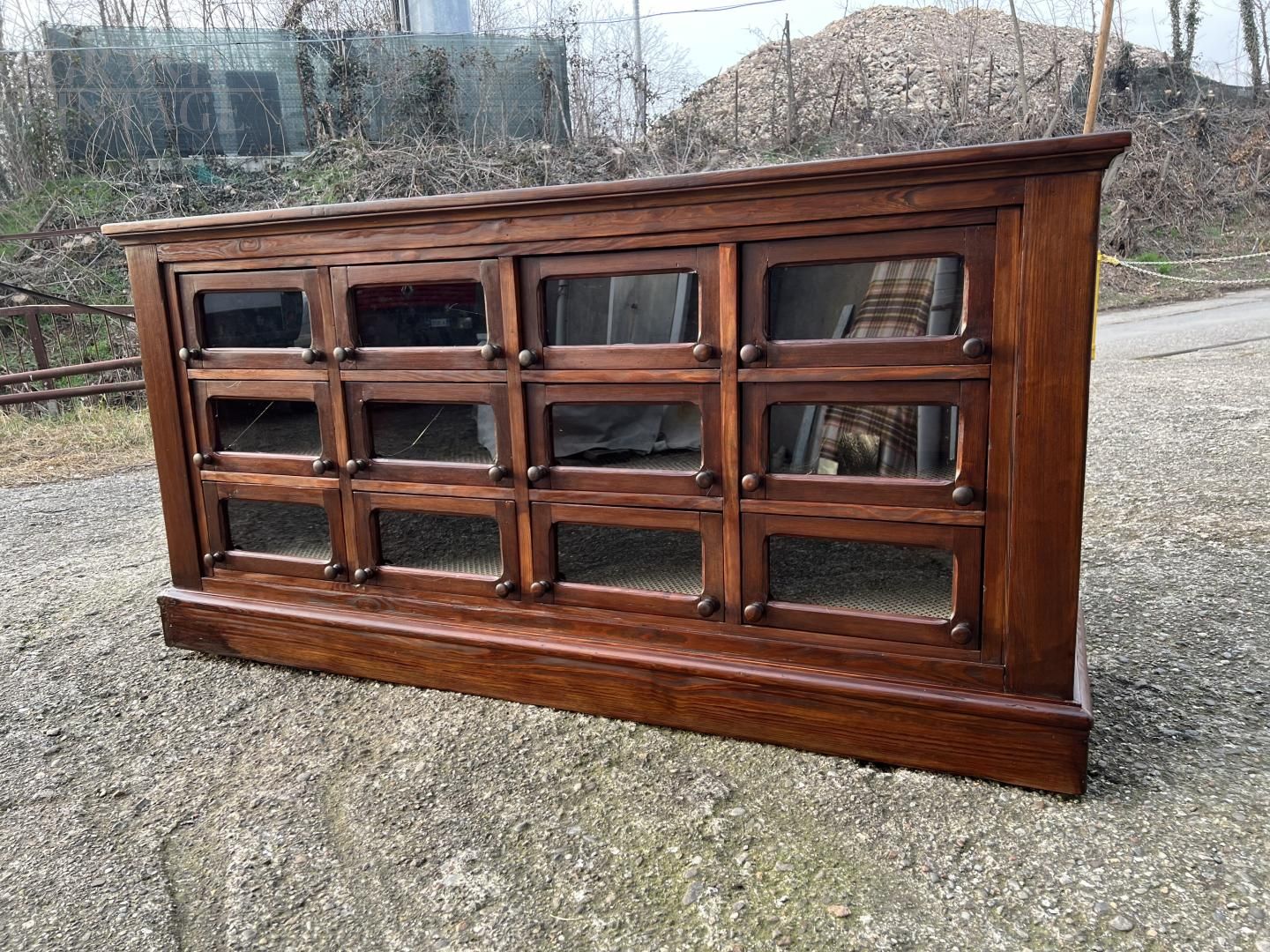 Stupendo mobile pastaia da negozio in larice massiccio con 12 cassetti a vetro, completamente originale e da poco restaurato, proveniente da uno storico negozio di alimentari di Milano.