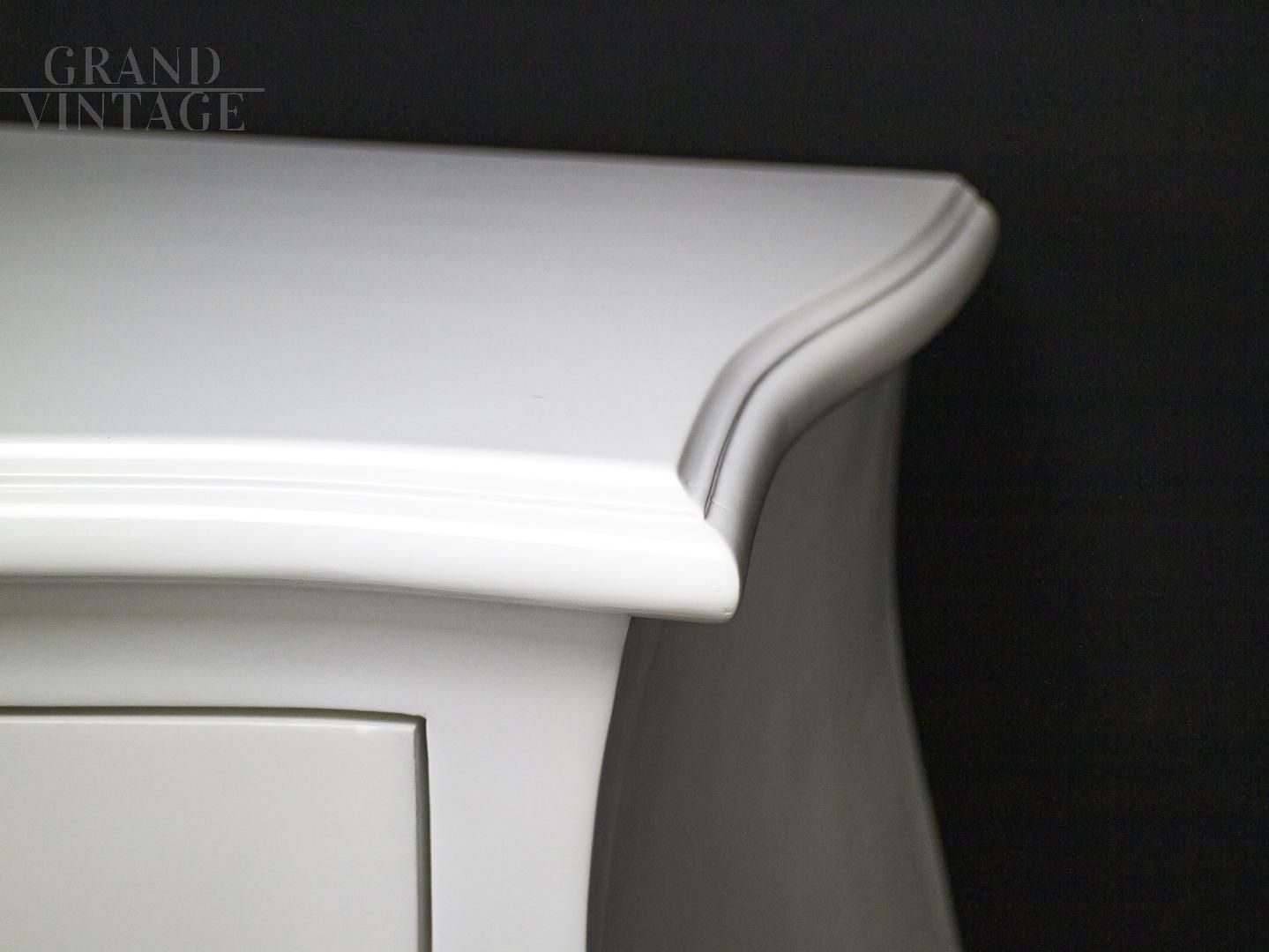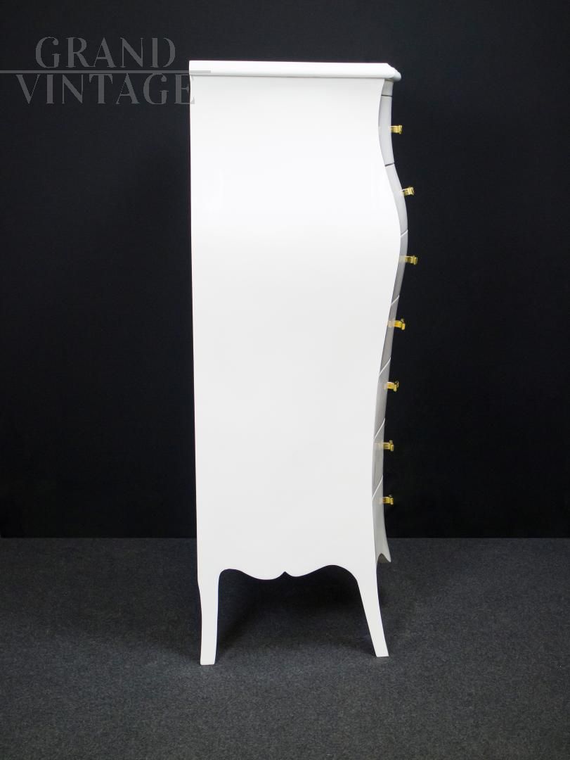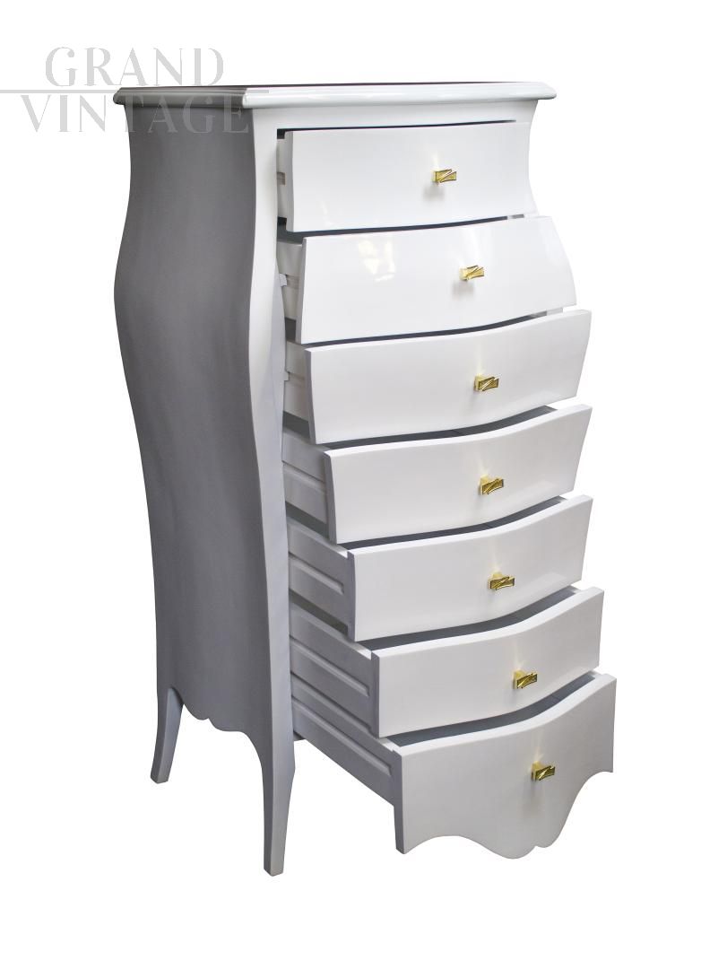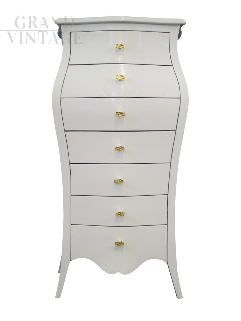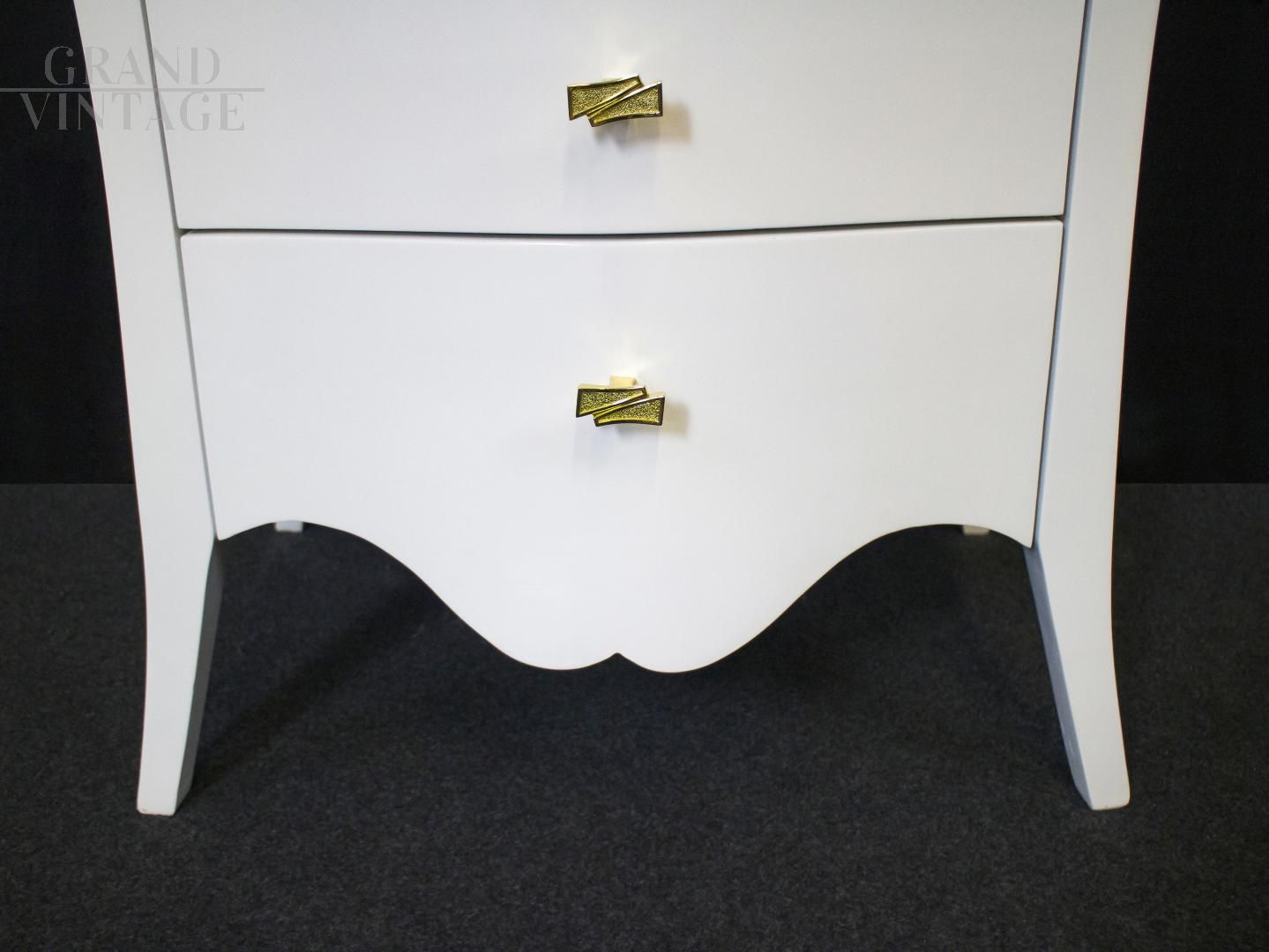 Mobile settimanale stile vintage con bellissima linea sagomata, struttura in legno laccato bianco con sette cassetti dotati di pomoli in ottone dorato.