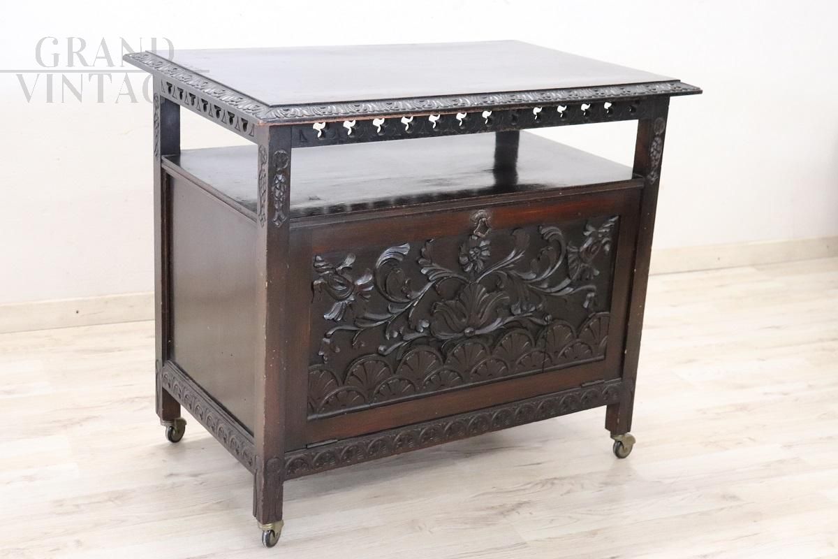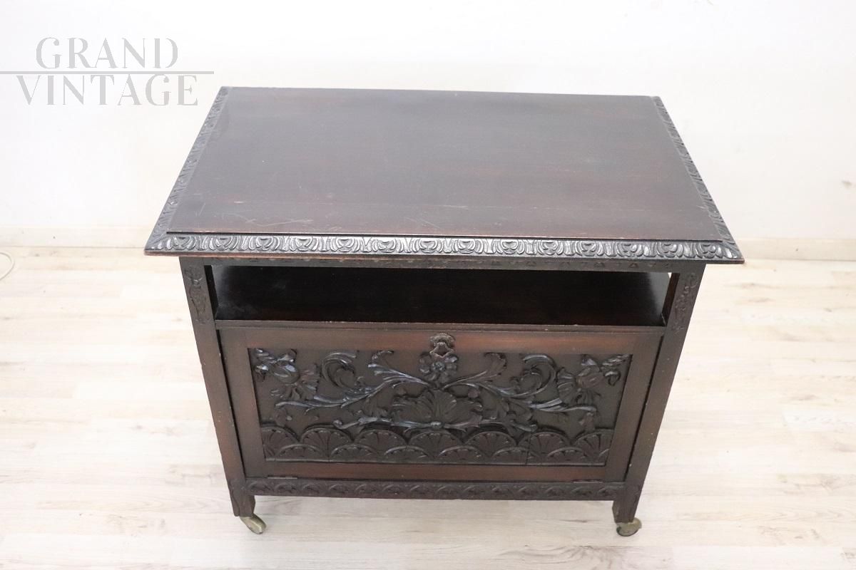 Carrello bar unico dei primi del Novecento, realizzato in Italia durante l'elegante periodo liberty primi '900. Caratterizzato da raffinate decorazioni floreali intagliate con legno di faggio sulle due ante. Il carrello è dotato di ante a ribalta che si aprono per rivelare un pratico spazio interno, ideale per riporre le vostre bevande preferite e gli oggetti da bar. Grazie alle comode ruote, è facile spostarlo mentre servite i vostri ospiti. La parte superiore del carrello funge da superficie funzionale per la preparazione dei vostri cocktail preferiti. La sua decorazione bifacciale consente di posizionarlo al centro della stanza. Ottime condizioni, prezzo trattabile.