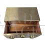 Consolle interamente realizzata a mano, con struttura in legno, ricoperta da una lamina di ottone; un cassetto con eleganti inserti in vetro color ambra .