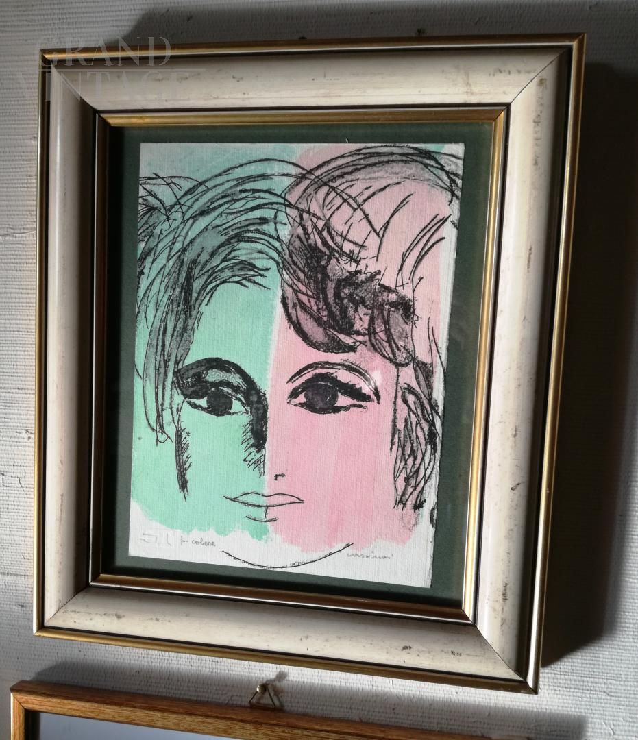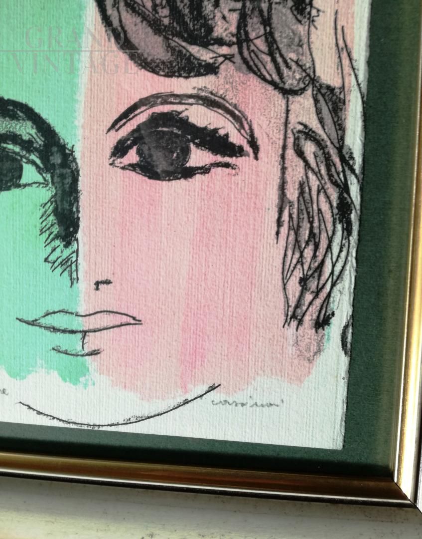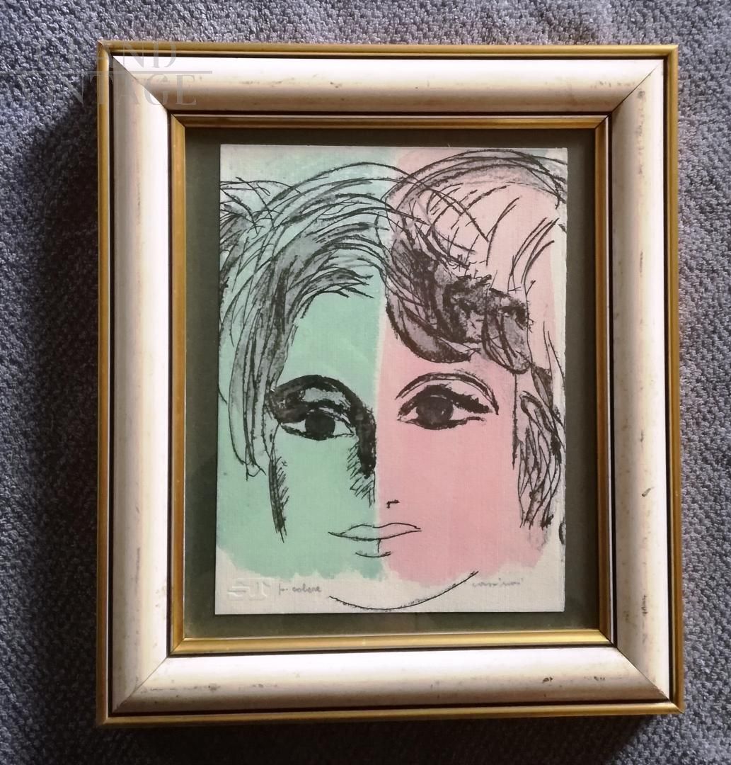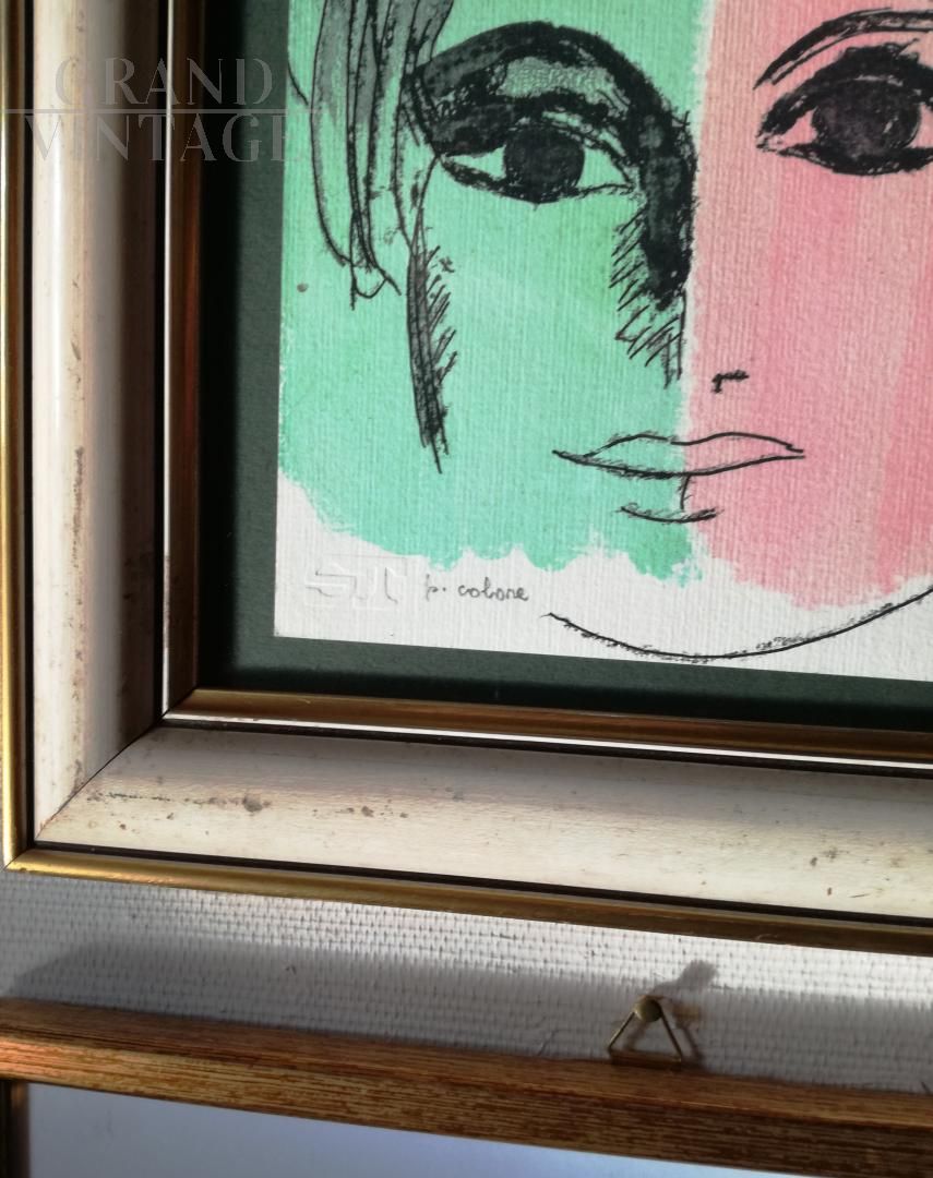 Dipinto litografia a colori con volto di donna di Bruno Cassinari, prova colore, su carta logata ST e con firma a matita in basso a destra. Venduta con cornice.