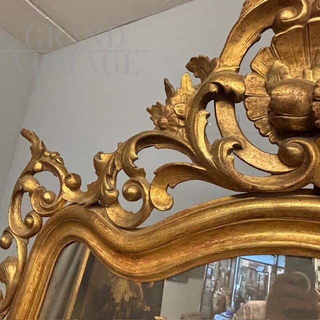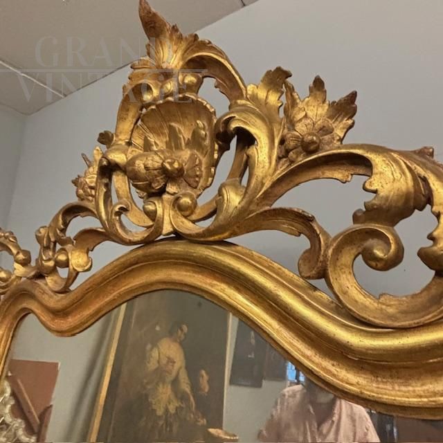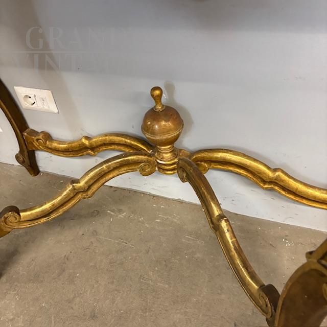 Antica monumentale console con specchio di provenienza romana, epoca Luigi Filippo - 1840, realizzata in legno massello finememente intagliato con foglia oro, il piano è in marmo di Carrara sagomato. Buono stato di conservazione, grande qualità negli intagli realizzati a motivi floreali in ogni sua parte.