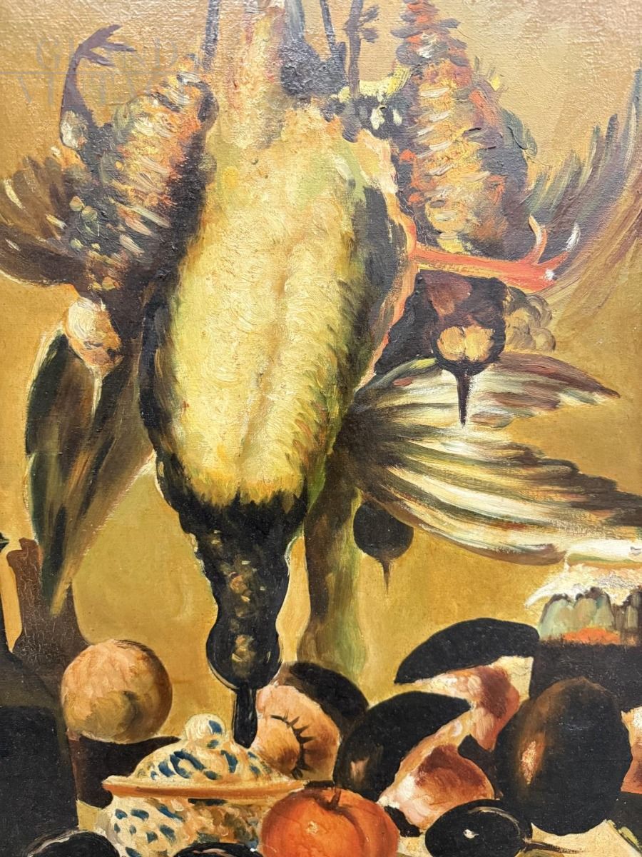 Natura morta con cacciagione, dipinto olio su tela del XX secolo