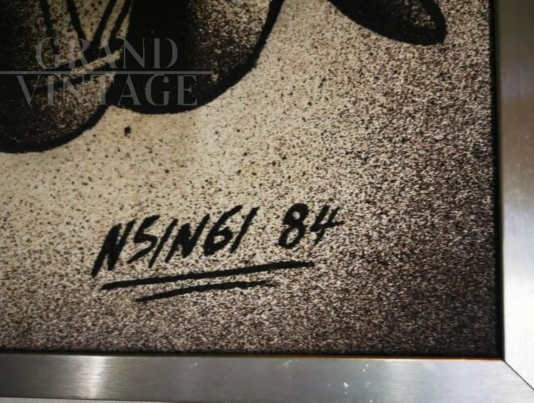 Quadro di Nsingi olio su tavola raffigurante strumenti musicali etnici, Zaire (ora Repubblica Democratica del Congo) 1984.