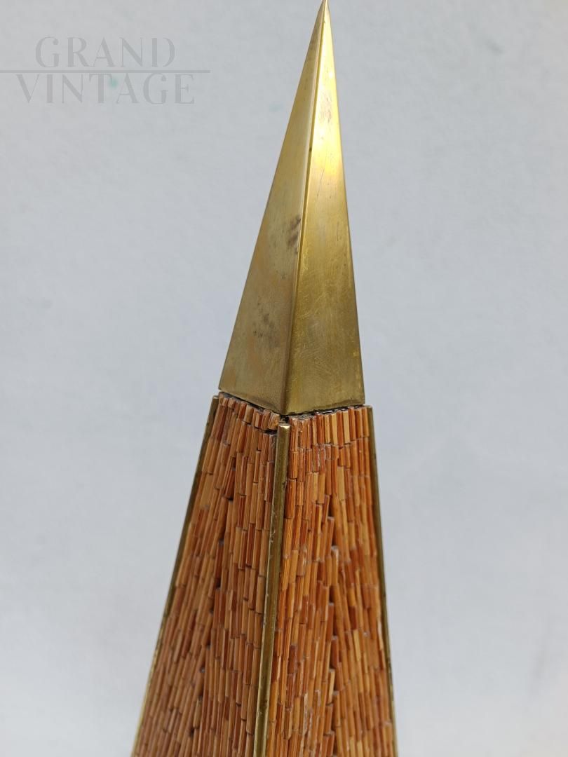 Grande obelisco scultura firmato Tarzia, Firenze anni '60, con anima in legno, rivestimento in midollino e punta e base in metallo dorato.