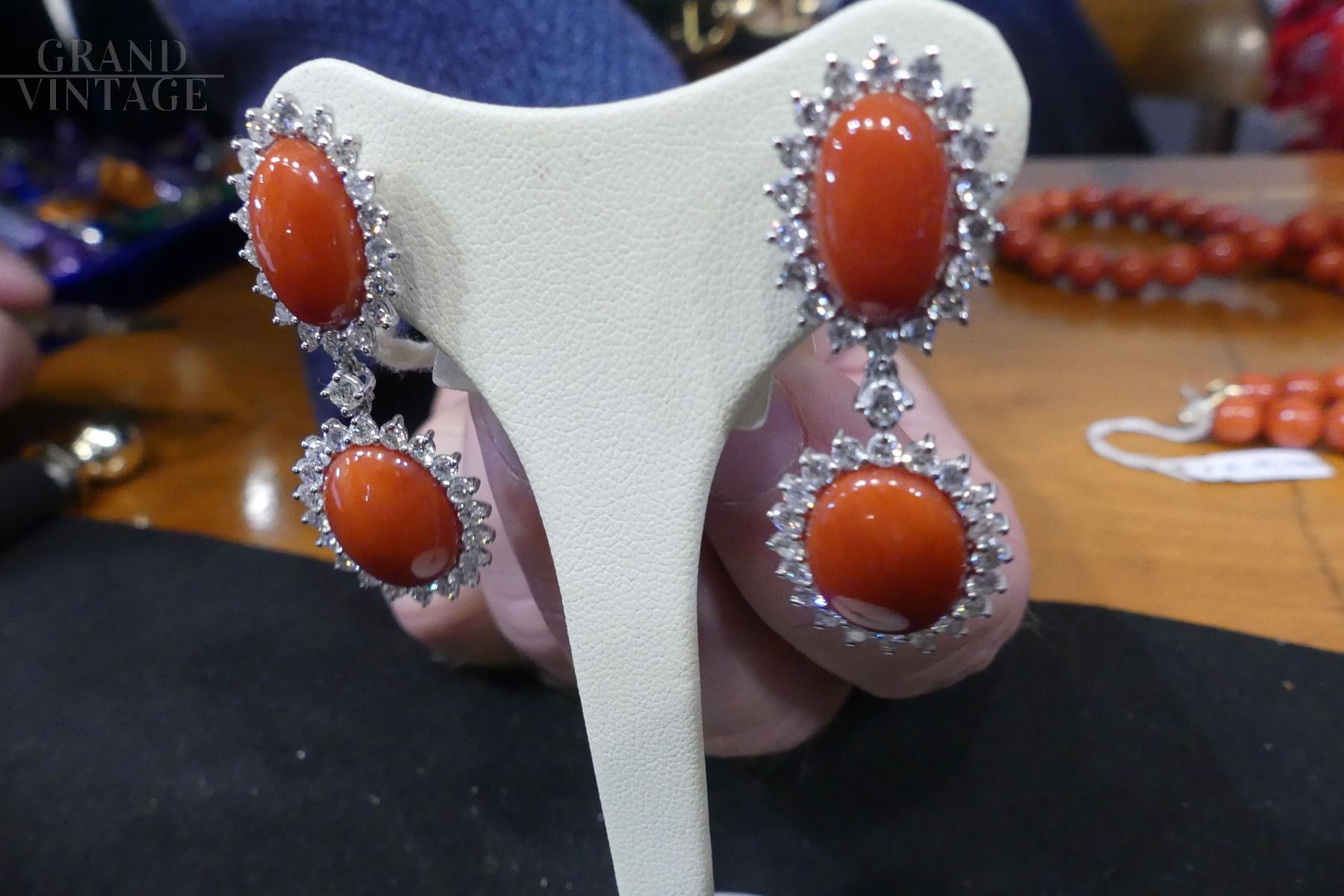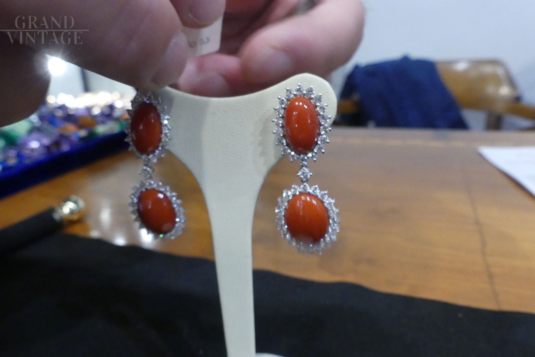 Orecchini a doppia goccia in oro bianco con diamanti e corallo Sardegna