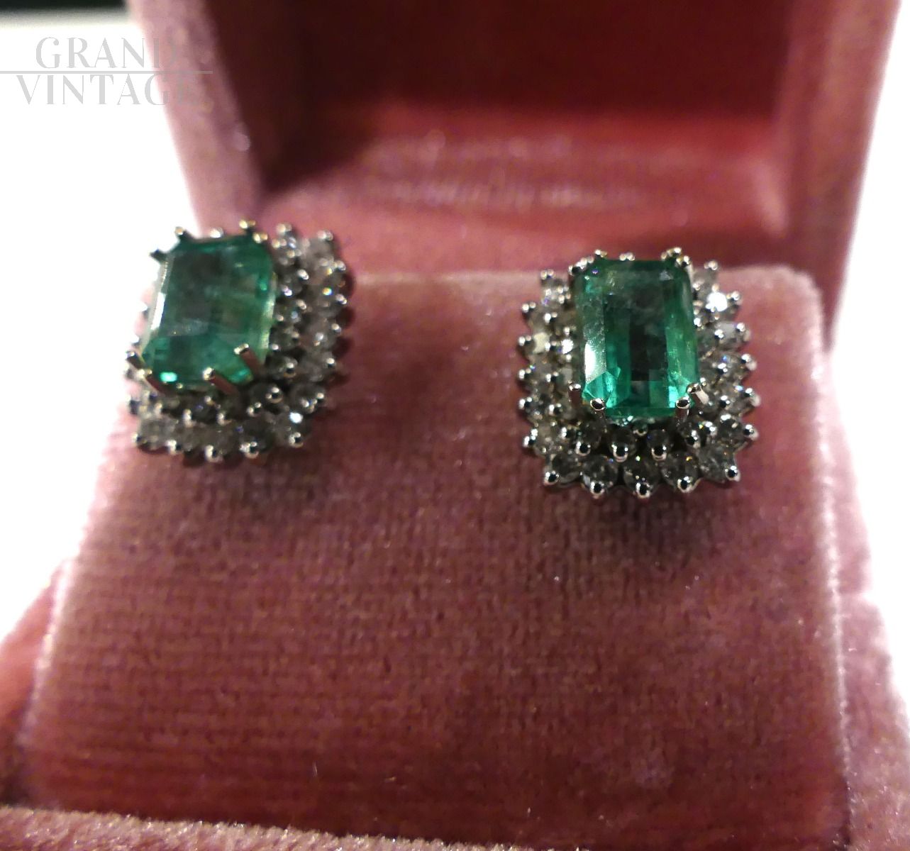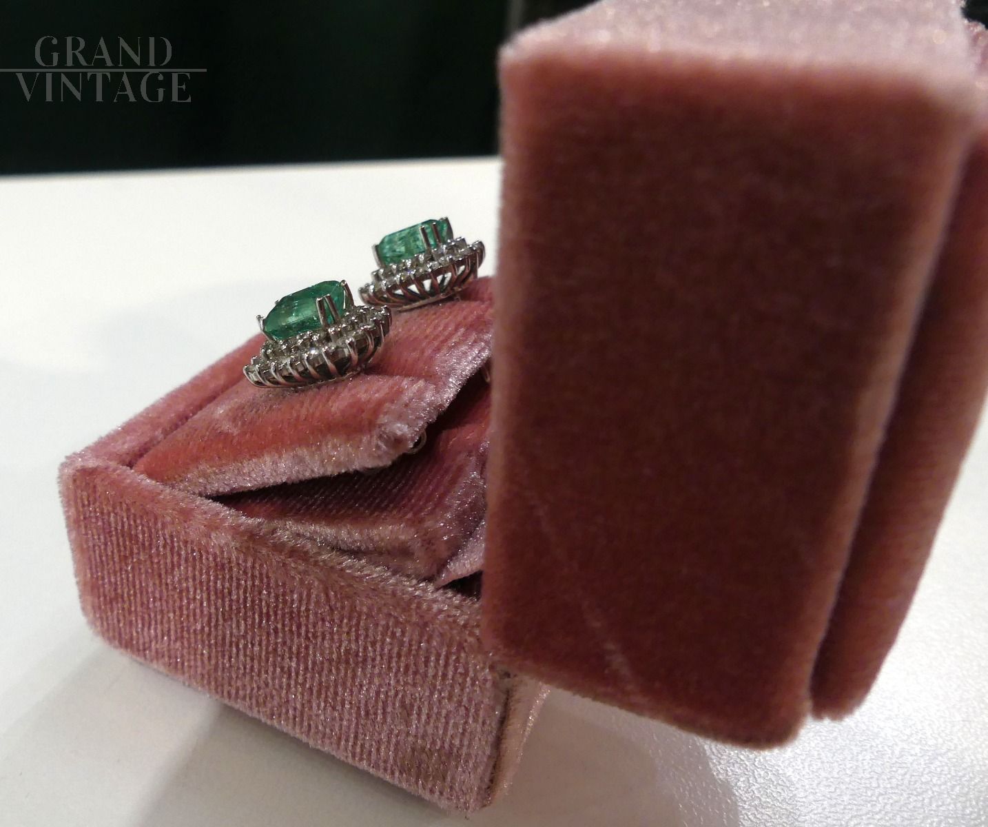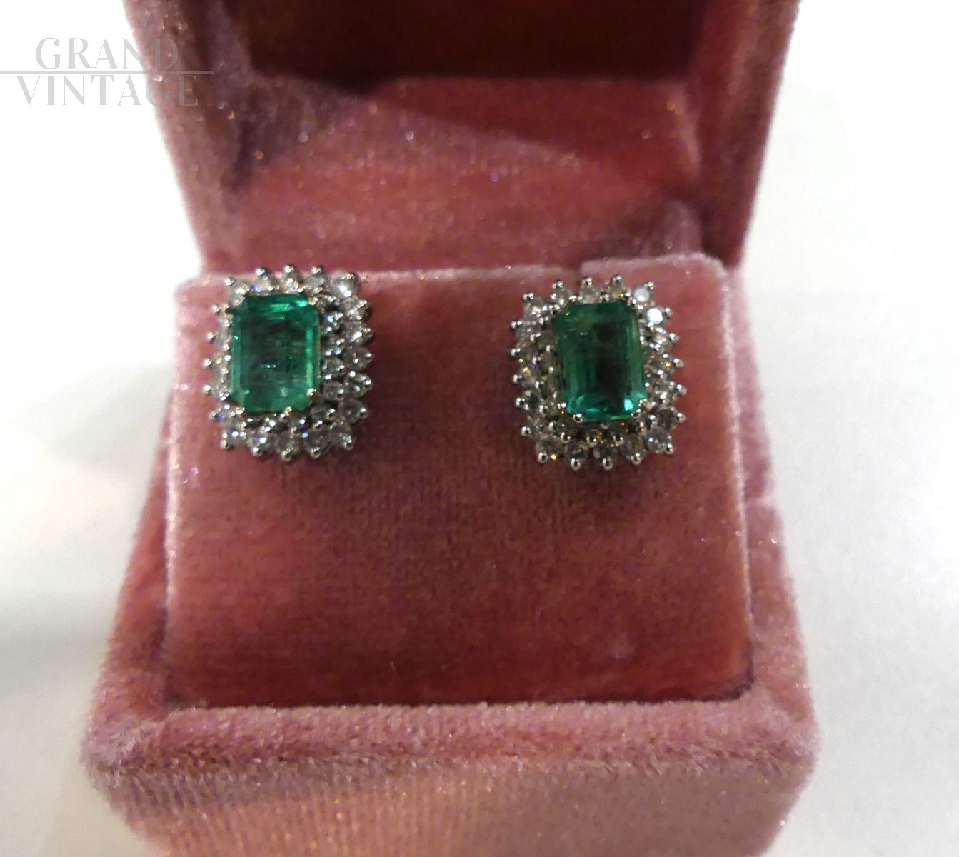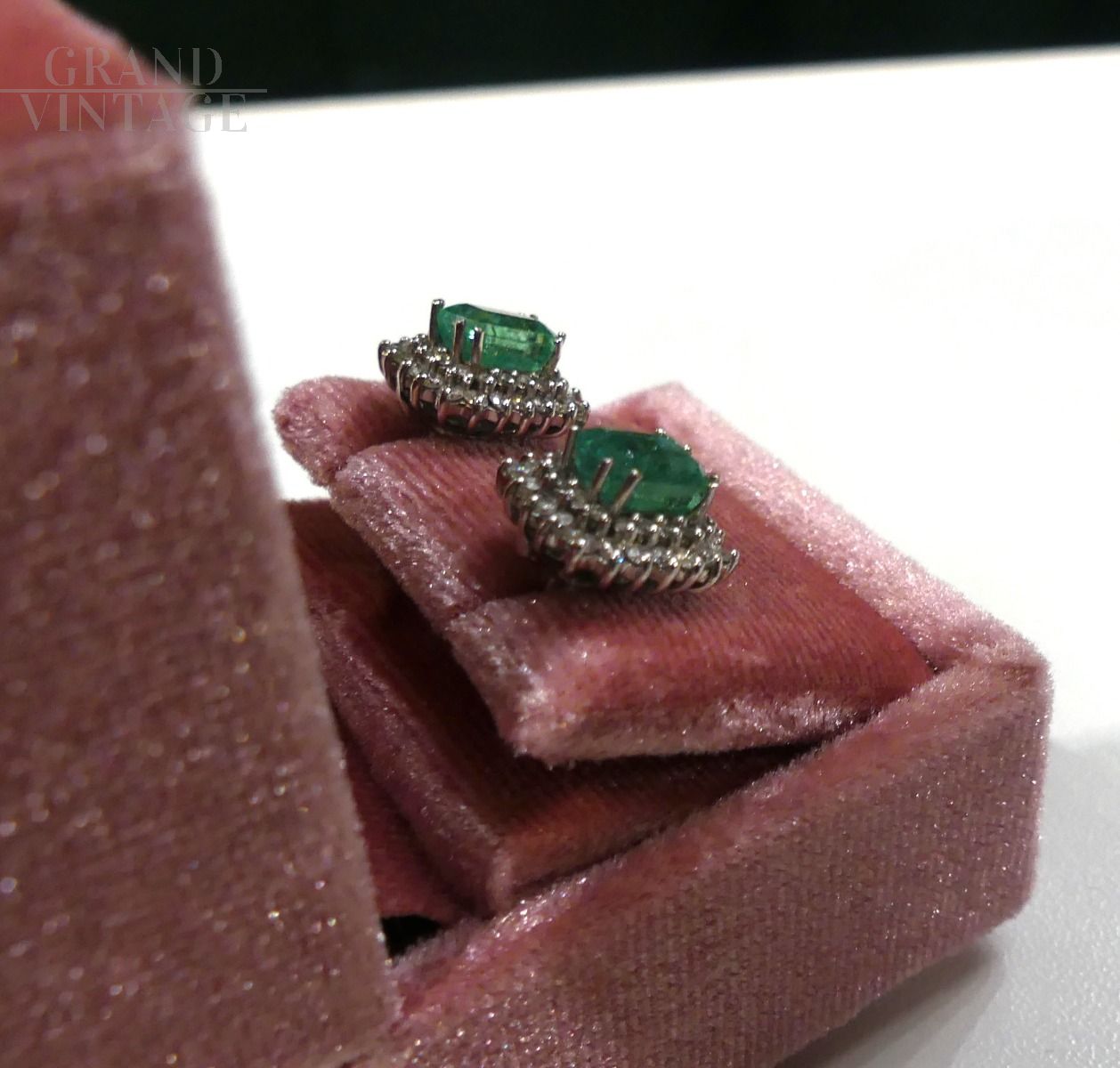 Orecchini in oro bianco 18 kt con smeraldi colombiani di carati 2.42 e diamanti di carati 0.85, di nuova produzione. Altezza 1 cm, larghezza 0.8 cm.
