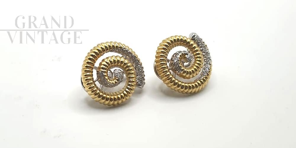 Orecchini vintage a spirale in oro giallo e bianco con diamantini