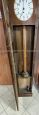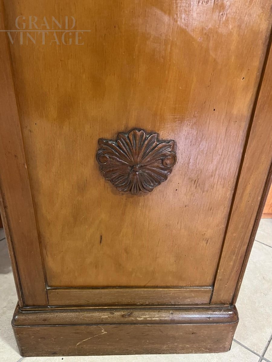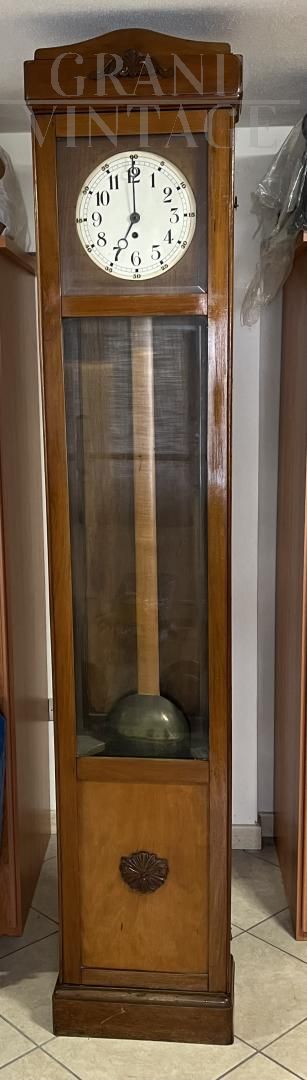Grande ed elegante orologio a pendolo a colonna anni '40 realizzato artigianalmente in noce. L'orologio presenta una colonna decorata con intagli, anta in vetro, quadrante a numeri arabi e pendolo in metallo. L’orologio, nonostante sia in buone condizioni e munito di chiave, non è funzionante e necessita di ricalibratura.
