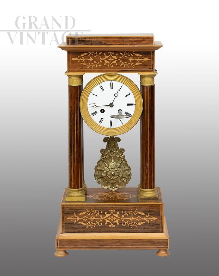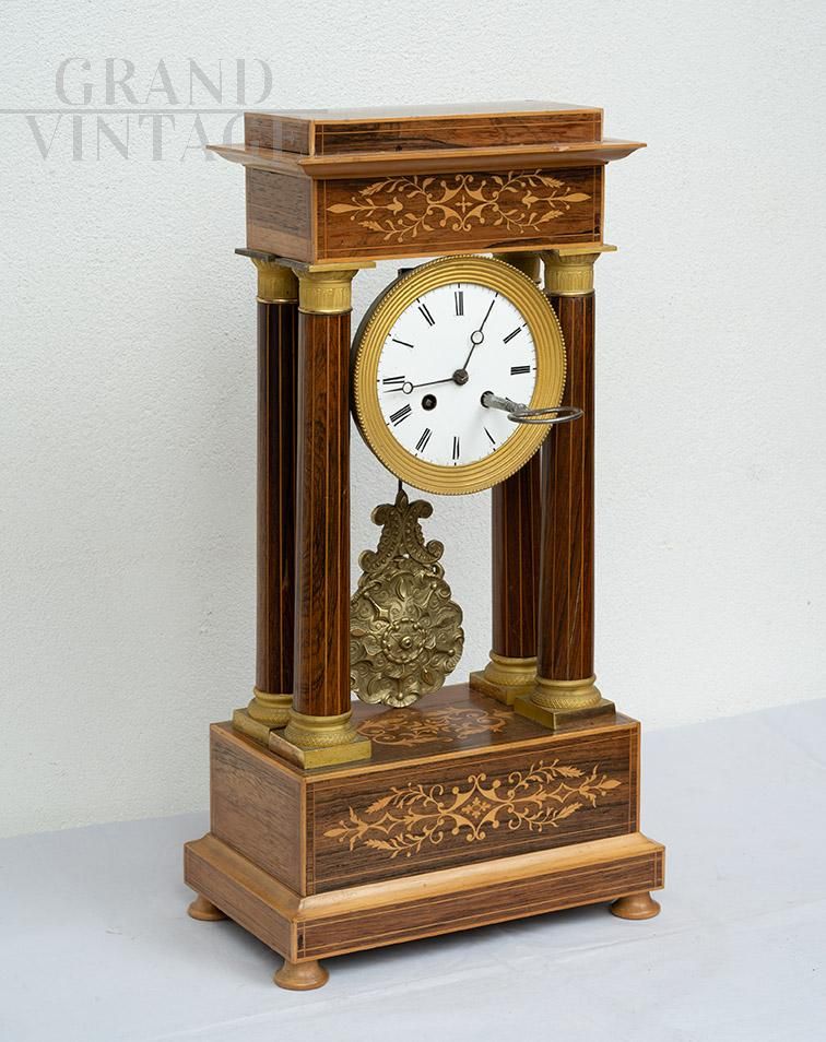 Orologio antico Carlo X in legni esotici pregiati appartenente agli inizi del XIX secolo. Il prospetto frontale è caratterizzato da colonne filettate con base e capitello in bronzo dorato sormontato da un architrave intarsiato. Il quadrante è smaltato ed è contornato da una guarnitura in bronzo dorato. La base anche essa intarsiata in legno di acero con motivi a racemi poggia su cuscinetti in legno. P.S. Chiave e pendolo originale.