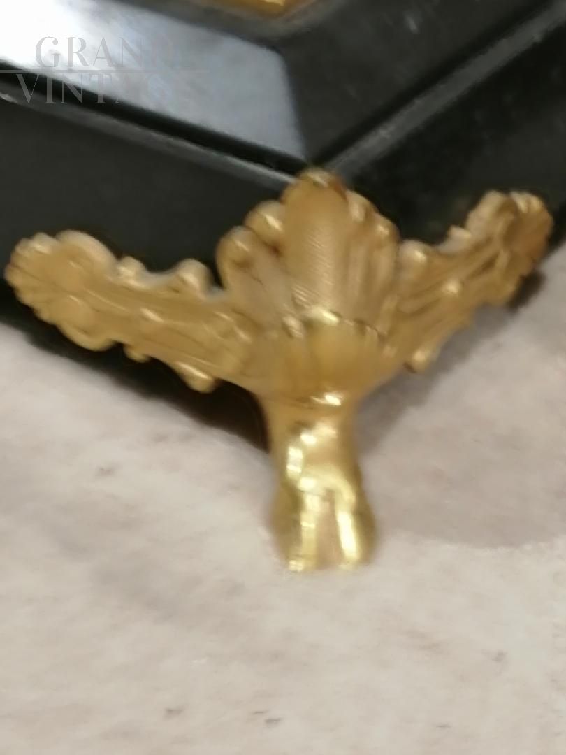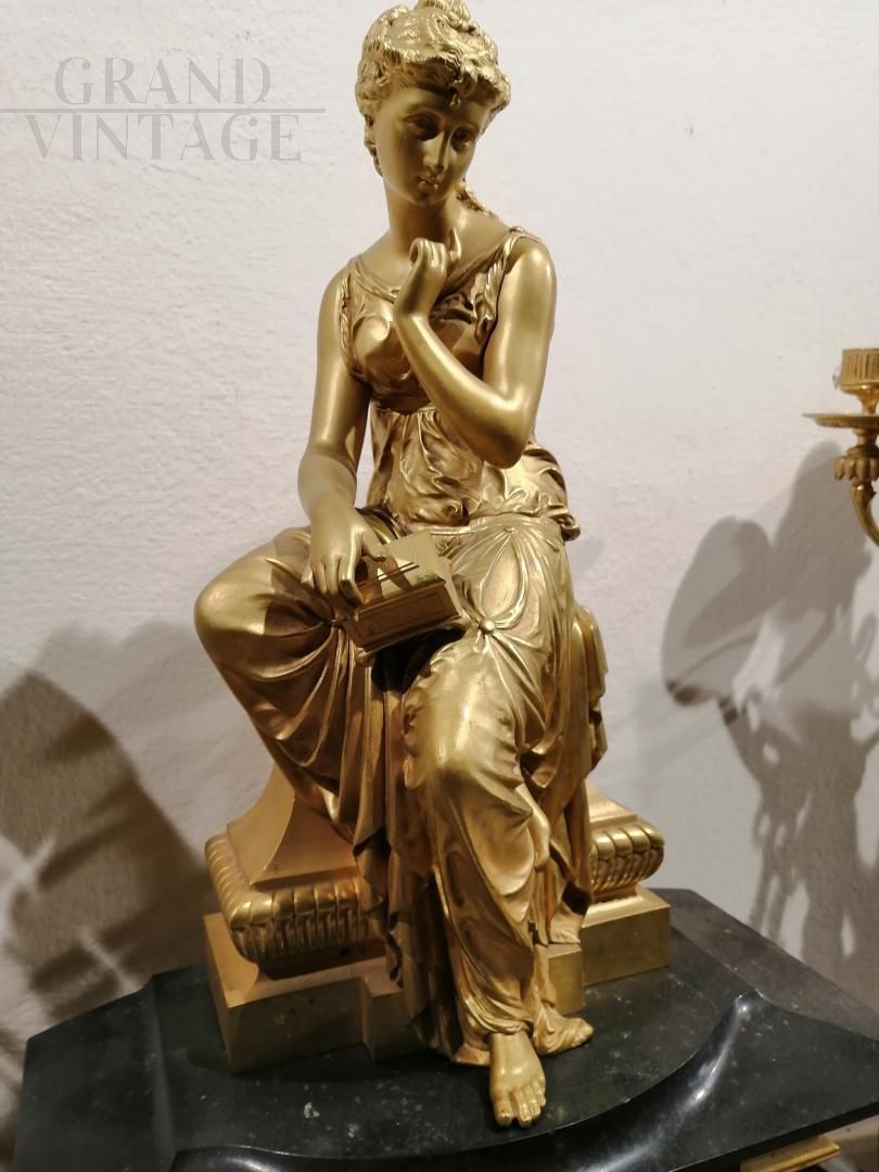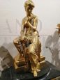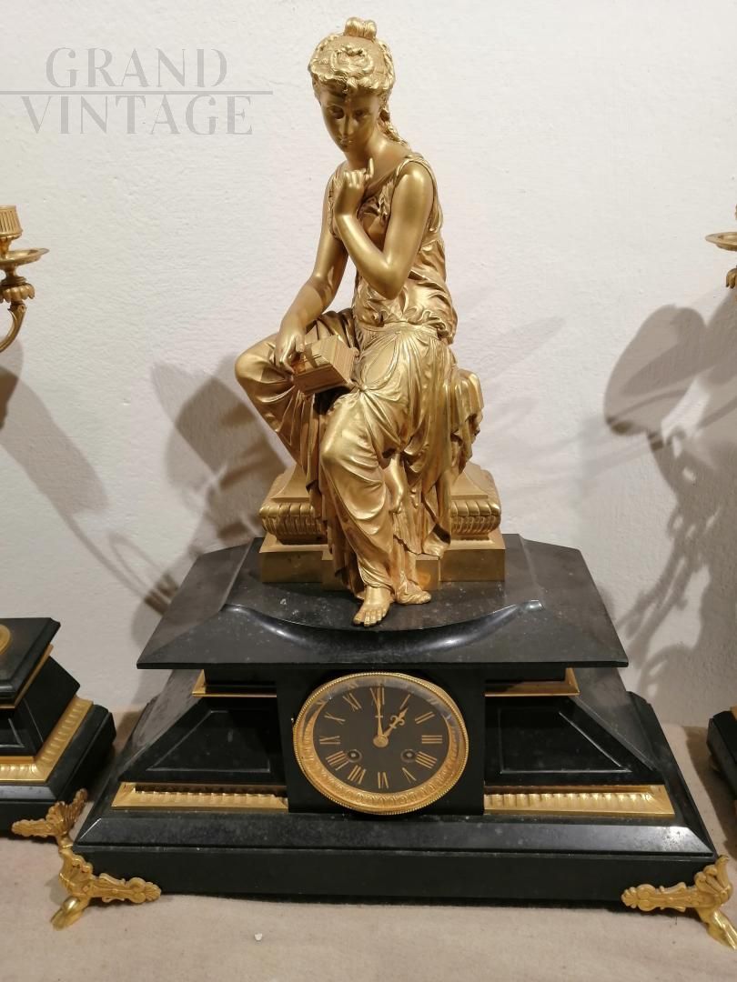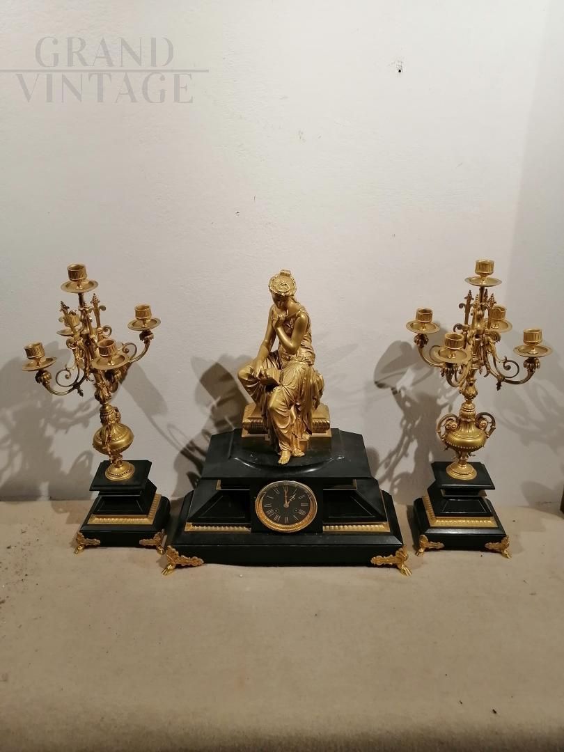 Trittico composto da orologio e candelabri in bronzo dorato. Francia, seconda metà dell'800.