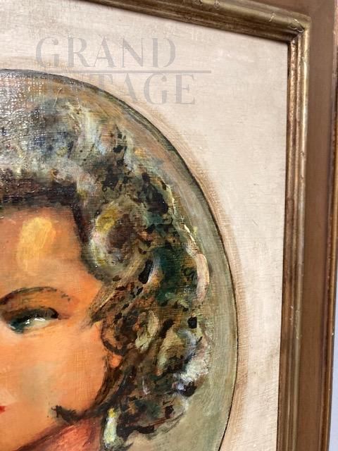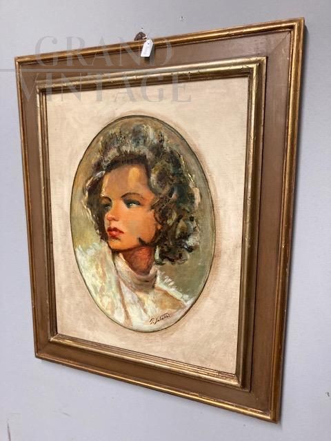 Dipinto contemporaneo con volto di donna, olio su cartoncino firmato P. Salatini, anni '50, in cornice laccata.