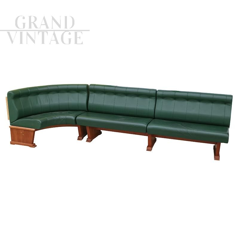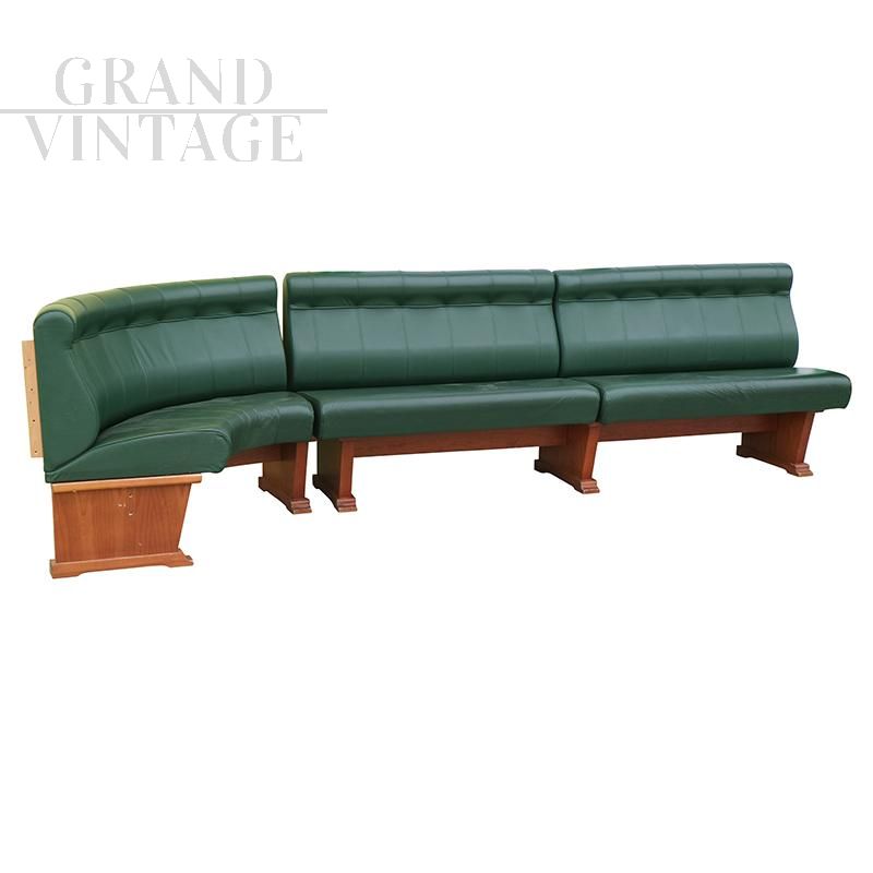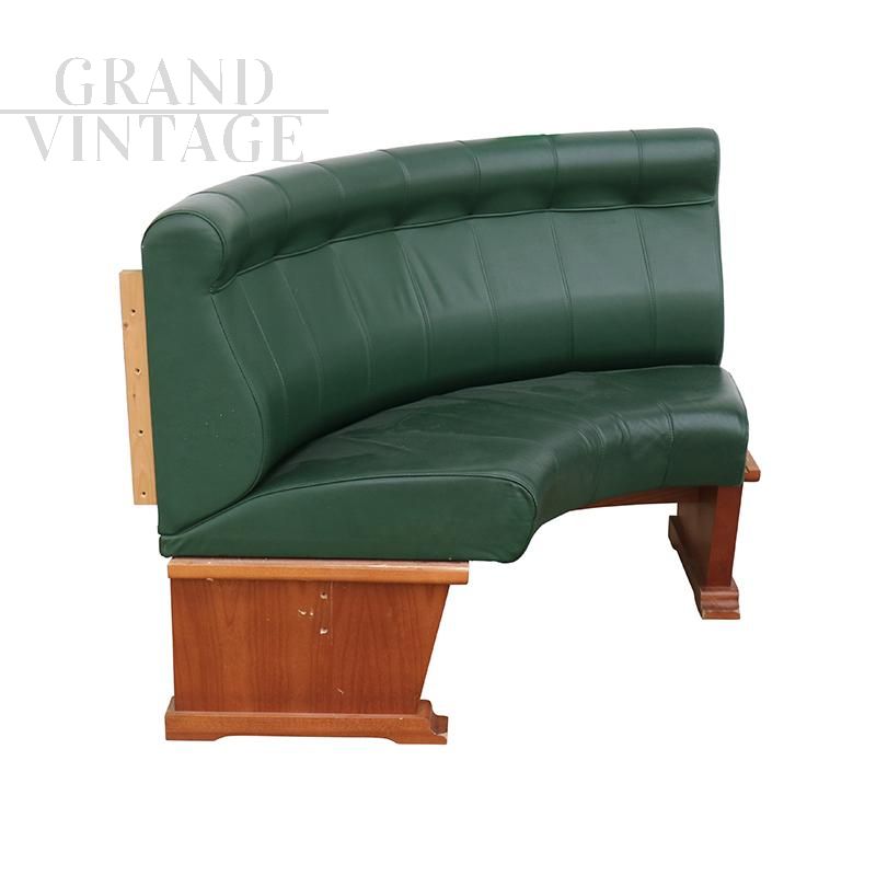 Panca o divanetto modulare vintage angolare circolare da parete in pelle verde con struttura in legno.