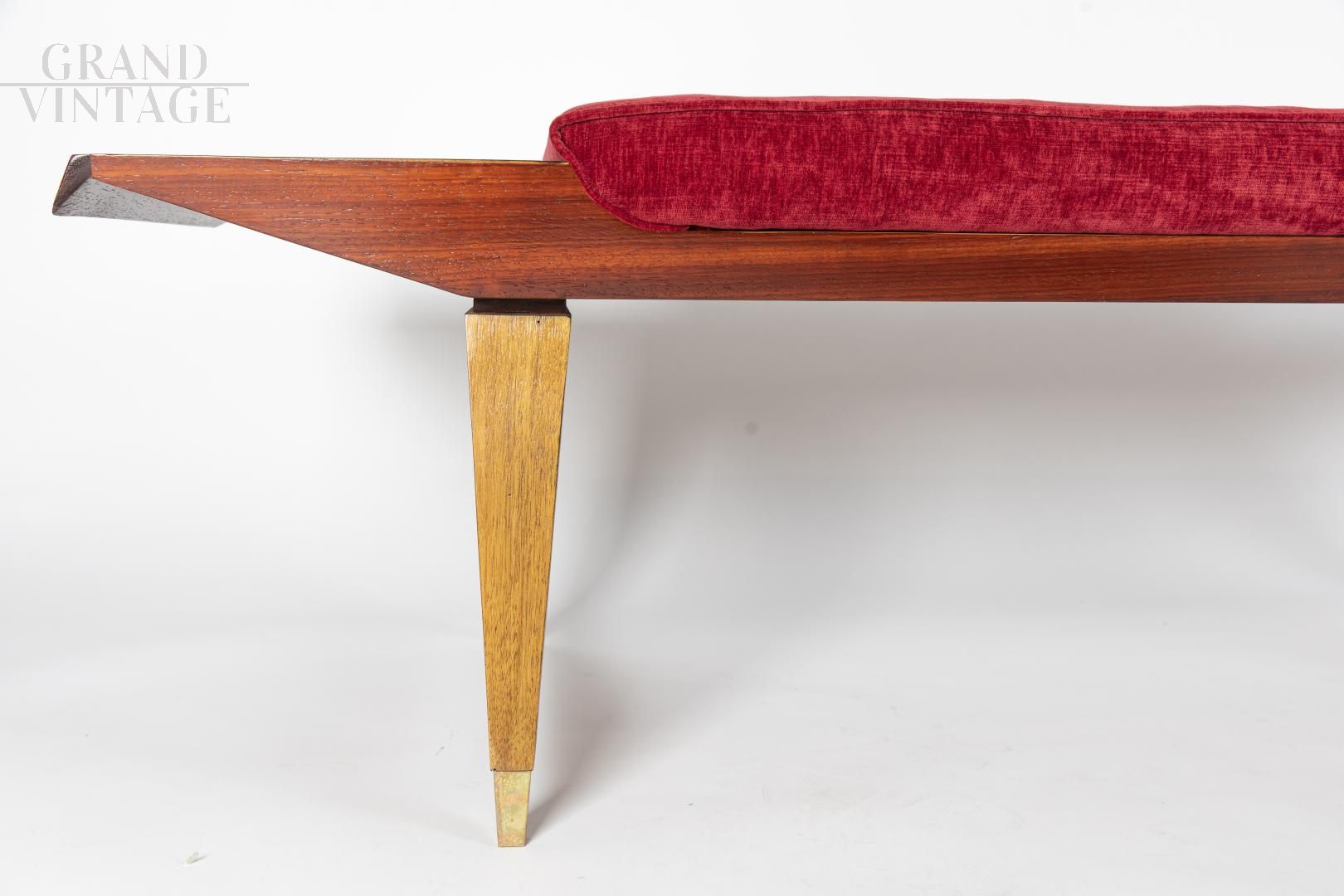 Panca vintage italiana Mid-Century in radica con rivestimento in velluto bordeaux, mogano e noce canaletto, e con piedini in ottone.